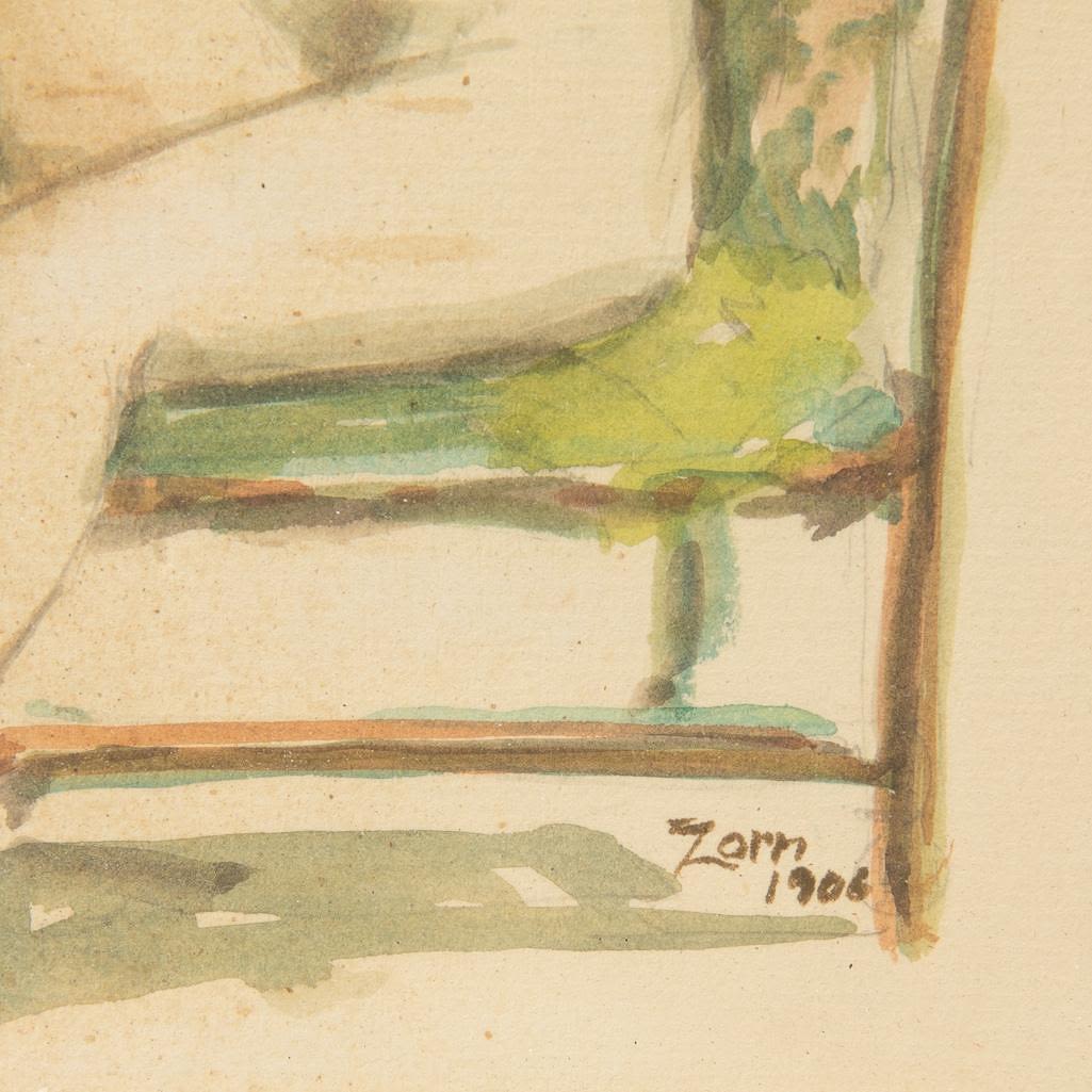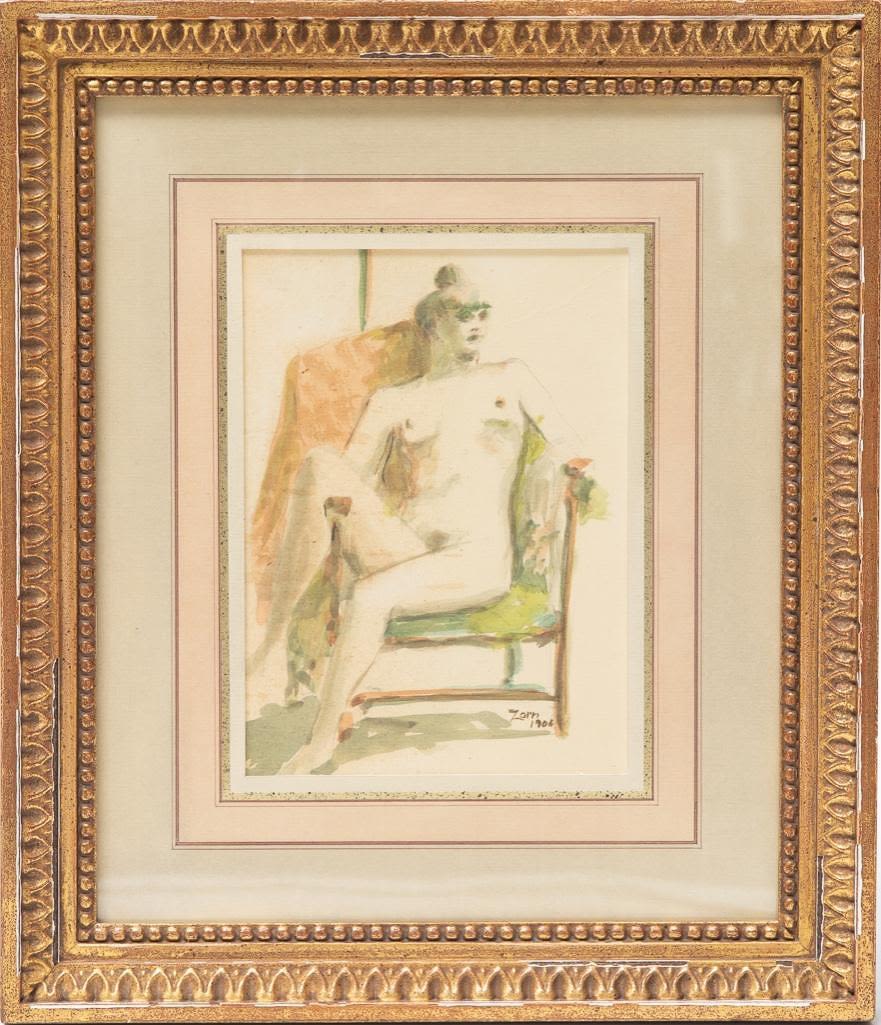 Anders Zorn Watercolor/gouache of nude woman, signed Zorn. Watercolor: 5.5" x 8". Frame: 13" x 15" Anders Leonard Zorn was one of Sweden’s foremost artists. He obtained international success as a painter, sculptor, and etcher. Among Zorn’s portrait subjects were King Oscar II of Sweden, and three American Presidents, Grover Cleveland, William H. Taft, and Theodore Roosevelt