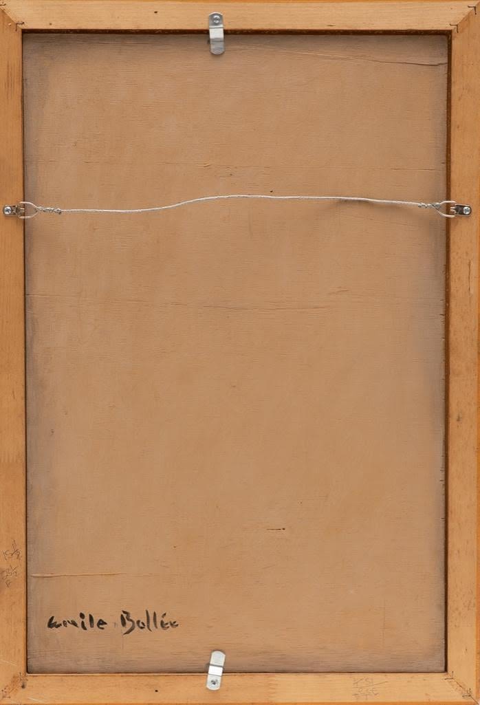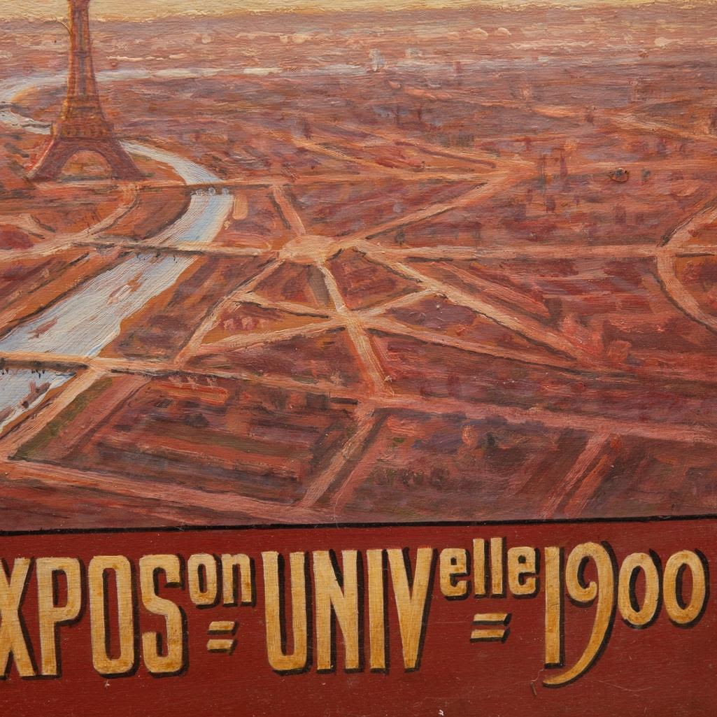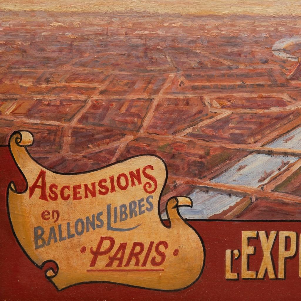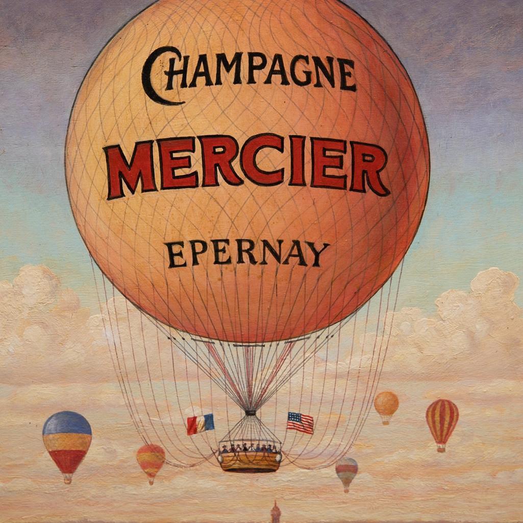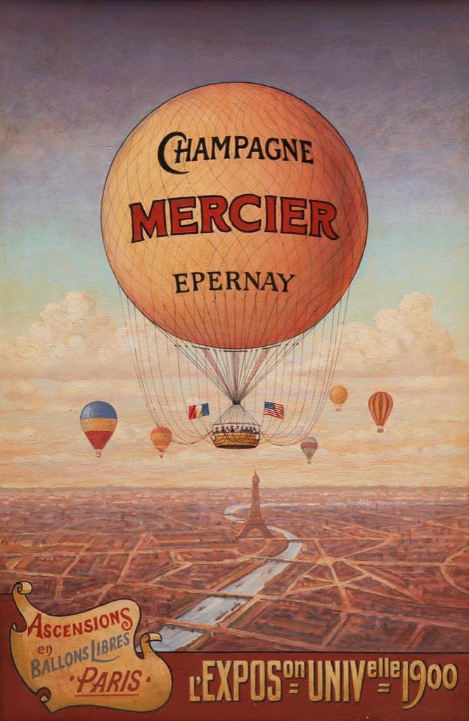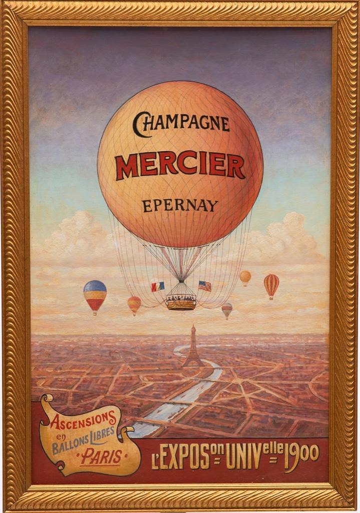 A colorful vintage oil painting depicting a large air balloon over Paris with advertising CHAMPAGNE MERCIER EPERNAY from World’s Exposition in 1900. Signed Emile Bollee verso, probably done after an antique poster. 23.5 x 15.5 inches, framed 26 x 18.