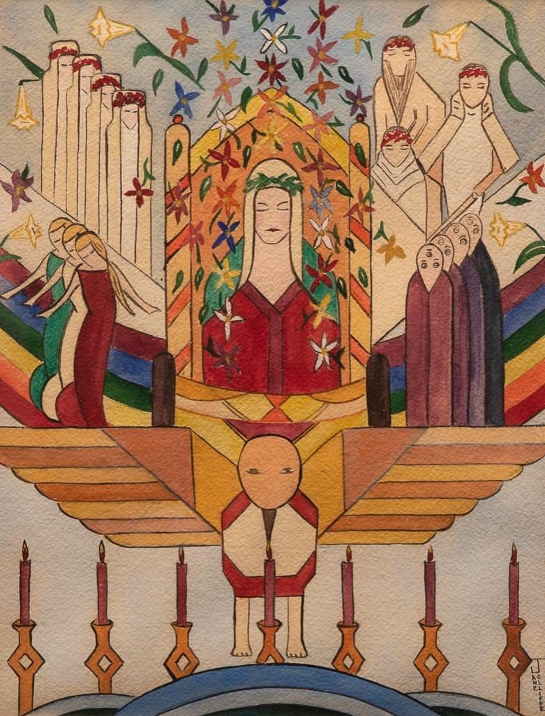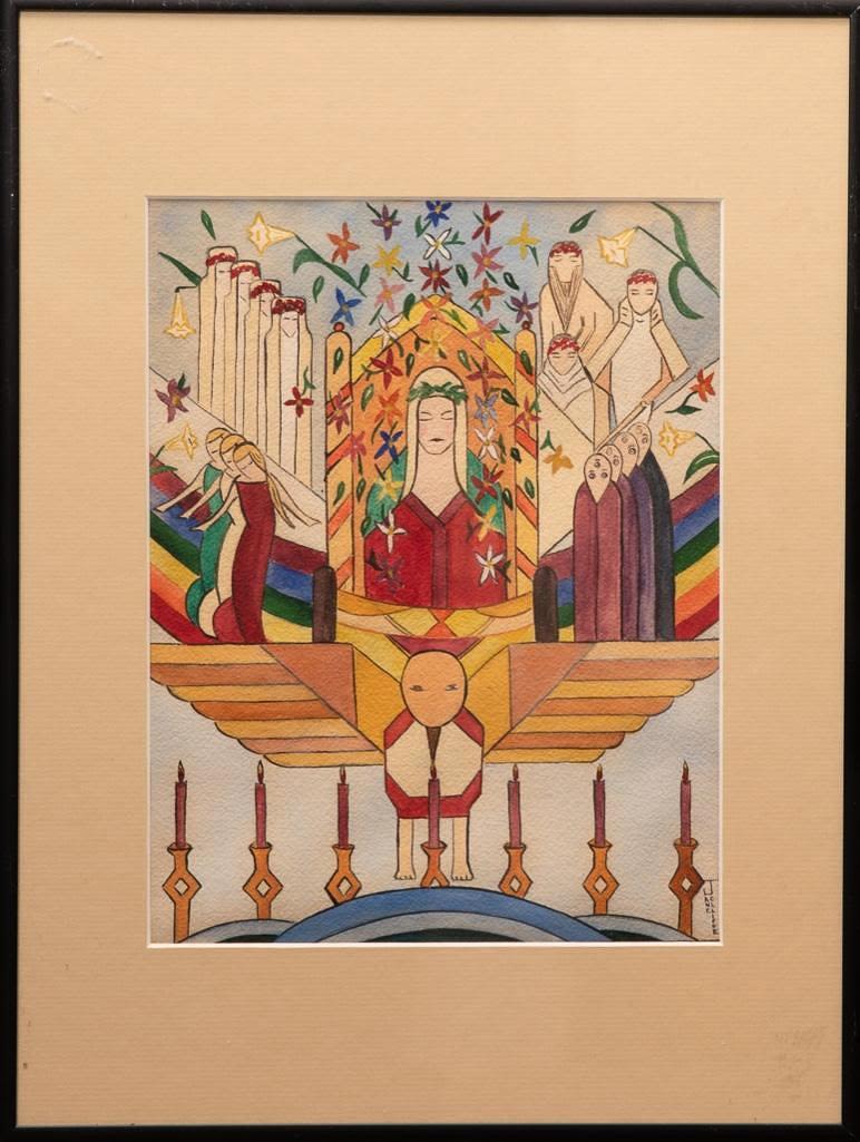 Art Deco watercolor scene from Dante’s Divine Comedy. signed. 12" x 16" framed 8" x 10.5" Framed approx.