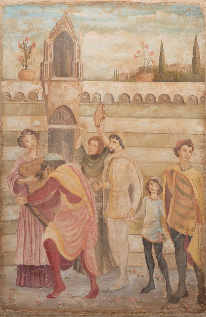 Large French classical fresco technique painting depicting a court celebration with dancing Measure 59 in h x 39 in W Approx. In Fair Condition. Some intentional aging visible for more classical fresco look. early 20th century