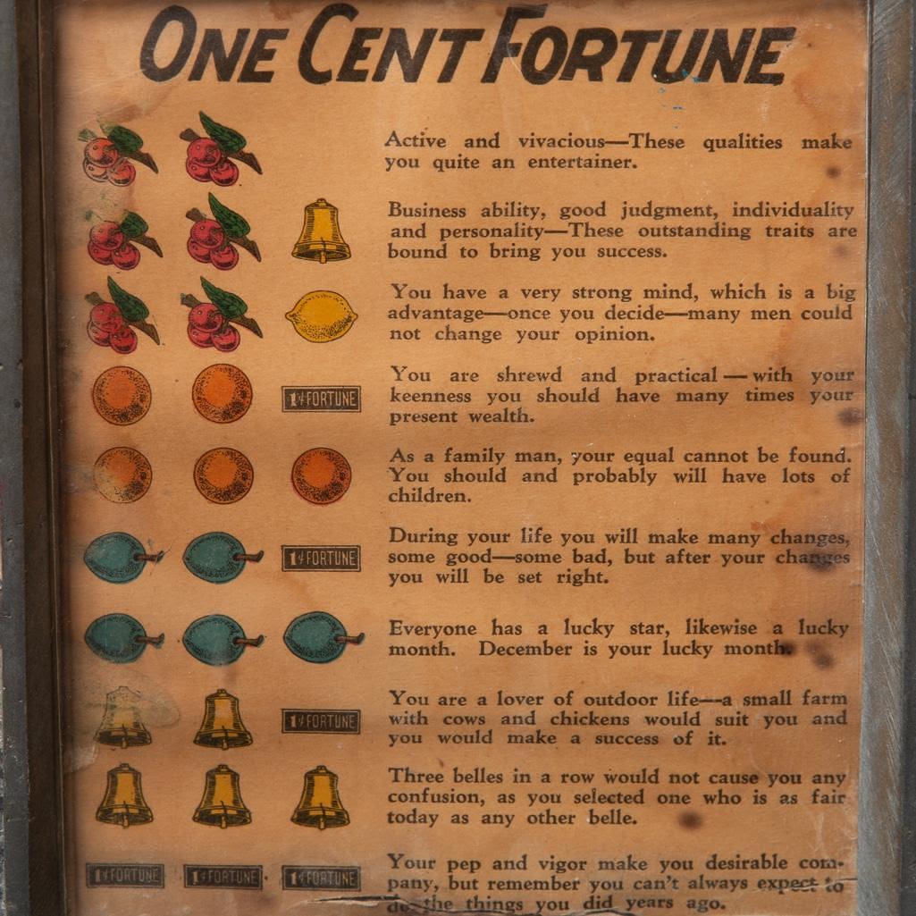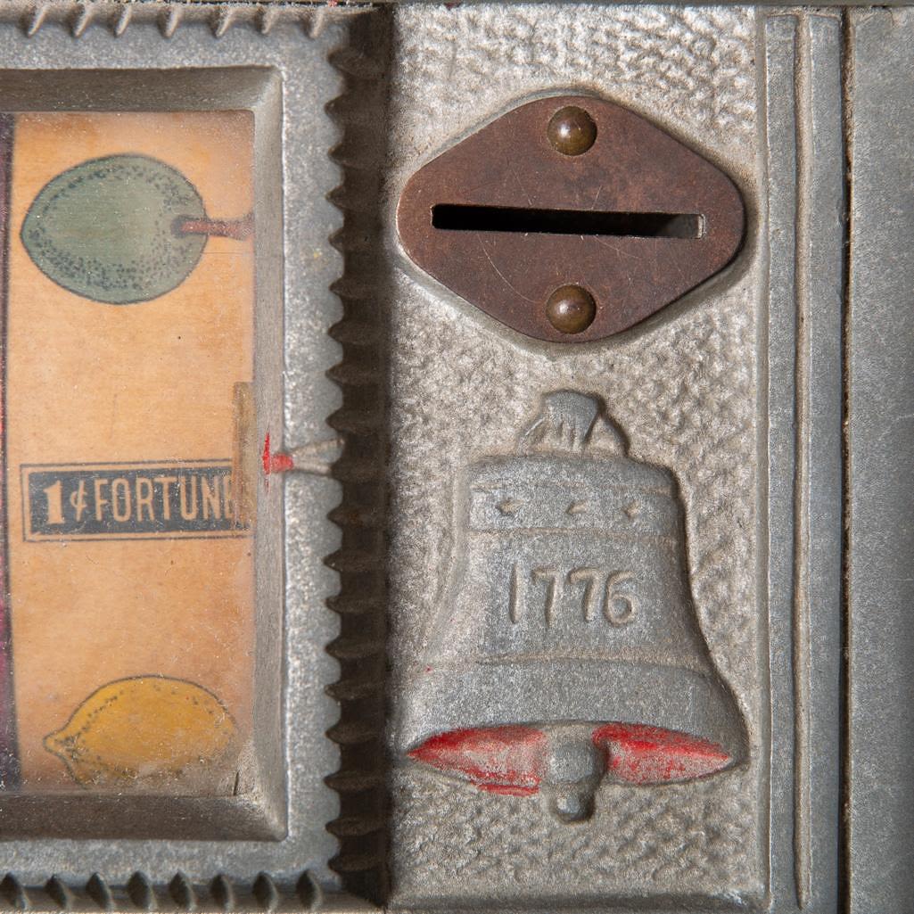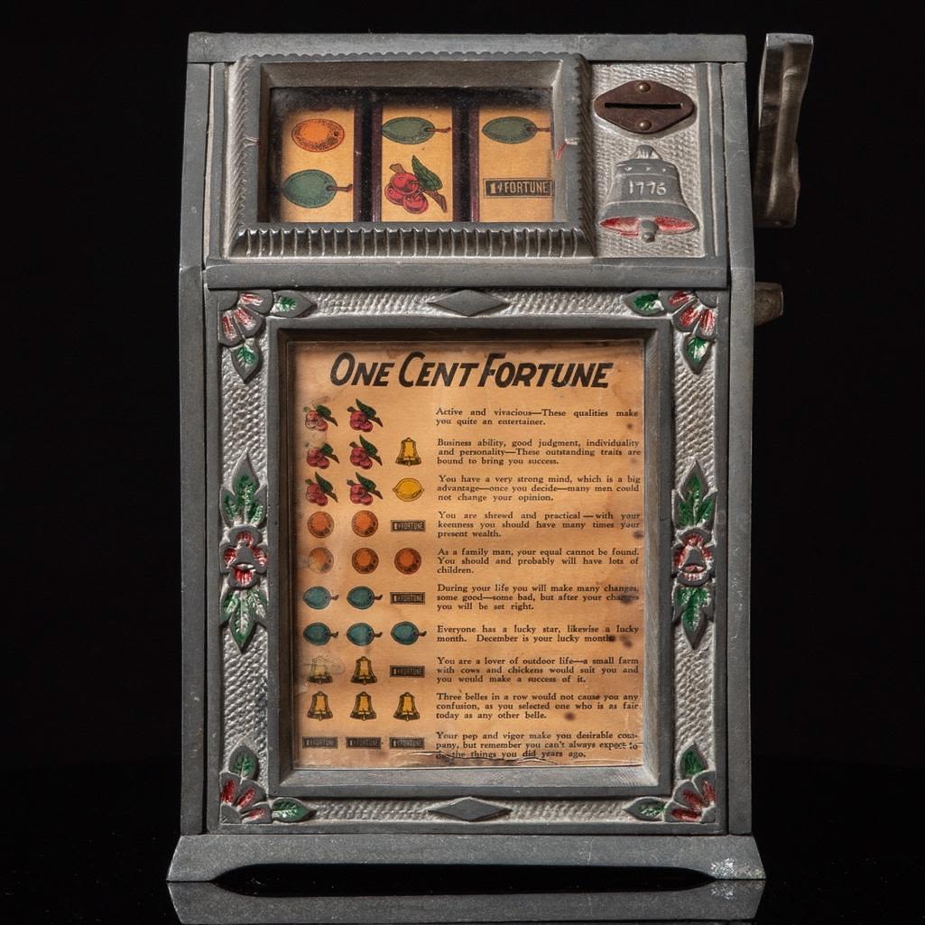 Puritan Baby Bell One Cent Fortune slot machine. Circa 1929-1930. Dimensions: 7" Width x 8" Depth x 10" Height. Manufactured by the Chicago Mint Co. Original one cent fortune card.