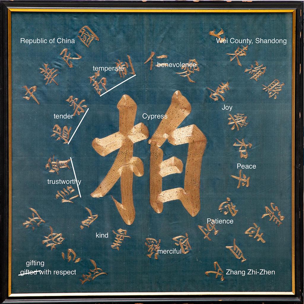 chinese silk work. ..Wei, shandong is an old name of Weifang city in Shandong, China. Cypress was a symbol of nobel attitude im chinese literature. 21.5" x 21.5" Approx