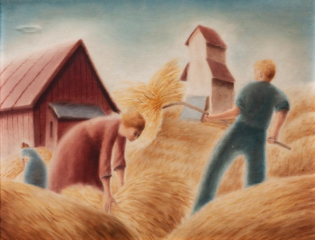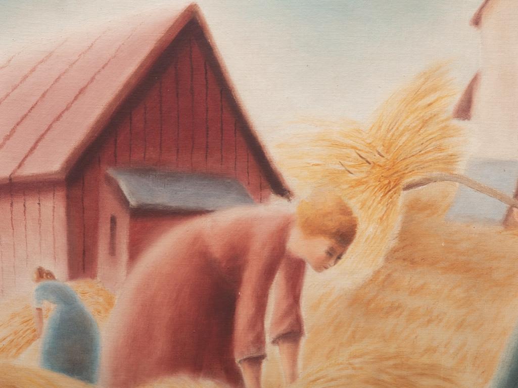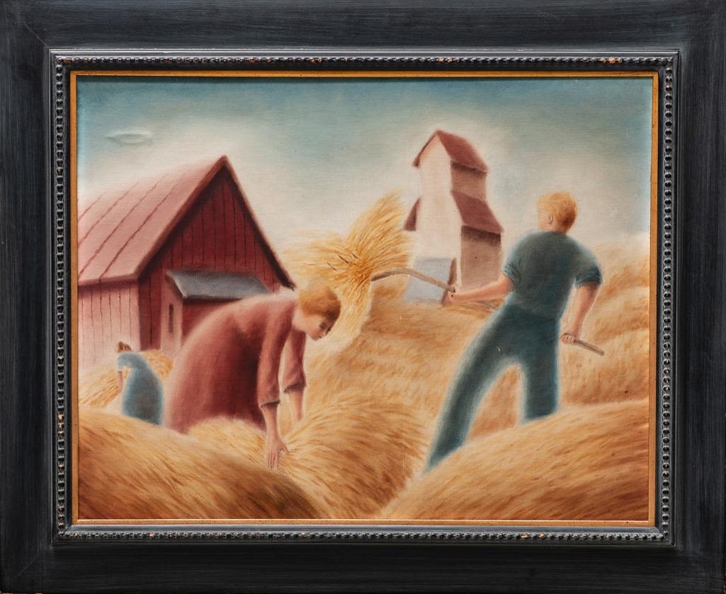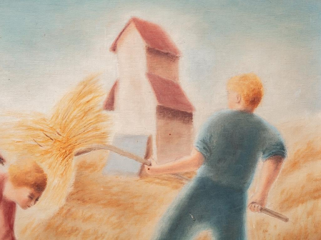 WPA vintage Oil on Artist Board looks likeThomas Hart Benton and John Stewart Curry, Unsigned Farm Scene. 35 x 28 approx framed. 27.5 x 21.5 Art Approx