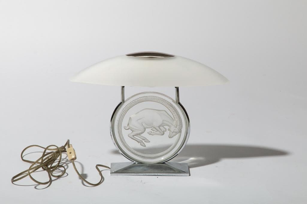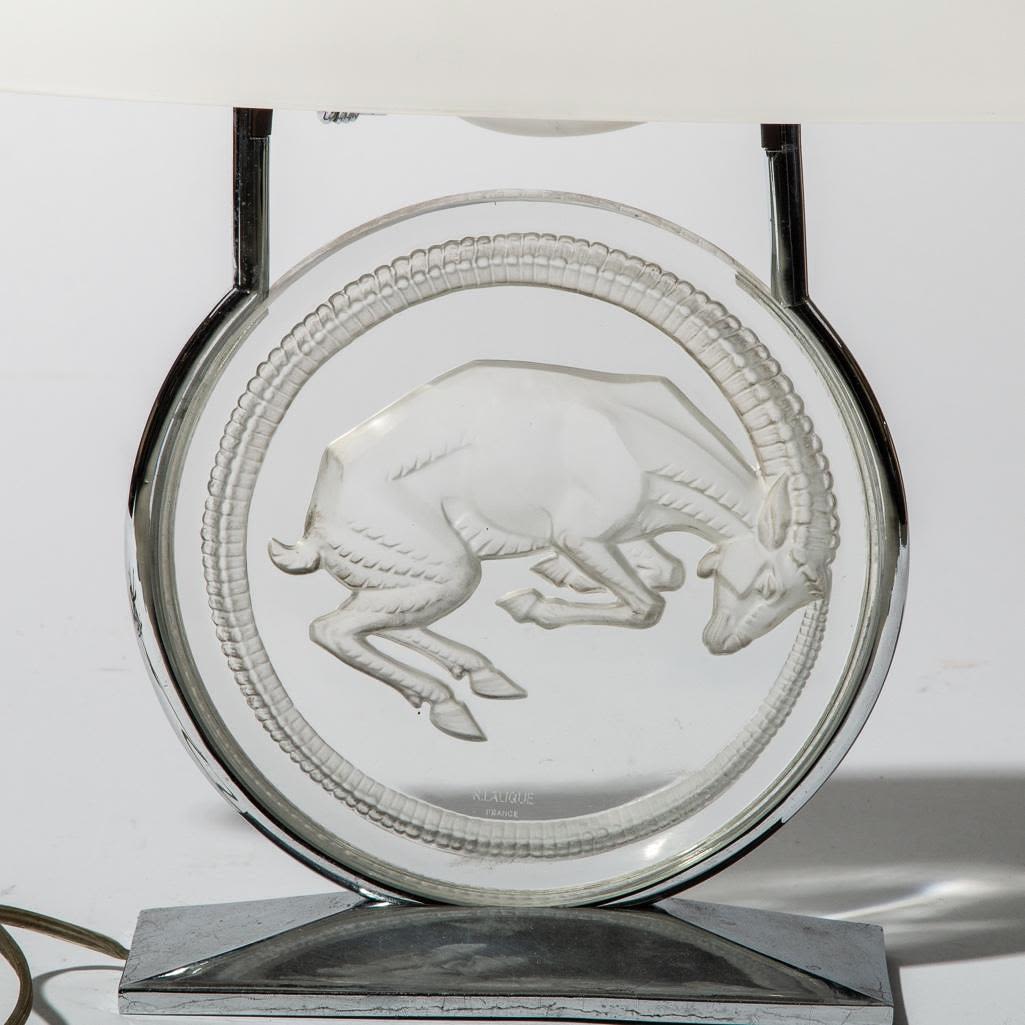 R. Lalique Art Deco "Belier" art glass lamp, round base with etched ram decoration and signed: "R. Lalique France, " ribbed demilune frosted glass shade, chromed metal base. Overall: 12.5" H x 15.5" W x 3.25" D.