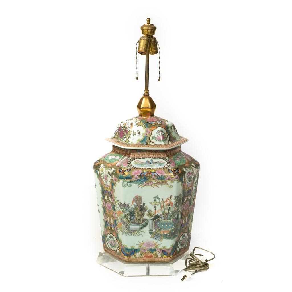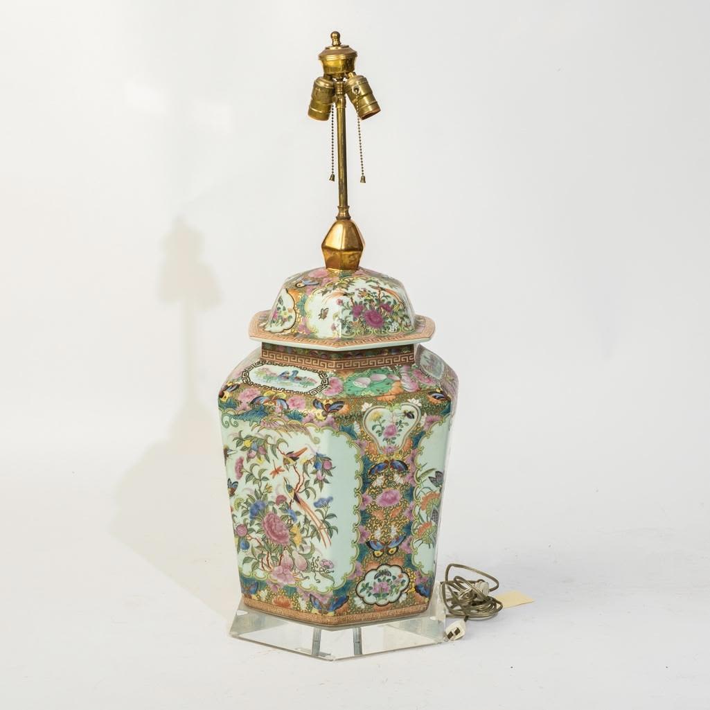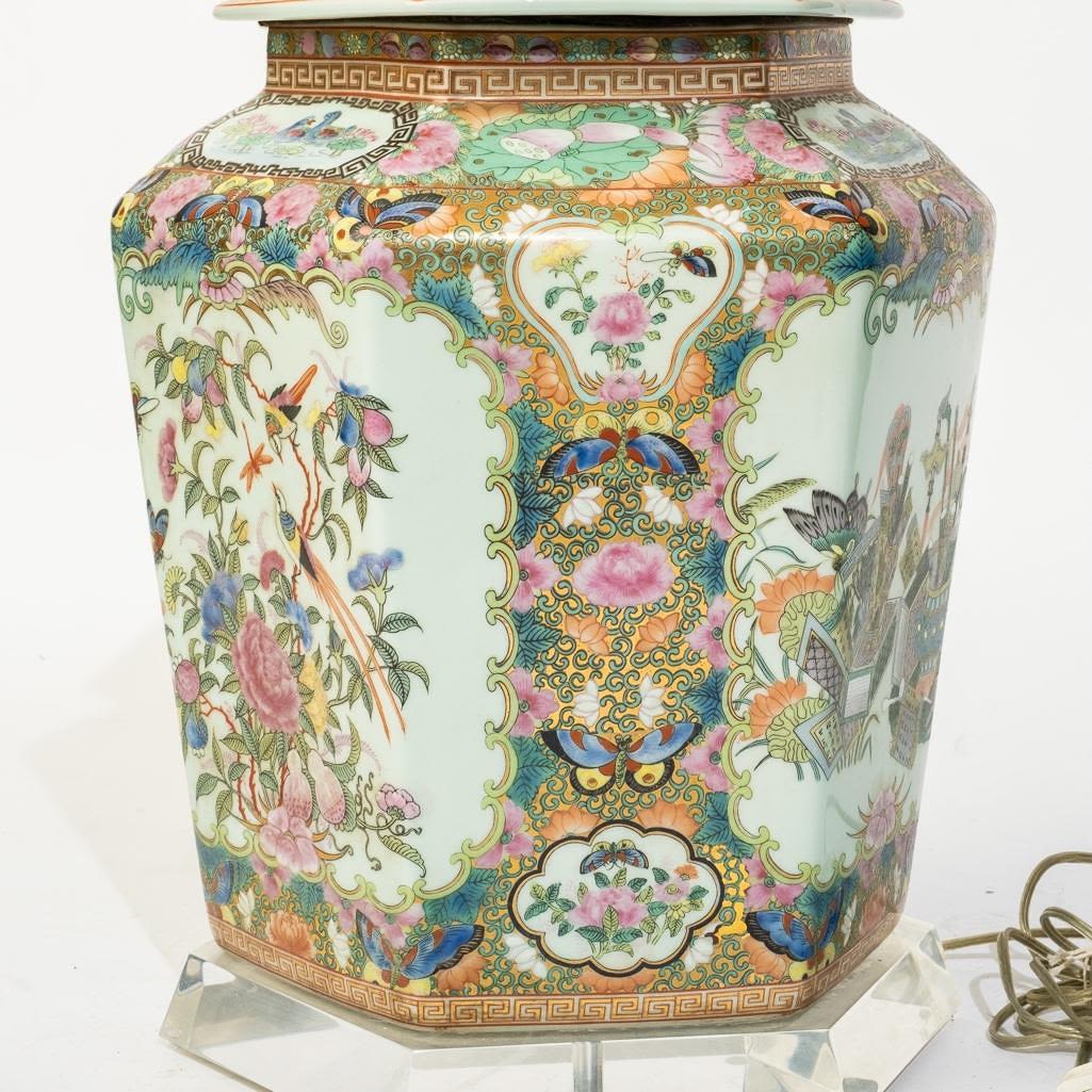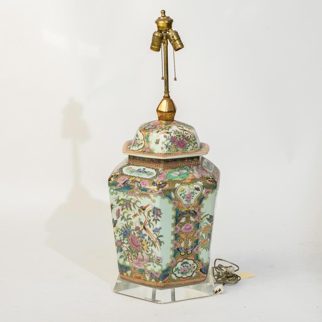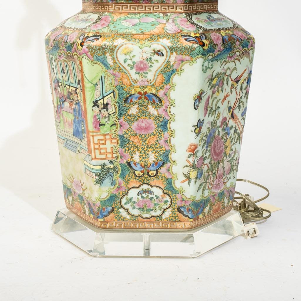 Large Chinese Antique rose medallion ginger jar wired for a lamp on a lucite base, 34"h