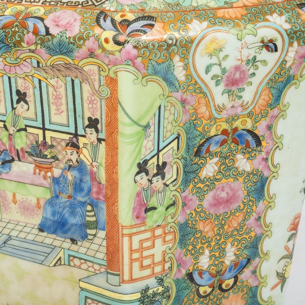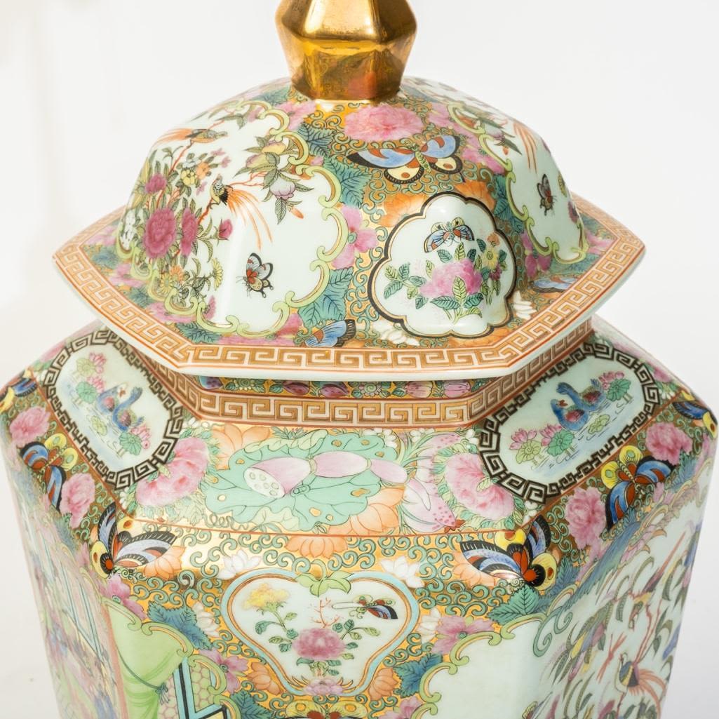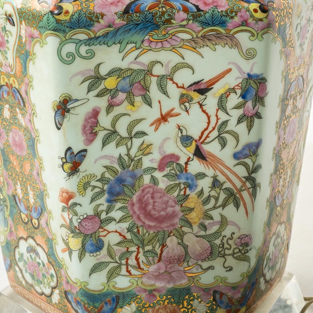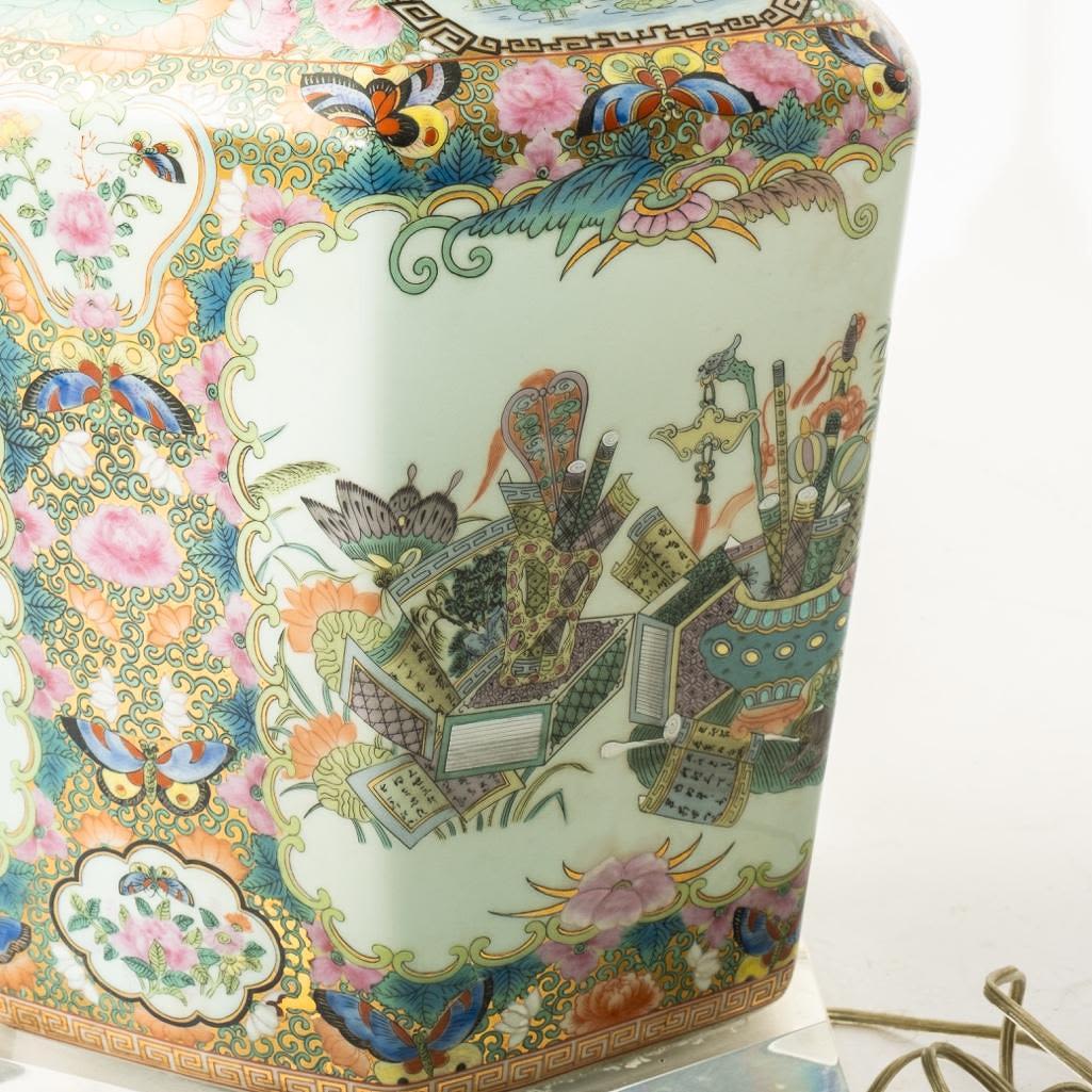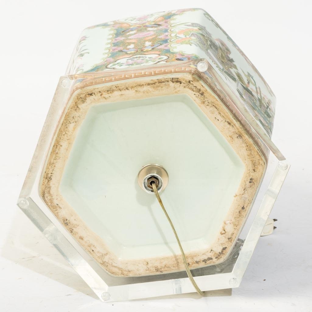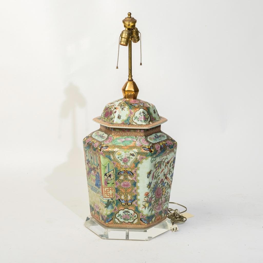 Large Chinese Antique rose medallion ginger jar wired for a lamp on a lucite base, 34"h