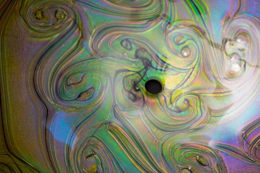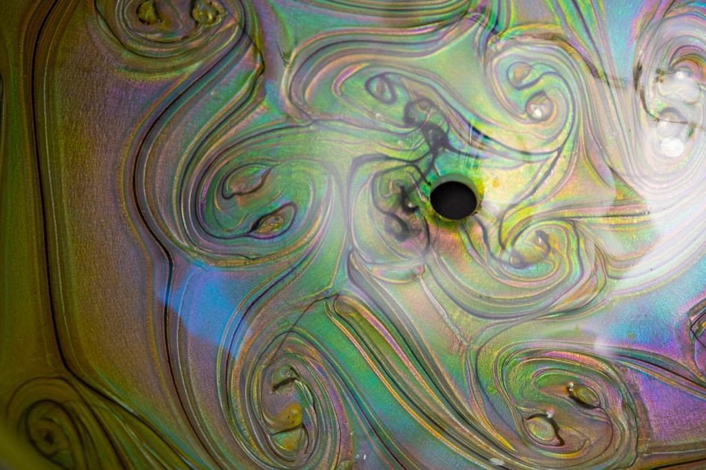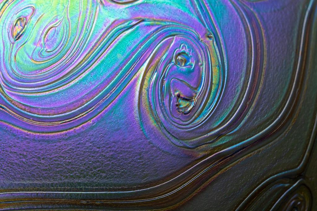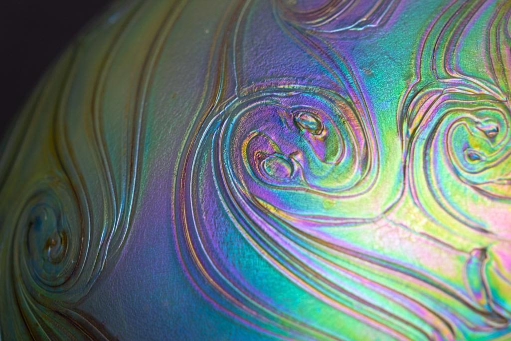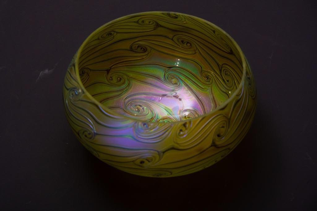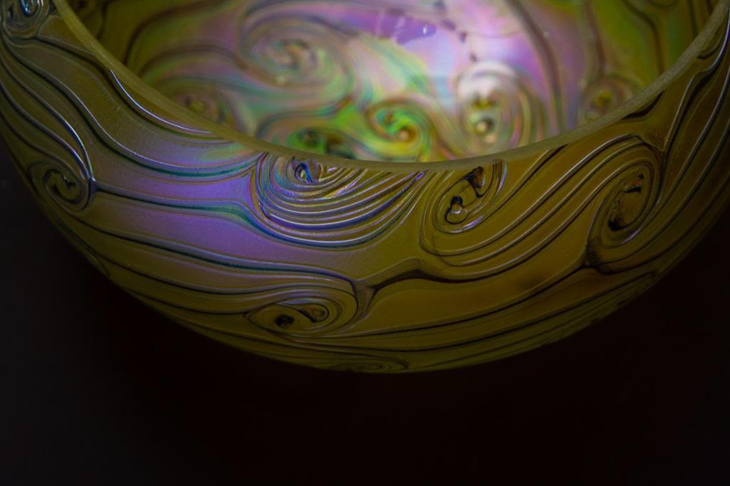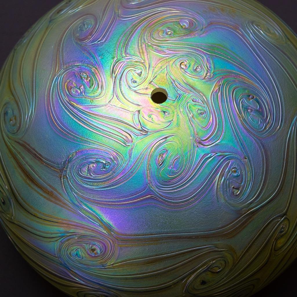 Art Nouveau Glass Large Lamp Shade. Style of Loetz, Tiffany, Steuben, Quetzal. Dimensions: Diameter 11 1/2 ” Diameter fitter rim 10 1/4 ” , High 6 3/4" , Diameter hole 0,47 ” . Unsigned.