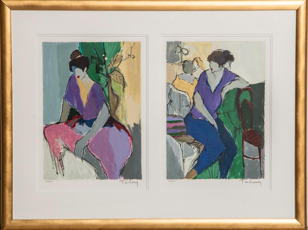 Tarkay Diptych: Woman in Purple and Pink and Woman in Purple and Blue. Each signed "Tarkay" in pencil l.r. and numbered "244/300" in pencil l.l. Color lithographs on paper, image sizes 15 1/4 x 11 in