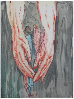Salvador Dali, Spanish Color Woodblock "Divine Comedy – In the Hands of Antaeus" Signed in the Plate. Measures 9-3/4" x 7", frame measures 18-1/4" x 15-3/4".