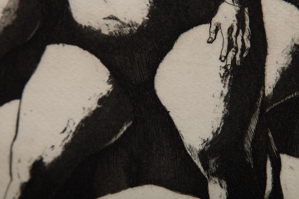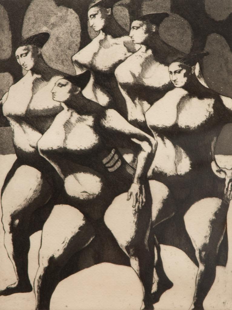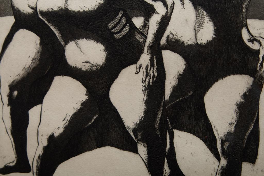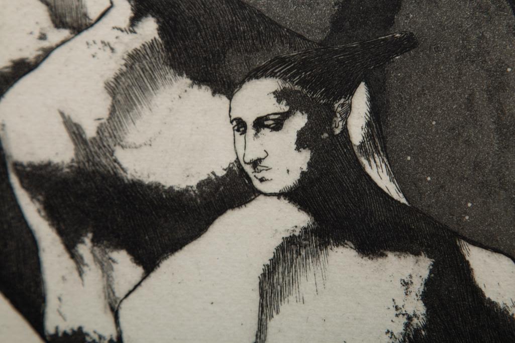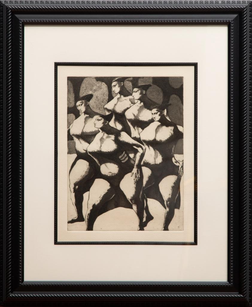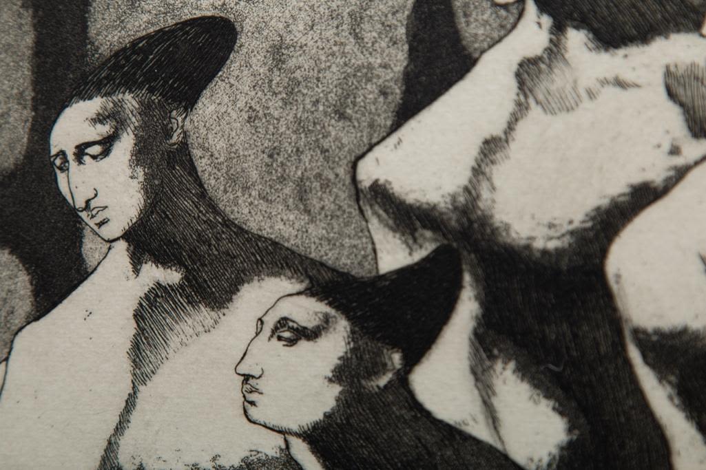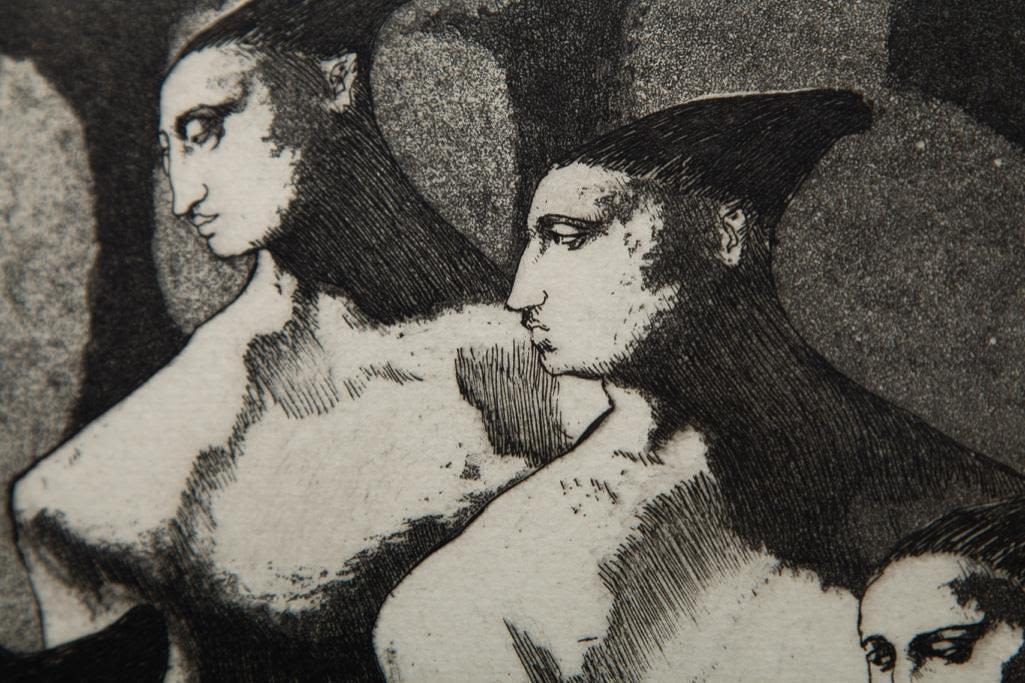 John Fenton etching on paper. Measures 23 3/8" x 19 3/8" Framed : Visible 8 3/4" x 11 5/8" approx Painter, printmaker and teacher John Fenton was born in Mountaindale, New York. He moved with his family to Mount Vernon, New York, where he lived for some thirty years before settling permanently in Woodstock, New York. He attended The Art Student’s League of New York and Atelier 17, Paris. His work was the focus of a number of one-man shows during the 1950s and 1960s, and was exhibited in numerous museums and galleries including the Art Institute of Chicago, The Museum of Modern Art in New York, The Corcoran Gallery in Washington, D.C. And the Pennsylvania Academy.Fenton taught at New York University and Goddard College. His distinctly surrealist work won awards from the American Academy of Arts and Letters, the National Academy of Design, and numerous other institutions, and is included in the collections of the Smithsonian American Art Museum, the Corcoran Gallery among others. He died at Woodstock, New York.