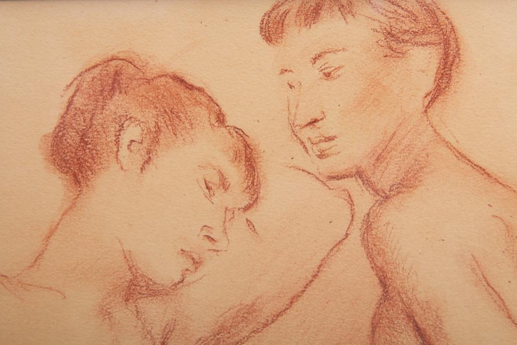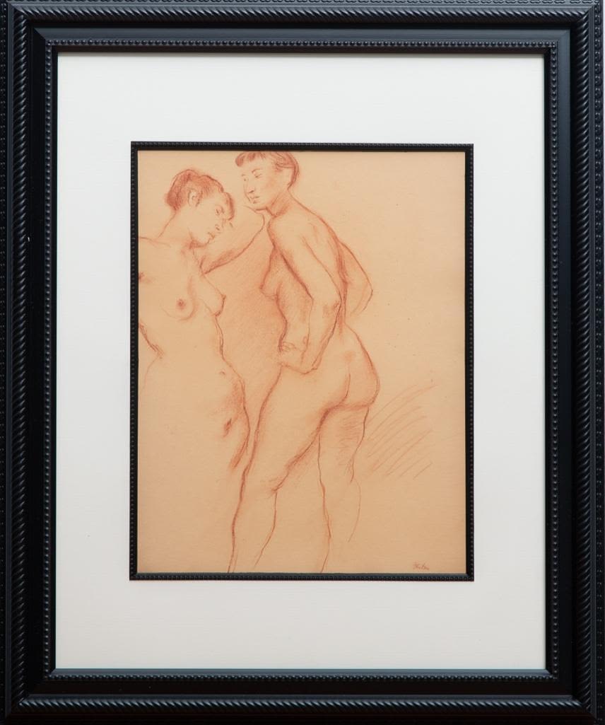 John Fenton graphite on paper drawing of two nude woman. Signed bottom right. Measures 19 3/8" x 23.5": Visible 13 3/8 x 10 3/8" Approx. Painter, printmaker and teacher John Fenton was born in Mountaindale, New York. He moved with his family to Mount Vernon, New York, where he lived for some thirty years before settling permanently in Woodstock, New York. He attended The Art Student’s League of New York and Atelier 17, Paris. His work was the focus of a number of one-man shows during the 1950s and 1960s, and was exhibited in numerous museums and galleries including the Art Institute of Chicago, The Museum of Modern Art in New York, The Corcoran Gallery in Washington, D.C. And the Pennsylvania Academy.Fenton taught at New York University and Goddard College. His distinctly surrealist work won awards from the American Academy of Arts and Letters, the National Academy of Design, and numerous other institutions, and is included in the collections of the Smithsonian American Art Museum, the Corcoran Gallery among others. He died at Woodstock, New York.