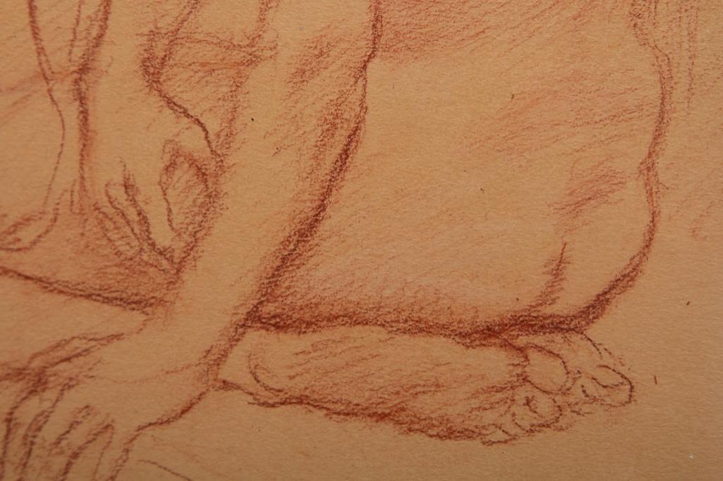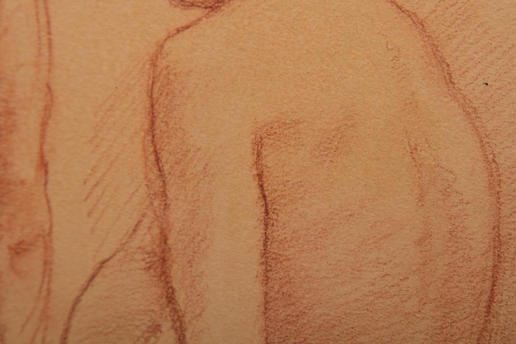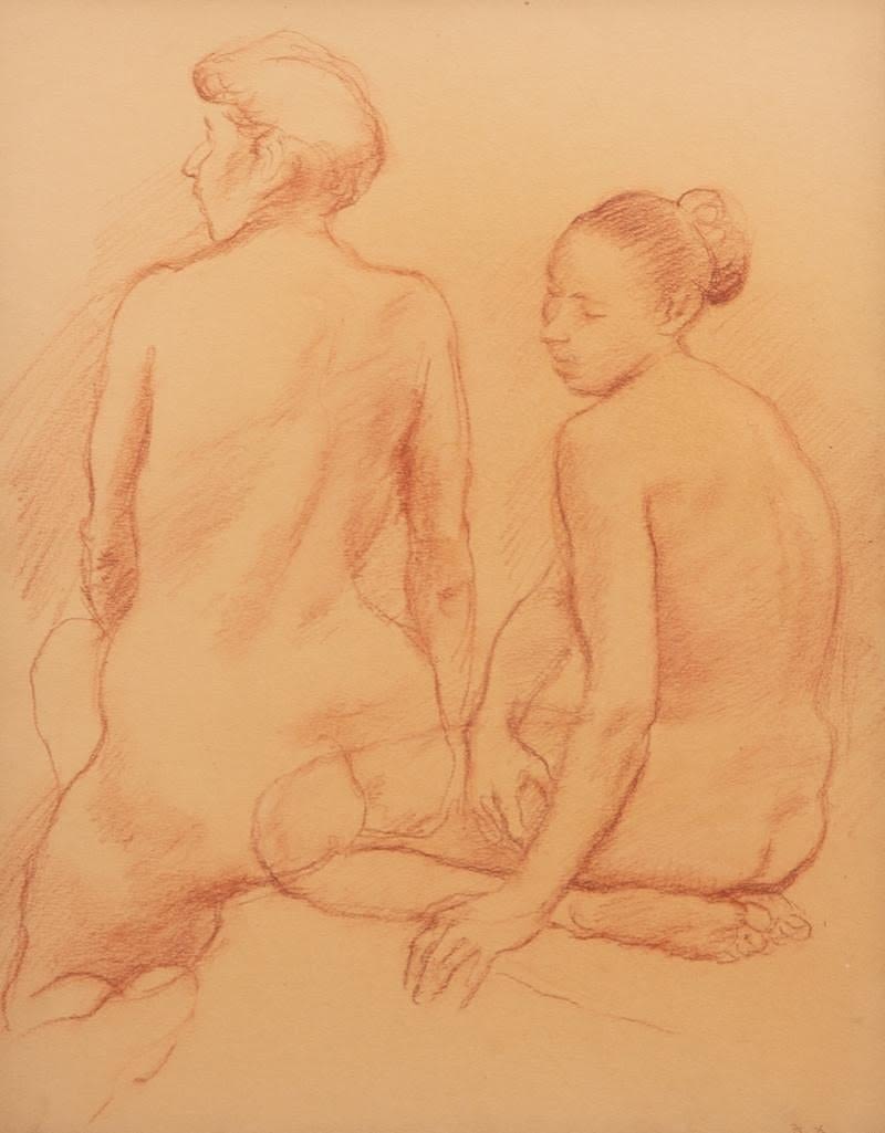 John Fenton graphite on paper drawing of two nude women sitting. Signed bottom right. Measures 19 3/8" x 23.5": Visible 13 3/8 x 10 3/8" Approx. Painter, printmaker and teacher John Fenton was born in Mountaindale, New York. He moved with his family to Mount Vernon, New York, where he lived for some thirty years before settling permanently in Woodstock, New York. He attended The Art Student’s League of New York and Atelier 17, Paris. His work was the focus of a number of one-man shows during the 1950s and 1960s, and was exhibited in numerous museums and galleries including the Art Institute of Chicago, The Museum of Modern Art in New York, The Corcoran Gallery in Washington, D.C. And the Pennsylvania Academy.Fenton taught at New York University and Goddard College. His distinctly surrealist work won awards from the American Academy of Arts and Letters, the National Academy of Design, and numerous other institutions, and is included in the collections of the Smithsonian American Art Museum, the Corcoran Gallery among others. He died at Woodstock, New York.