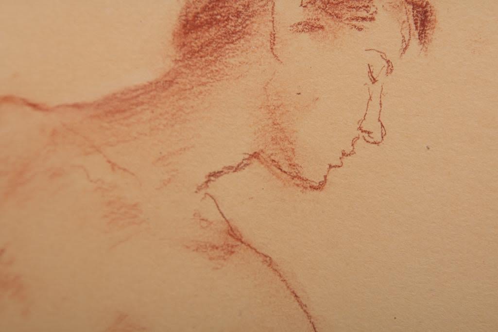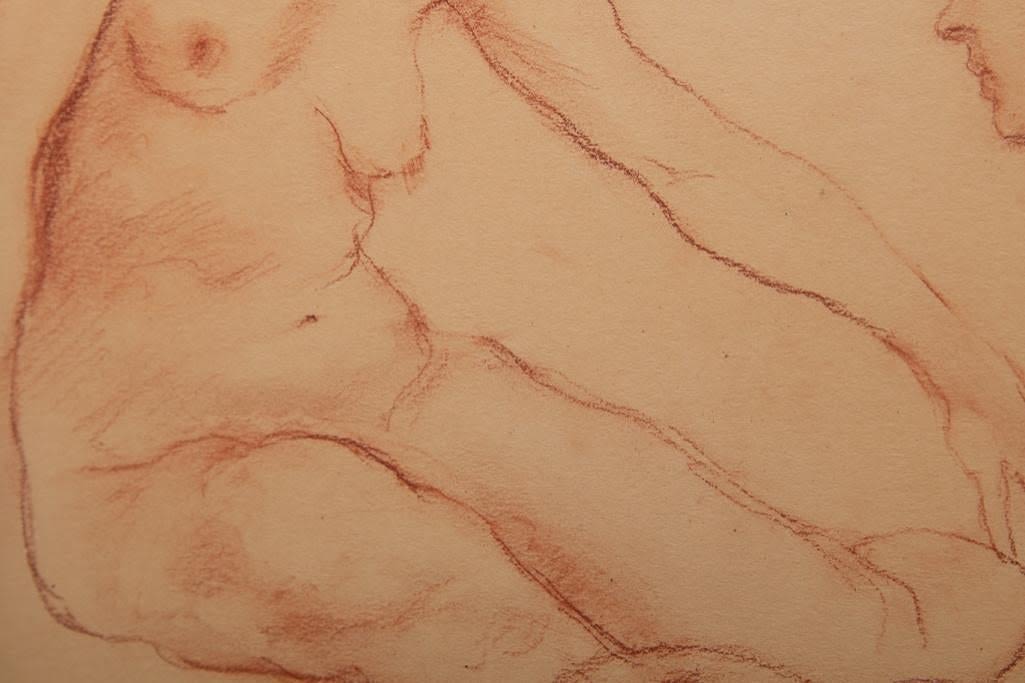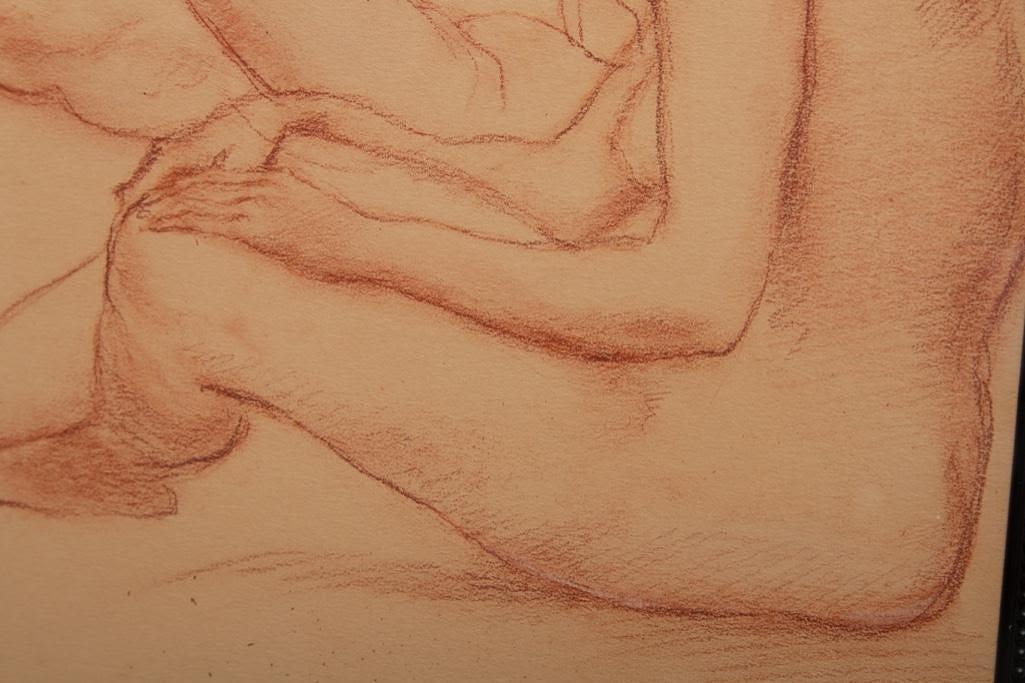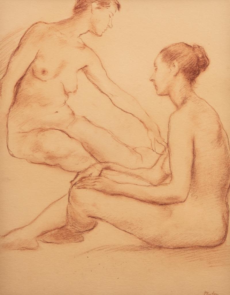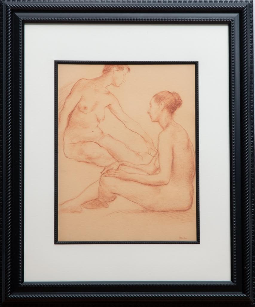 John Fenton graphite on paper drawing of two nude women sitting. Signed bottom right. Measures 19 3/8" x 23.5": Visible 13 3/8 x 10 3/8" Approx. Painter, printmaker and teacher John Fenton was born in Mountaindale, New York. He moved with his family to Mount Vernon, New York, where he lived for some thirty years before settling permanently in Woodstock, New York. He attended The Art Student’s League of New York and Atelier 17, Paris. His work was the focus of a number of one-man shows during the 1950s and 1960s, and was exhibited in numerous museums and galleries including the Art Institute of Chicago, The Museum of Modern Art in New York, The Corcoran Gallery in Washington, D.C. And the Pennsylvania Academy.Fenton taught at New York University and Goddard College. His distinctly surrealist work won awards from the American Academy of Arts and Letters, the National Academy of Design, and numerous other institutions, and is included in the collections of the Smithsonian American Art Museum, the Corcoran Gallery among others. He died at Woodstock, New York.