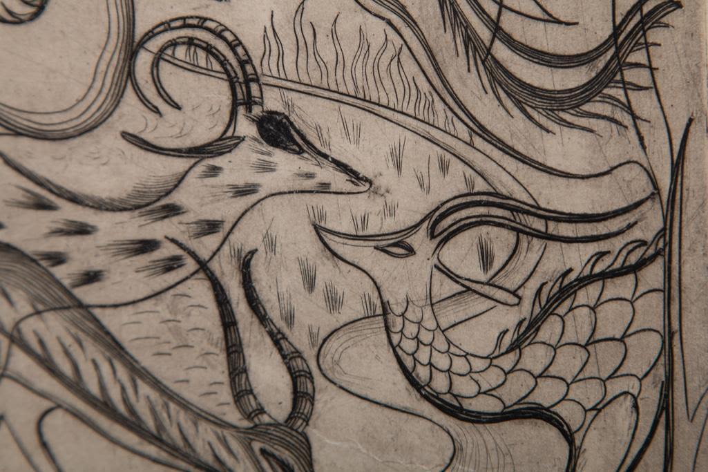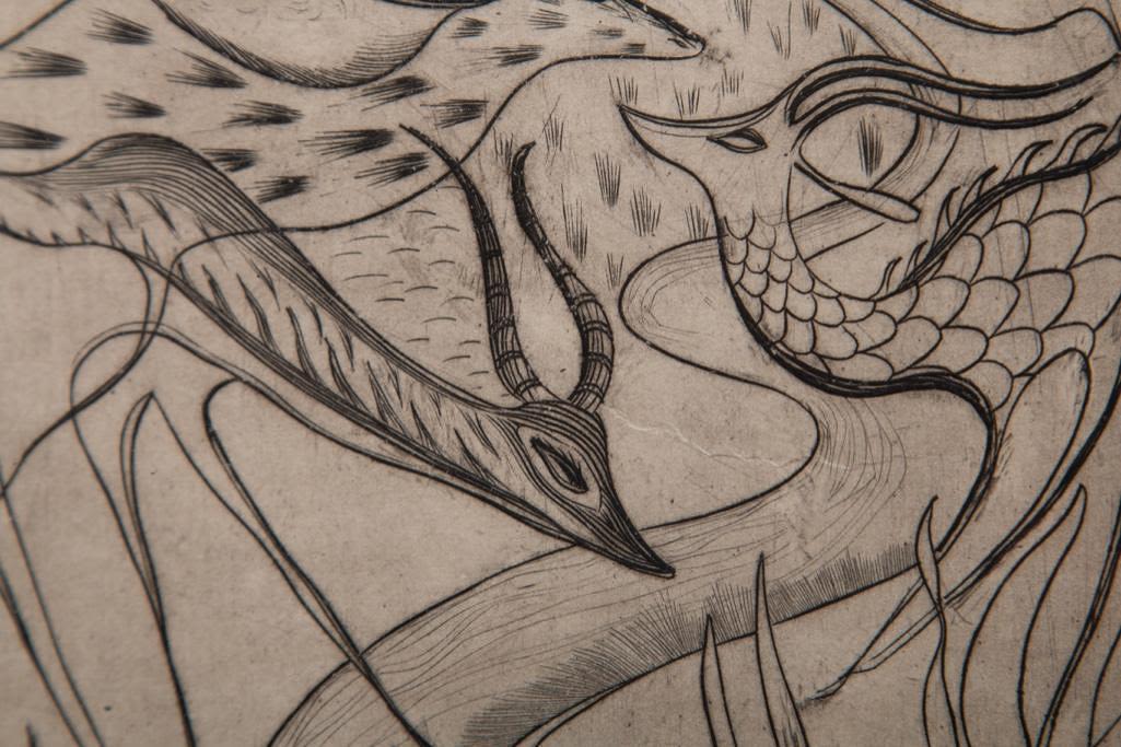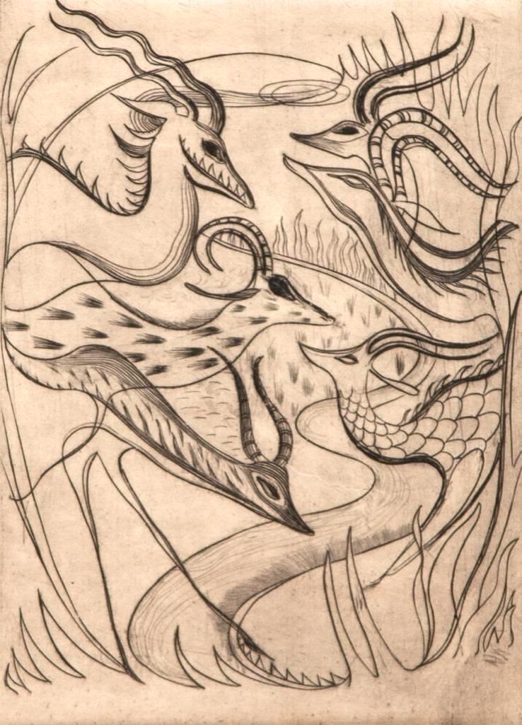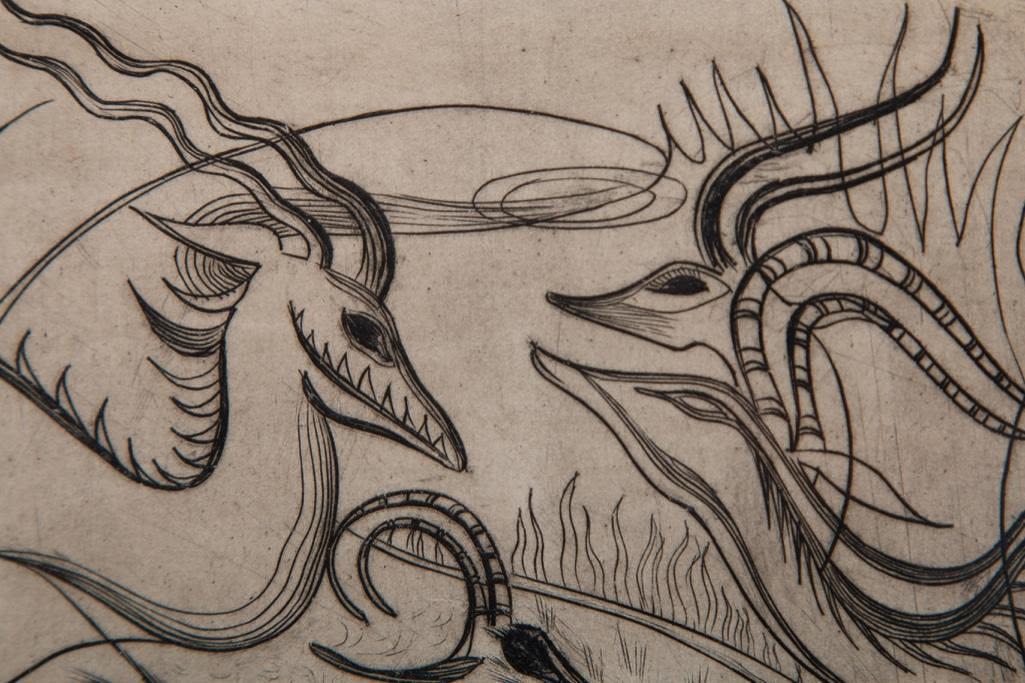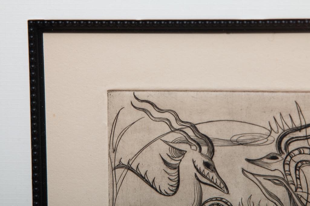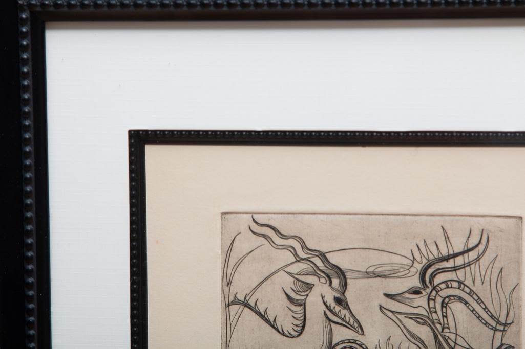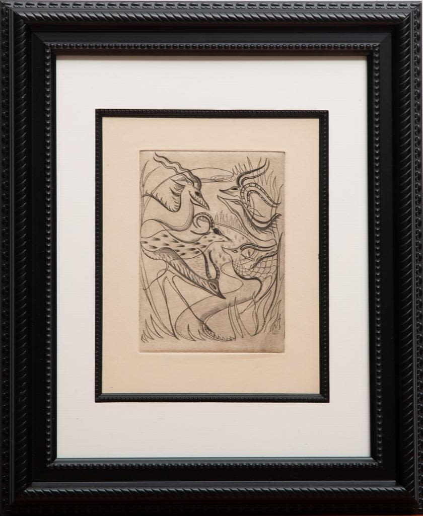 John Fenton Etching of Antelope.Measures 14 1/2" x 17 1/2" Framed: 5" x 7" Visible art Approx. Painter, printmaker and teacher John Fenton was born in Mountaindale, New York. He moved with his family to Mount Vernon, New York, where he lived for some thirty years before settling permanently in Woodstock, New York. He attended The Art Student’s League of New York and Atelier 17, Paris. His work was the focus of a number of one-man shows during the 1950s and 1960s, and was exhibited in numerous museums and galleries including the Art Institute of Chicago, The Museum of Modern Art in New York, The Corcoran Gallery in Washington, D.C. And the Pennsylvania Academy.Fenton taught at New York University and Goddard College. His distinctly surrealist work won awards from the American Academy of Arts and Letters, the National Academy of Design, and numerous other institutions, and is included in the collections of the Smithsonian American Art Museum, the Corcoran Gallery among others. He died at Woodstock, New York.