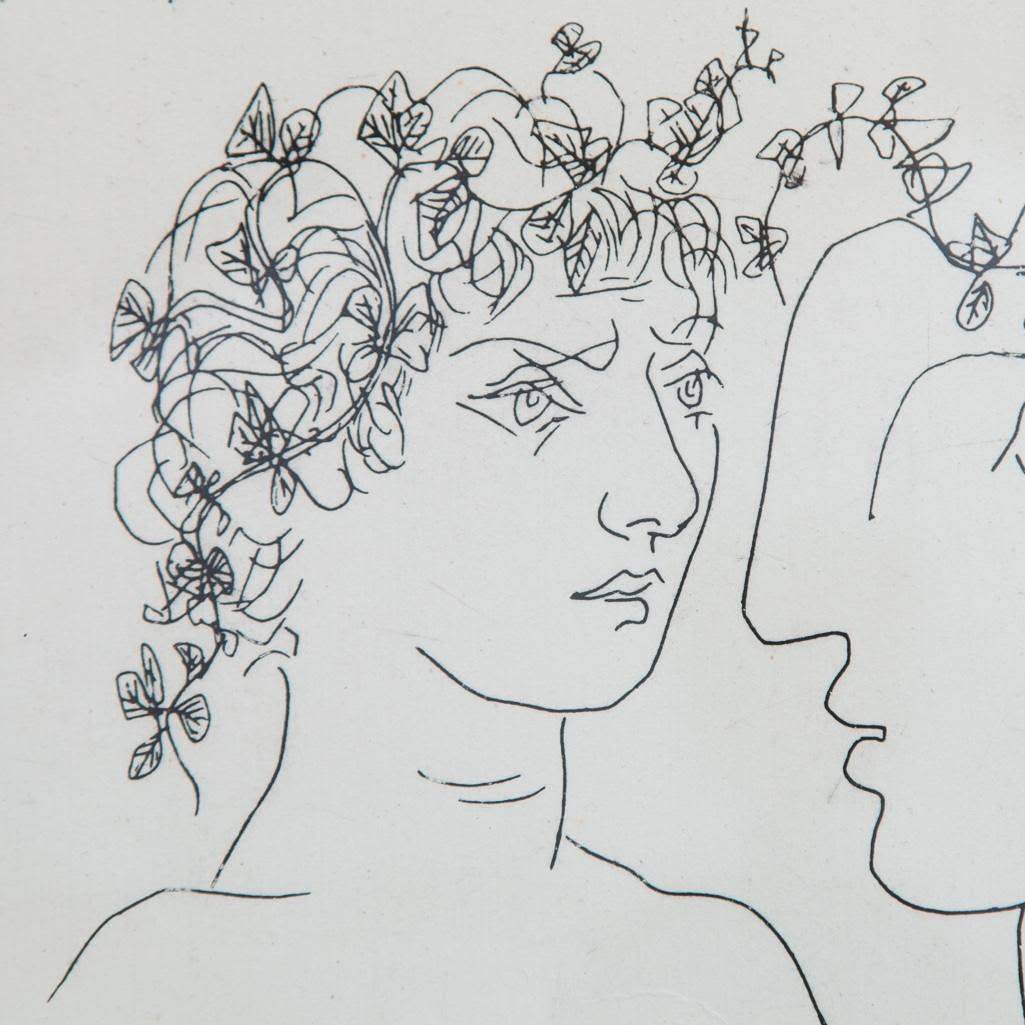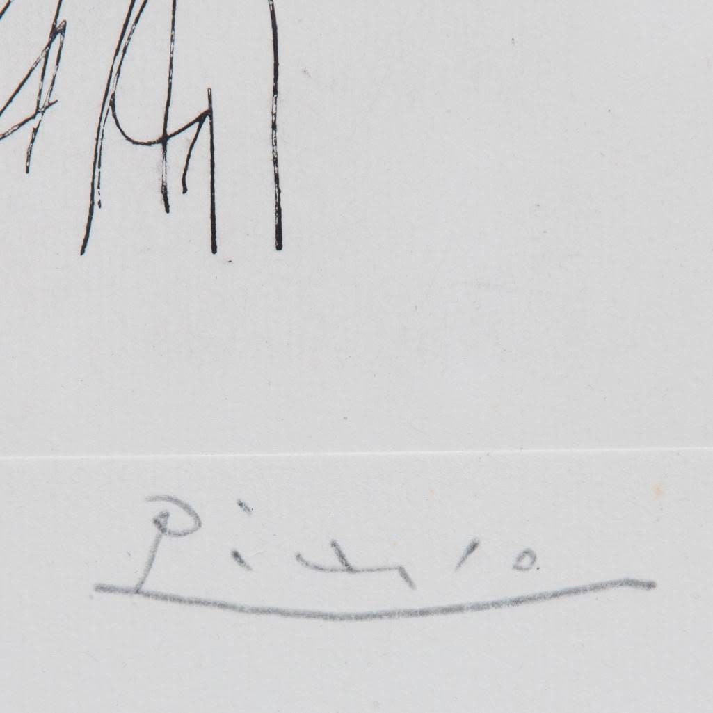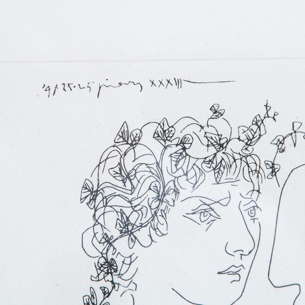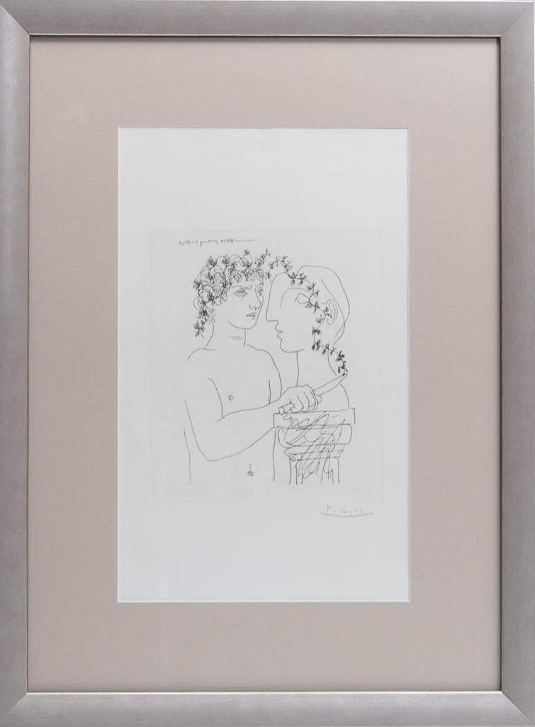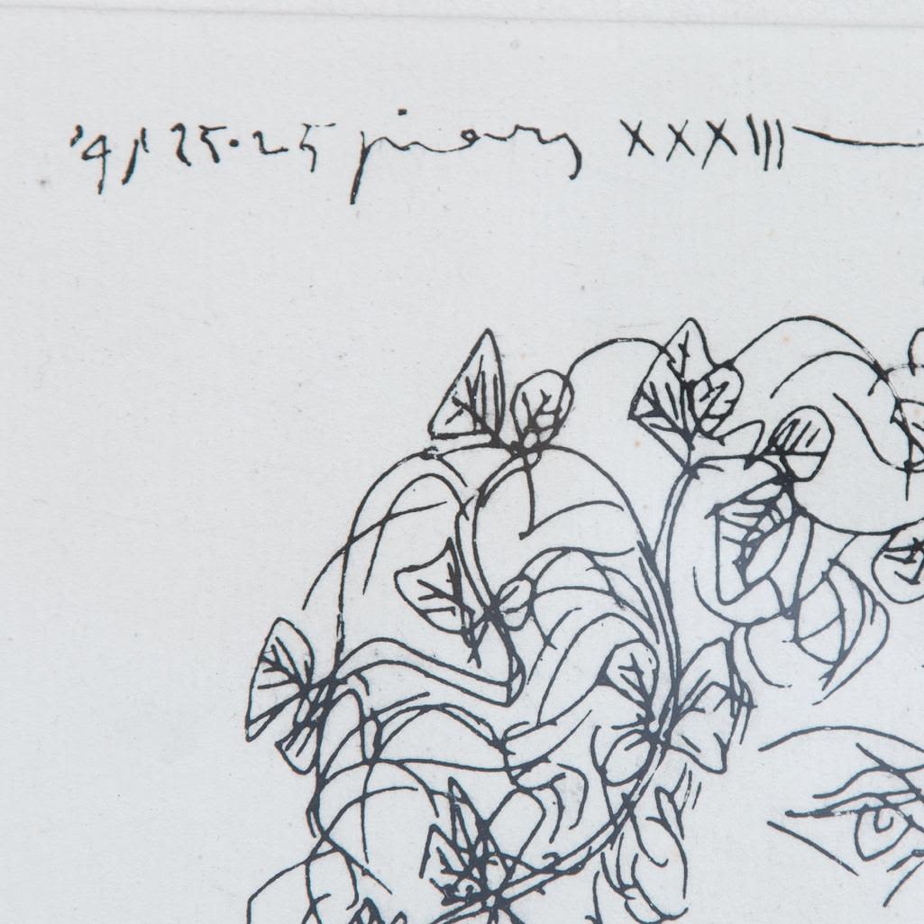 Pablo Picasso, Spanish (1881 – 1973) Etching on Handmade Paper of Young sculptor at work. This work is a variant of the work for the Villard Suite. It is printed on larger paper and the image is reversed. Pencil Signed Lower Right. This is not a numbered print or part of the limited edition. Bears what appears to be a horseshoe and cross watermark on obverse side of the paper. Measures 11" x 9-5/8", overall measures 27-1/4" x 19-3/4". Condition: Light foxing along the borders, some crumbling on obverse side or else good condition. The Vollard Suite is a set of 100 etchings in the neoclassical style by the Spanish artist Pablo Picasso, produced from 1930-1937. Named for the art dealer who commissioned them, Ambroise Vollard, the suite is in a number of museums, and individual etchings from the suite are collectible. Due to all the condition report requests and questions the back has been removed from the frame.