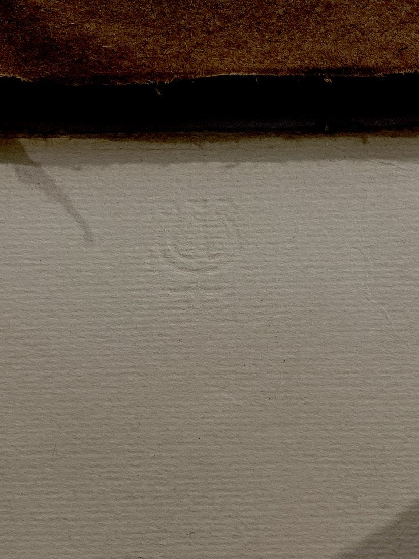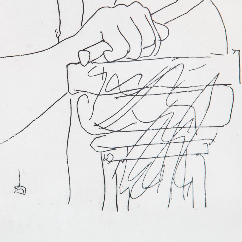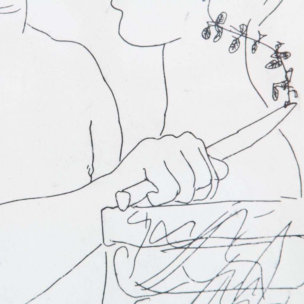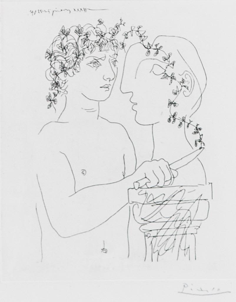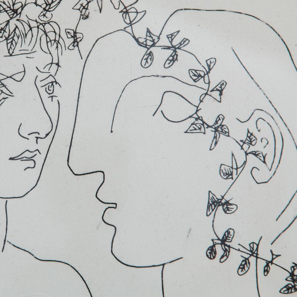Pablo Picasso, Spanish (1881 – 1973) Etching on Handmade Paper of Young sculptor at work. This work is a variant of the work for the Villard Suite. It is printed on larger paper and the image is reversed. Pencil Signed Lower Right. This is not a numbered print or part of the limited edition. Bears what appears to be a horseshoe and cross watermark on obverse side of the paper. Measures 11" x 9-5/8", overall measures 27-1/4" x 19-3/4". Condition: Light foxing along the borders, some crumbling on obverse side or else good condition. The Vollard Suite is a set of 100 etchings in the neoclassical style by the Spanish artist Pablo Picasso, produced from 1930-1937. Named for the art dealer who commissioned them, Ambroise Vollard, the suite is in a number of museums, and individual etchings from the suite are collectible. Due to all the condition report requests and questions the back has been removed from the frame.