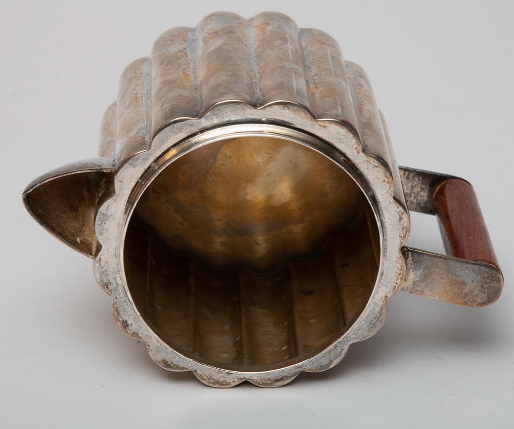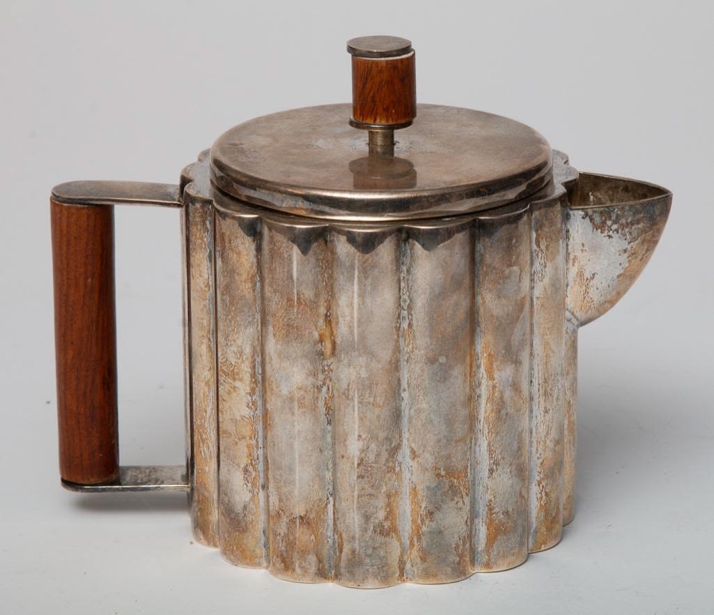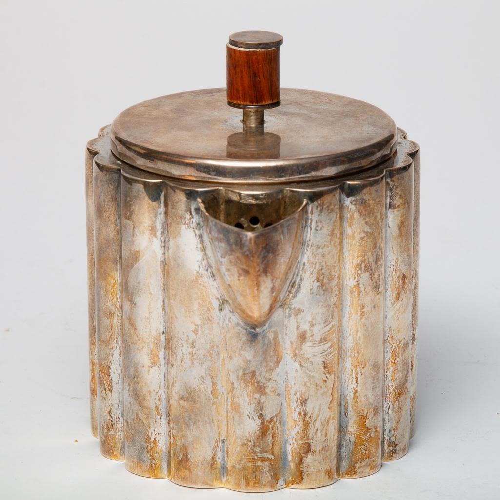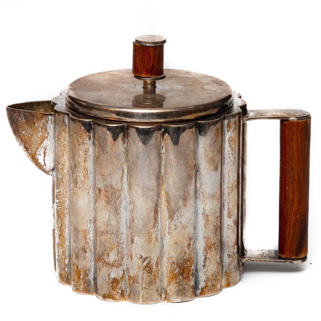 Silver Plated art deco tea pot by Ilonka Karasz 1928 for Payne Baker 5"H x 4"W x 6"D. Please view photos for condition. Obvious discoloration.