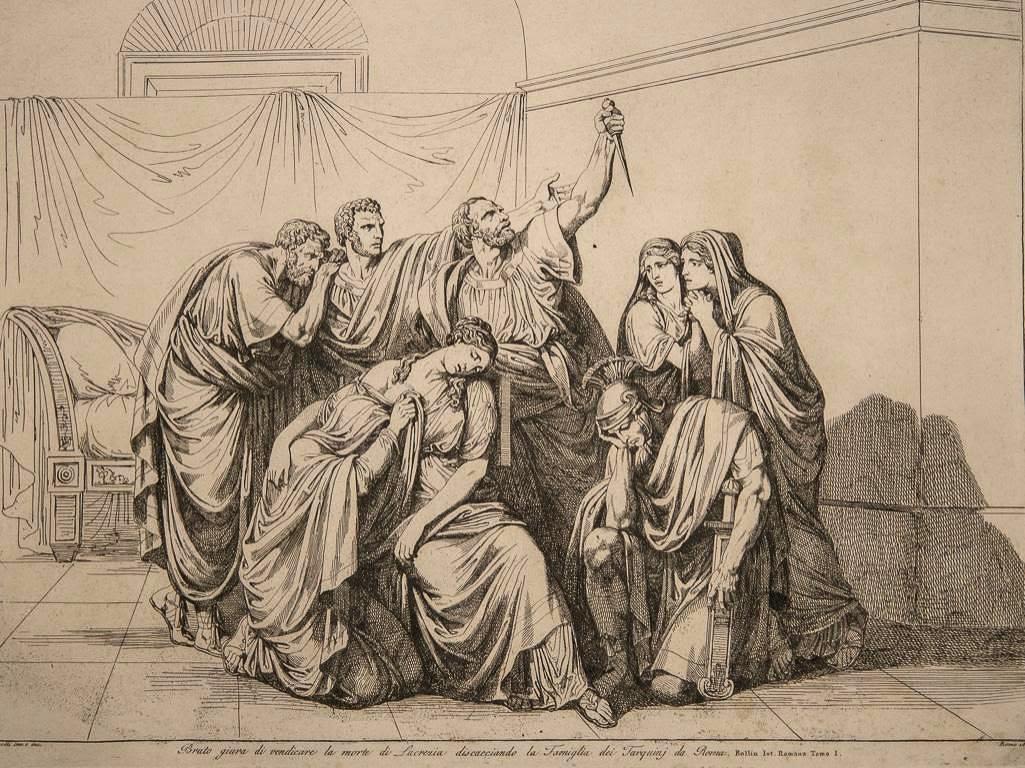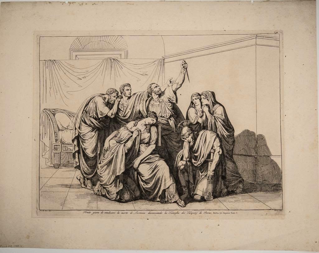 History of Rome Etchings on woven paper by Bartolomeo Pinelli 1816. Measures Approx 17" x 22". The bottom inscription reads as follows: Bruto giura di vendicare la morte di Lucrezia discacciando la Famiglia di Tarquinj da Roma (Brutus swears to revenge the death of Lucretia and condemns the Tarquini family from Rome). Pinelli was born and died in the Trastevere neighborhood of Rome, the son of an artisan who modeled religious statues.[1] Pinelli was educated first in Bologna and then at the Accademia di San Luca in Rome. He return to live in Trastevere, then a poor quarter of Rome. His initial studio was on Piazza Sciarra on the Corso. His son, Achille Pinelli, was a famous watercolorist in his own right. An extremely prolific engraver, his illustrations depicted the costumes of the Italian people, the great epic poems and numerous other subjects, including popular customs. In general, the most recurring subject is Rome, the ancient city as well as the modern one: its inhabitants and its monuments. Please see photos for condition. Obvious staining.