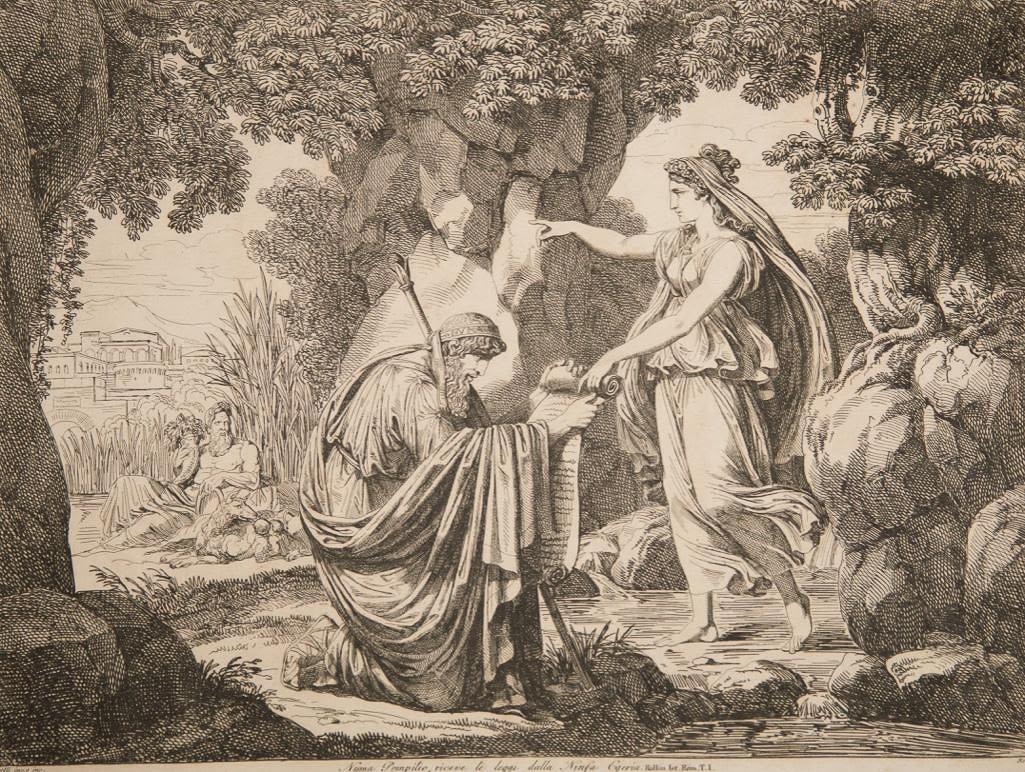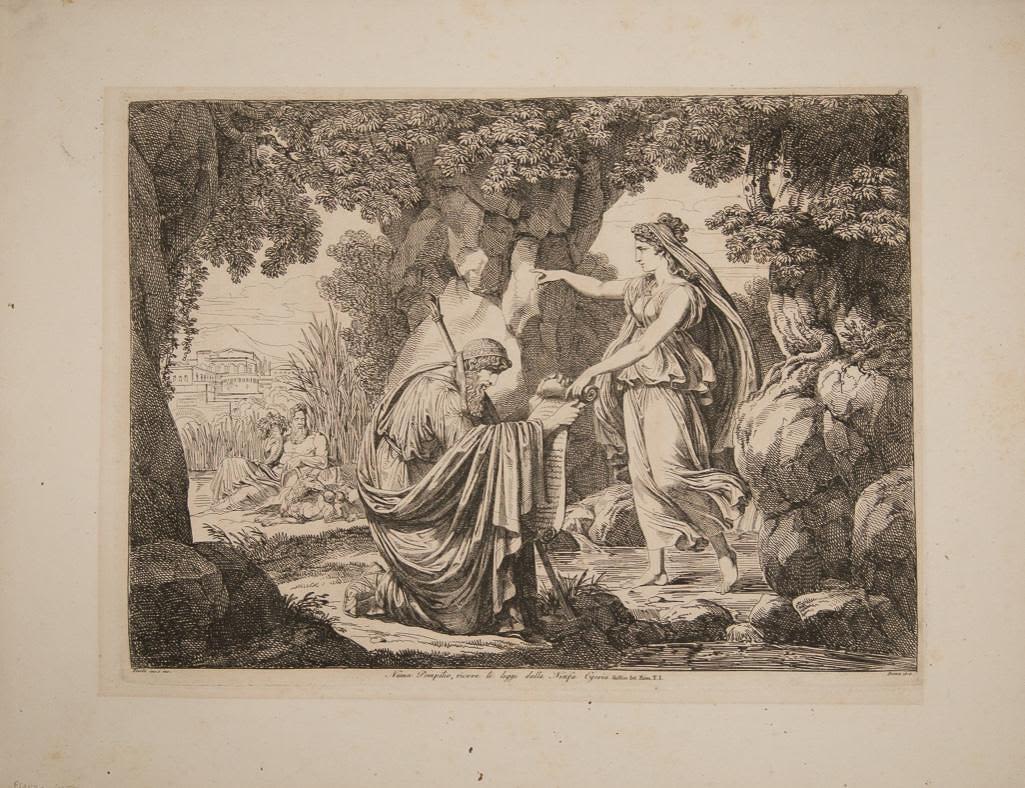 History of Rome Etchings on woven paper by Bartolomeo Pinelli 1816. Measures Approx 17" x 22". The bottom inscription reads as follows: "Numa Pompilio riceve le leggi dalla Ninfa Egeria" (Numa Pompilius receives the laws). Pinelli was born and died in the Trastevere neighborhood of Rome, the son of an artisan who modeled religious statues.[1] Pinelli was educated first in Bologna and then at the Accademia di San Luca in Rome. He return to live in Trastevere, then a poor quarter of Rome. His initial studio was on Piazza Sciarra on the Corso. His son, Achille Pinelli, was a famous watercolorist in his own right. An extremely prolific engraver, his illustrations depicted the costumes of the Italian people, the great epic poems and numerous other subjects, including popular customs. In general, the most recurring subject is Rome, the ancient city as well as the modern one: its inhabitants and its monuments. Please se photos for condition. Obvious staining.