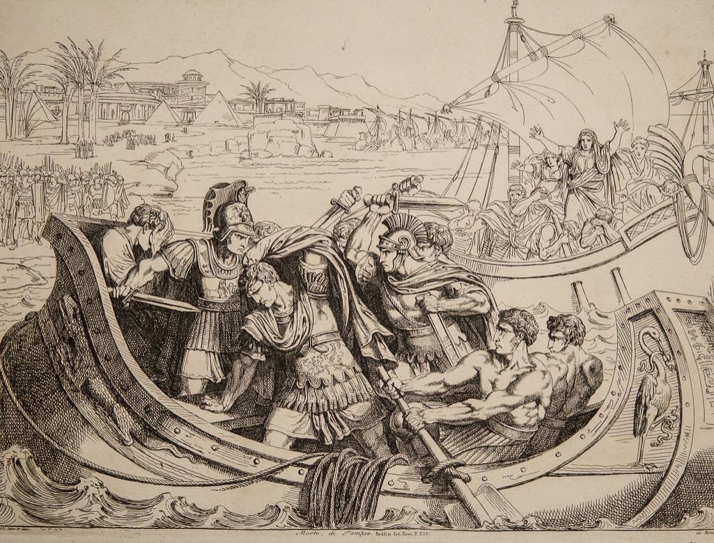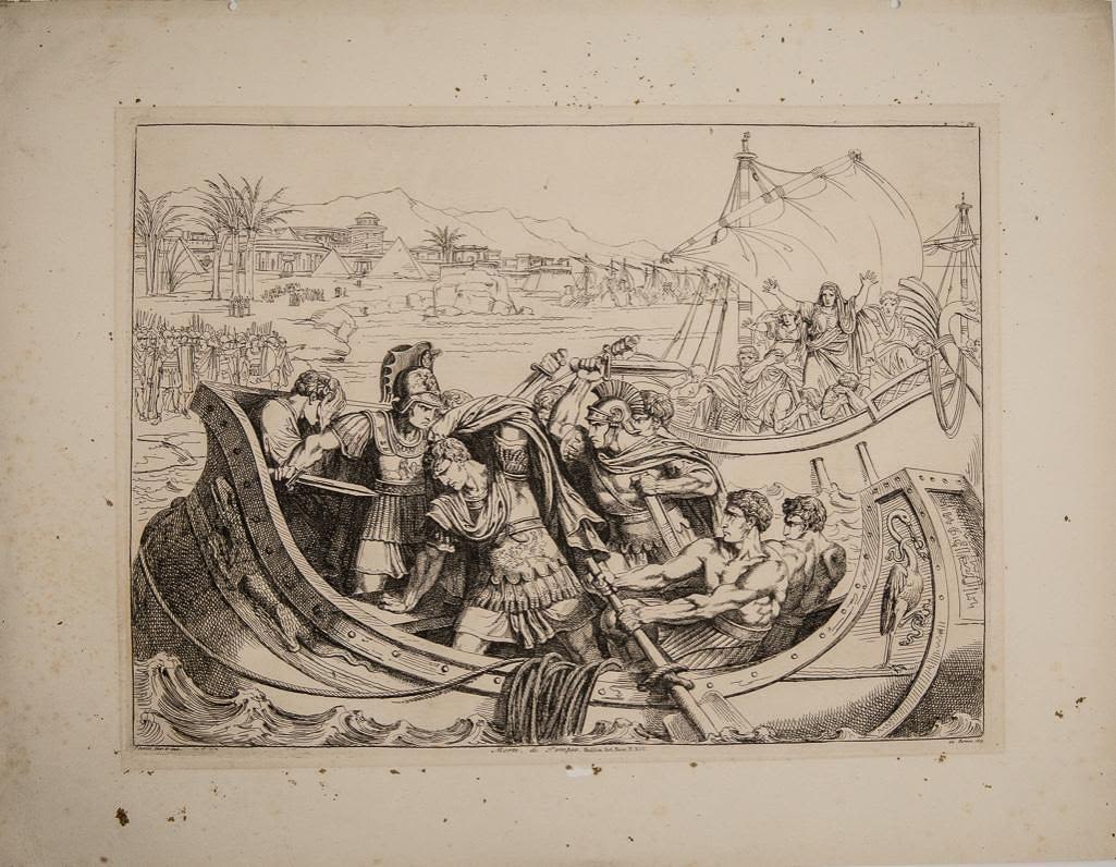 History of Rome Etchings on woven paper by Bartolomeo Pinelli 1816. Measures Approx 17" x 22". The bottom inscription reads as follows: "Morte di Pompeo" (The murder of Pompey). After Pompey was defeated at the Battle of Pharsalus, he fled to Egypt. Pompey was murdered by Roman soldiers in the boat between his galley and the coast of Egypte. Pinelli was born and died in the Trastevere neighborhood of Rome, the son of an artisan who modeled religious statues.[1] Pinelli was educated first in Bologna and then at the Accademia di San Luca in Rome. He return to live in Trastevere, then a poor quarter of Rome. His initial studio was on Piazza Sciarra on the Corso. His son, Achille Pinelli, was a famous watercolorist in his own right. An extremely prolific engraver, his illustrations depicted the costumes of the Italian people, the great epic poems and numerous other subjects, including popular customs. In general, the most recurring subject is Rome, the ancient city as well as the modern one: its inhabitants and its monuments. Please see photos for condition. Obvious staining.