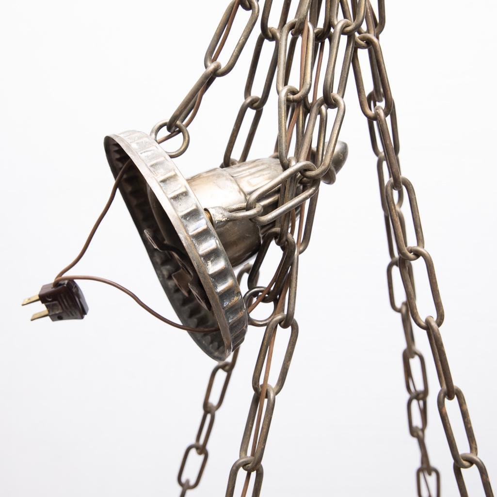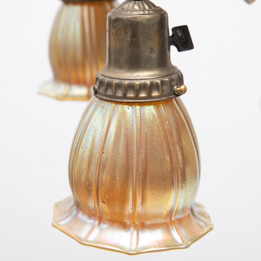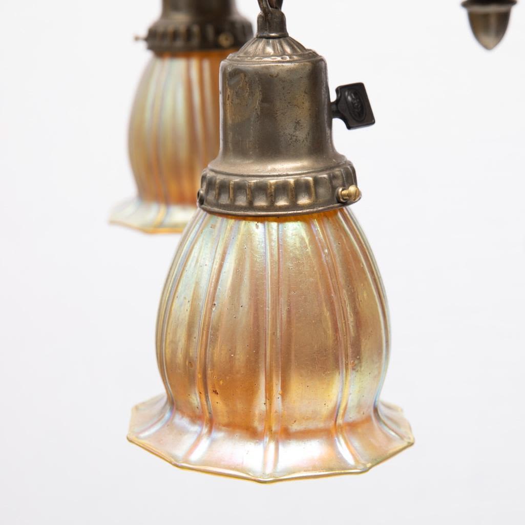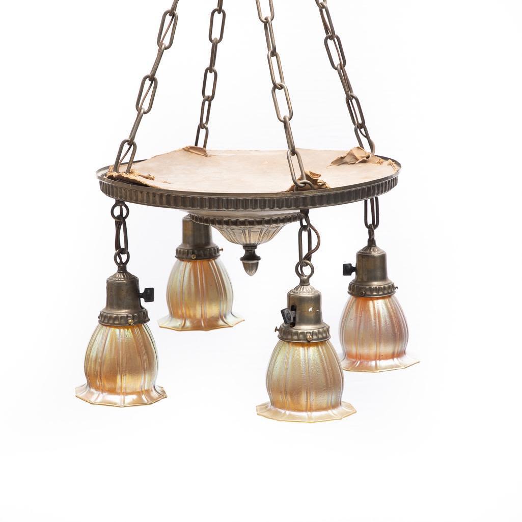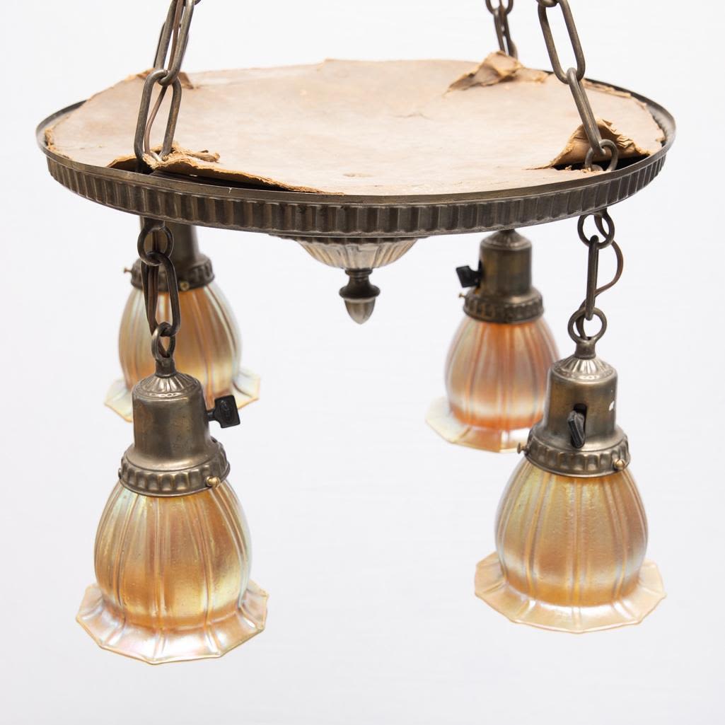 Art Nouveau Circa 1900 brass and irrid.art glass 4 light hanging fixture 16" diameter. It would be wise to check out the wiring before use. When tested only 3 sockets worked.