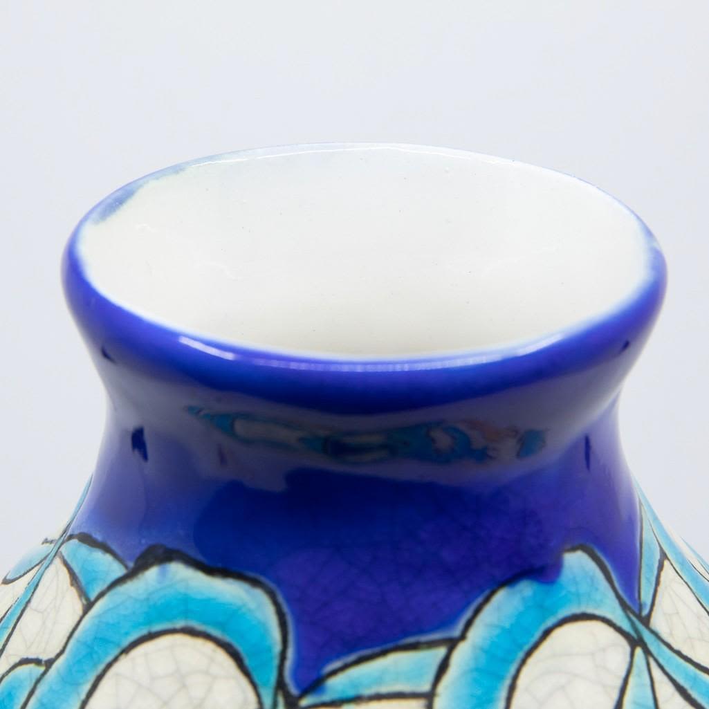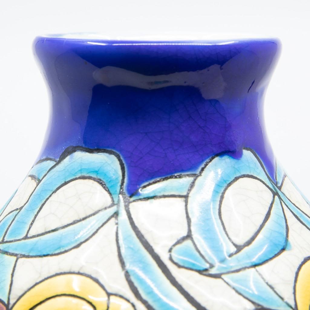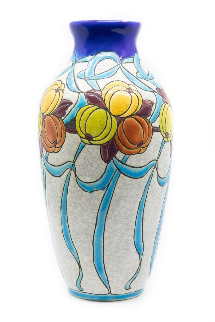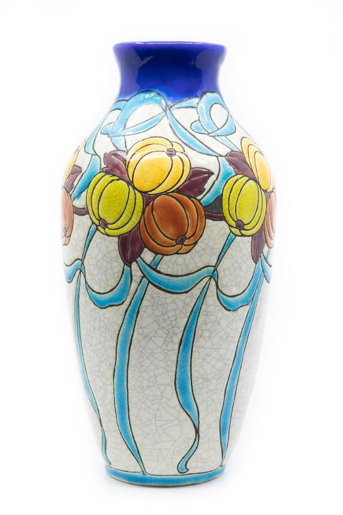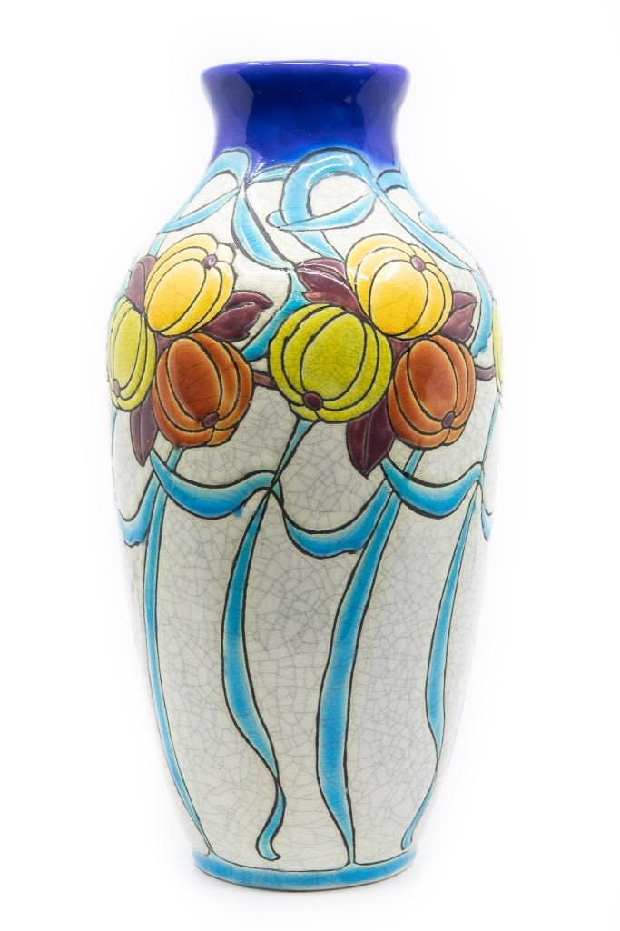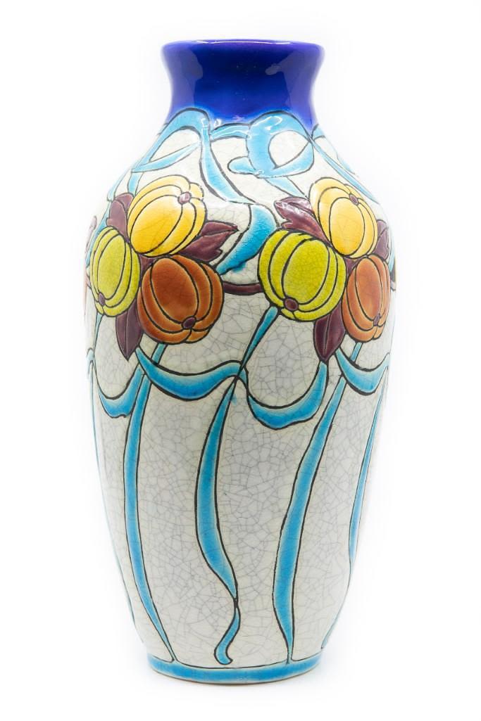 Charles Catteau art deco ceramic enamled vase.Charles Catteau Born at Douai, Charles Catteau trained at the National Ceramics School in Sèvres. In 1904, Catteau was hired by the German Nymphenburg Porcelain Factory, near Munich. In December 1906 he moved to La Louvière and started to work for Boch Frères Keramis. In 1907 he was appointed head of the Decoration Department and Workshop of Imaginative Design, where he created some of the most iconic designs in art deco ceramics and remained in that position until 1948. His works are highly sought after by collectors. The vase drilled for lampmaking purposes was created circa 1920 and stands 11