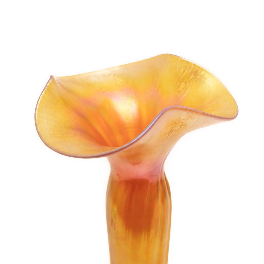 Lundberg Art Glass floriform vase, gold iridescent tulip with ruffle rim, signed LCT Favrile m-4914 on bottom?, ht. 13 in.We are unsure as to why it is signed LCT Favrile but do believe it to be Lundberg