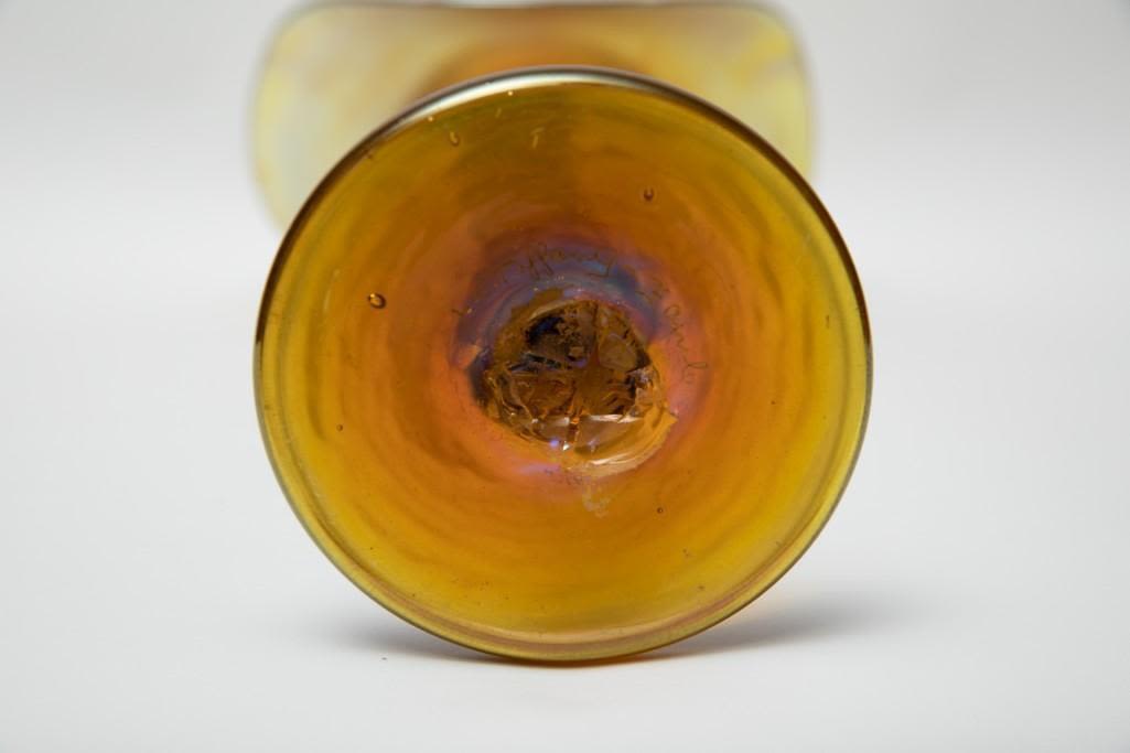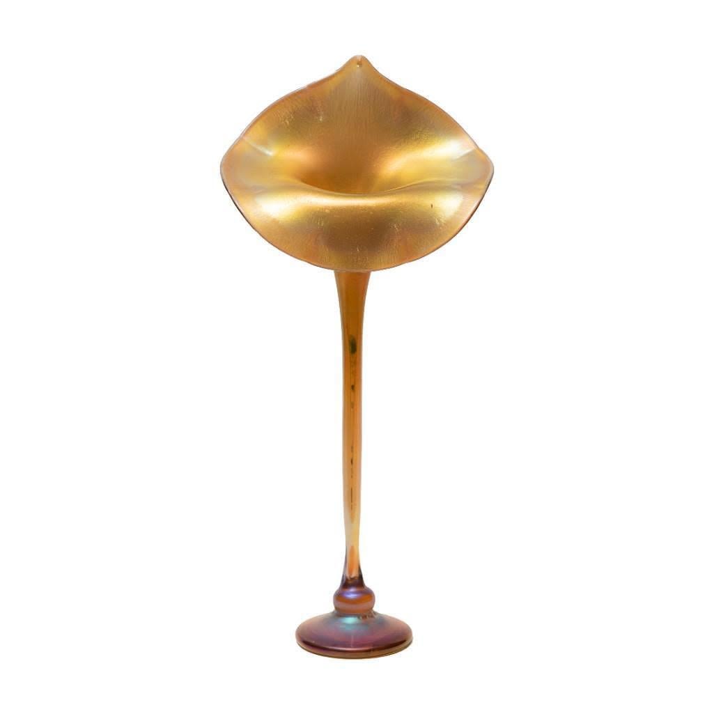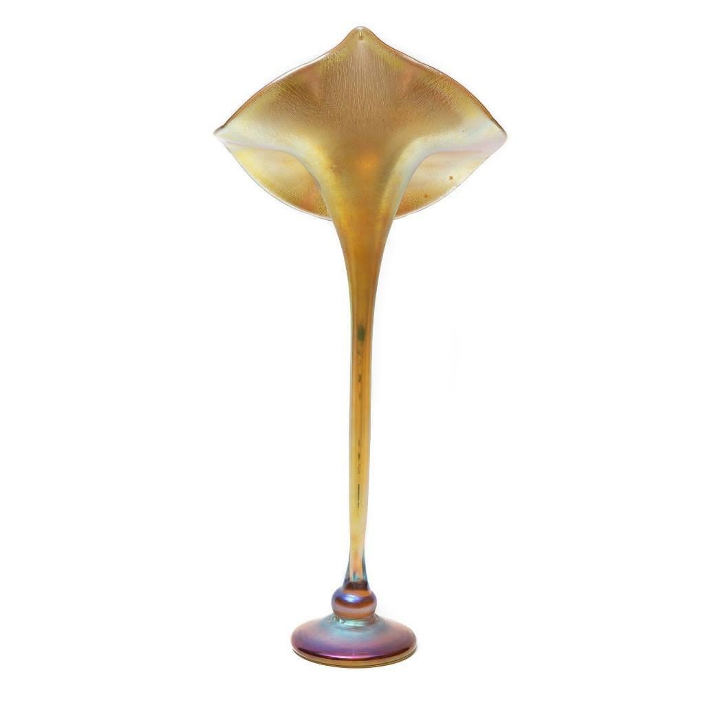 Large Iridescent Jack-in-the-Pulpit Vase, mid to late 20th century, spurious incised mark "LC Tiffany-Favrile, " ht. 19 1/2 in. We are not saying that this item is Tiffany but it is signed. Please make your own judgment. Good condition. No chips or breaks.