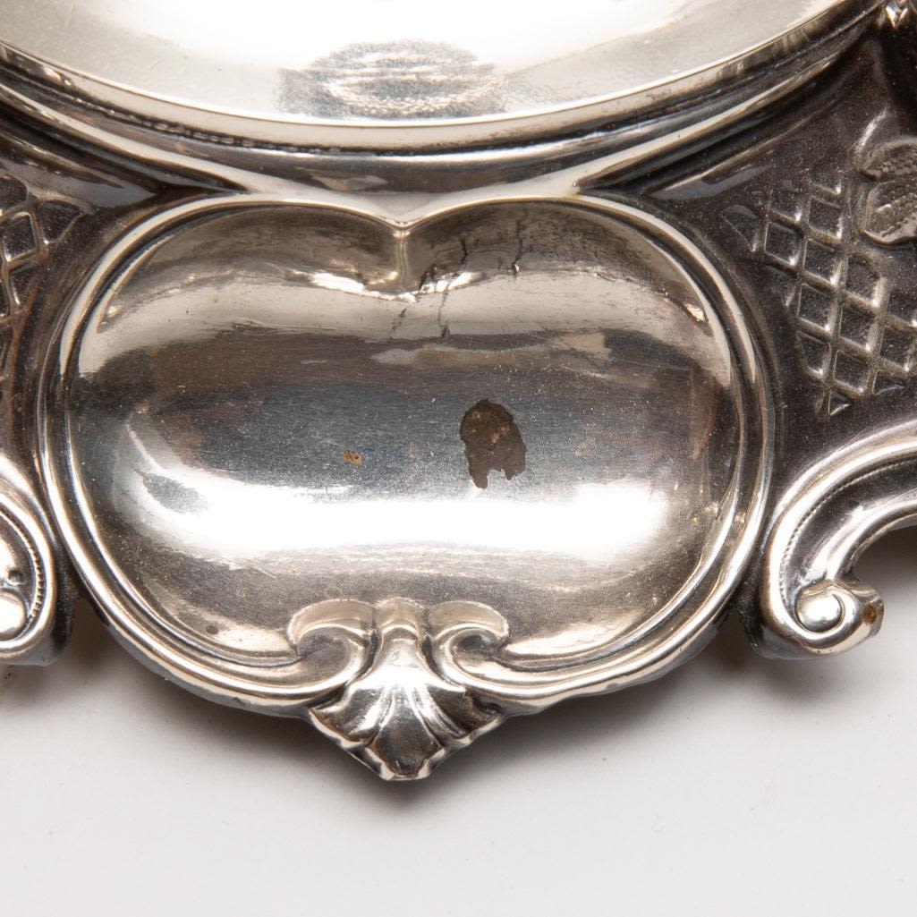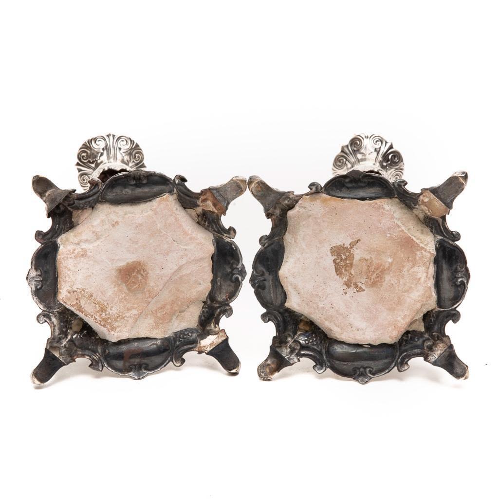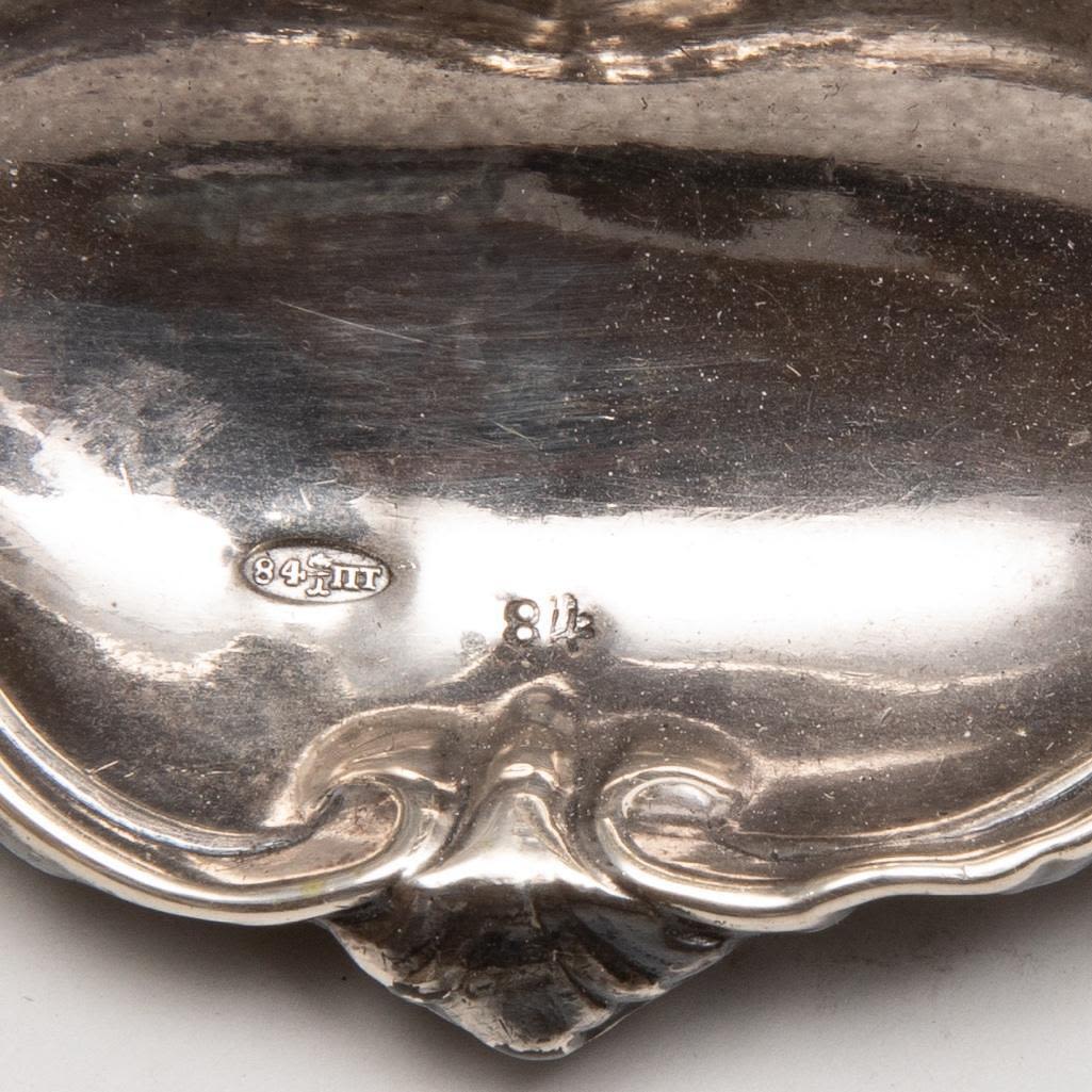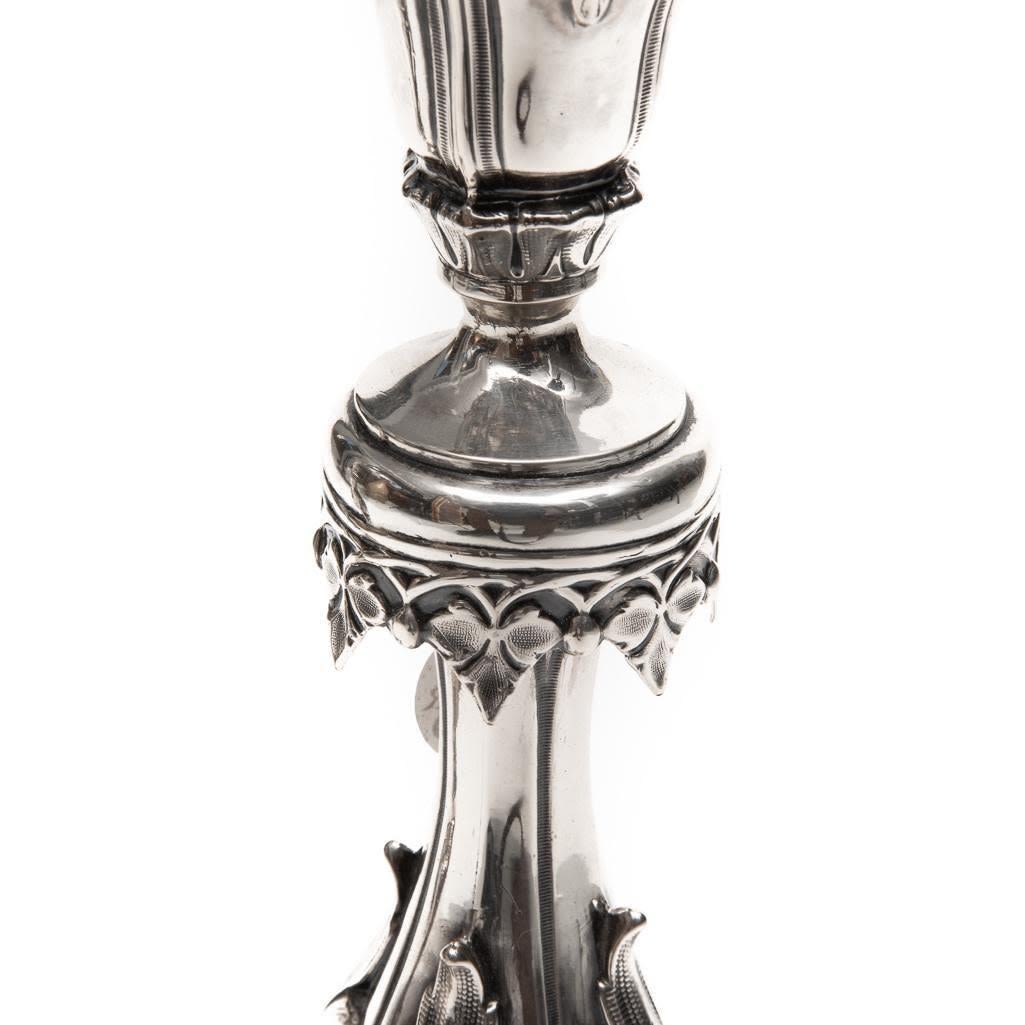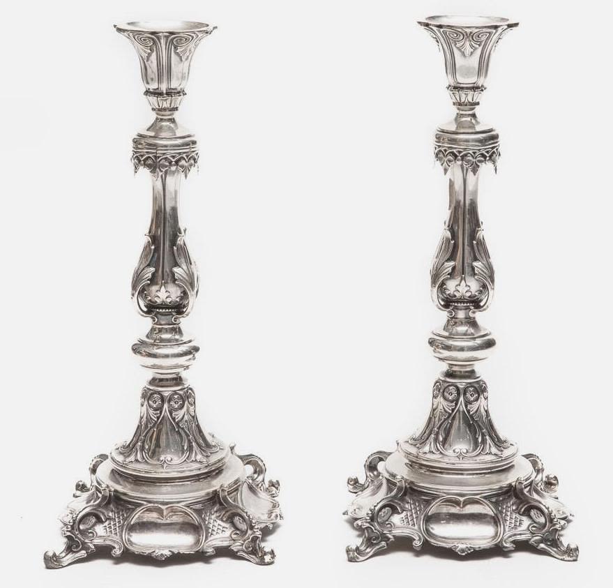 Pair of Russian .875 Silver Candlesticks, weighted, the elaborate base and shaft decorated with acanthus leaves and geometric motifs, stamped. 13.75"H. Good condition.