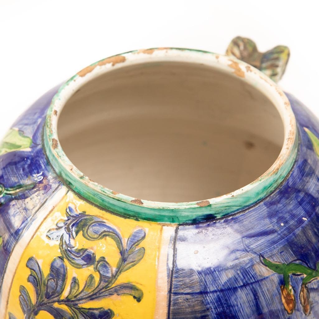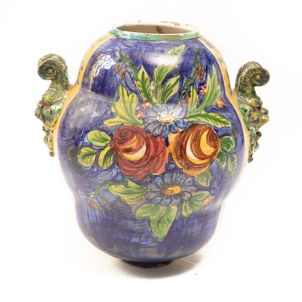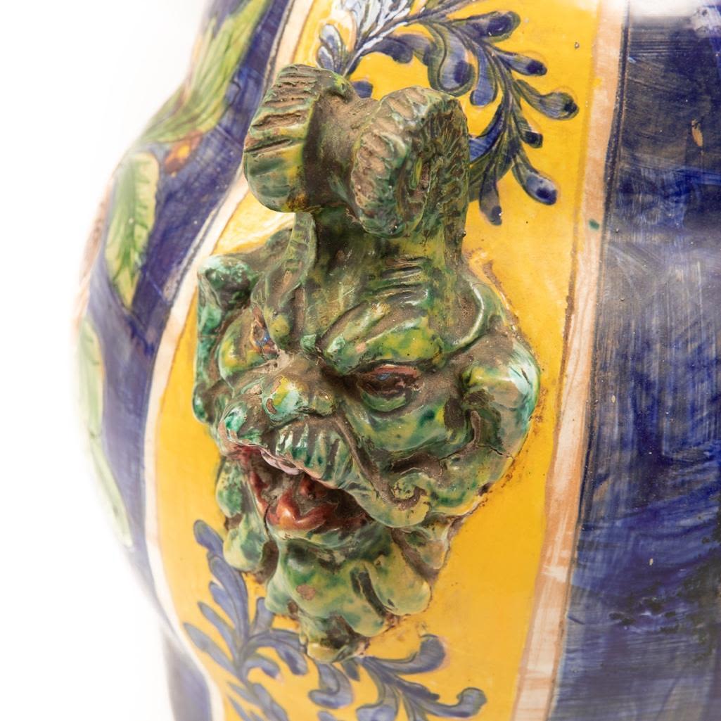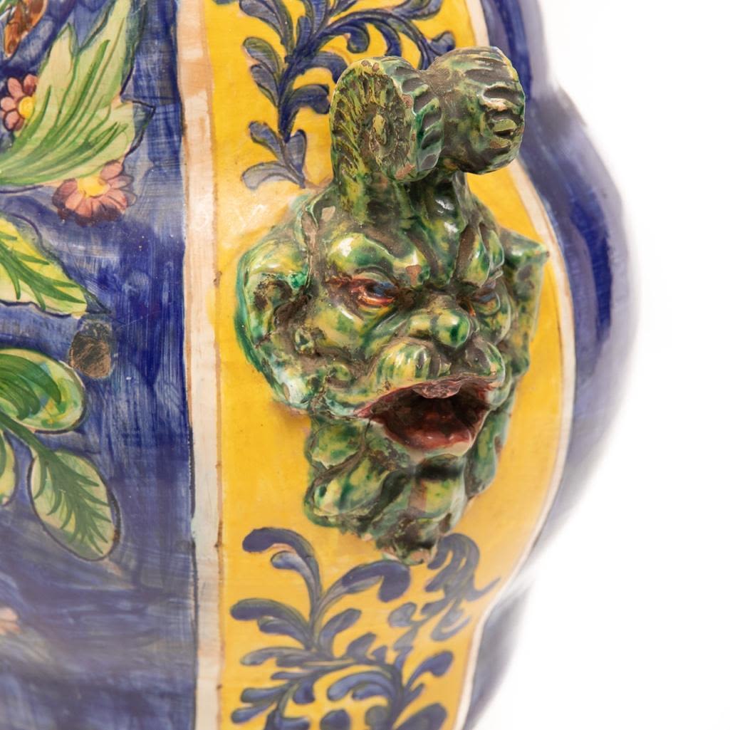 This Vintage Italian ceramic urn is hand painted using vibrant blues and yellows. It depicts foliage as the main subject and its handles are demons. There is some paint loss around the rim and in some other places around this vase but over all it is in good condition. The base does have a chip on the bottom. Considering the size the base of the vase is small so it can rock back and forth if knocked into. It measures 15"H x 16"W Approx. Good Condition overall. Some painloss and minor chips near edges on bottom and on top.