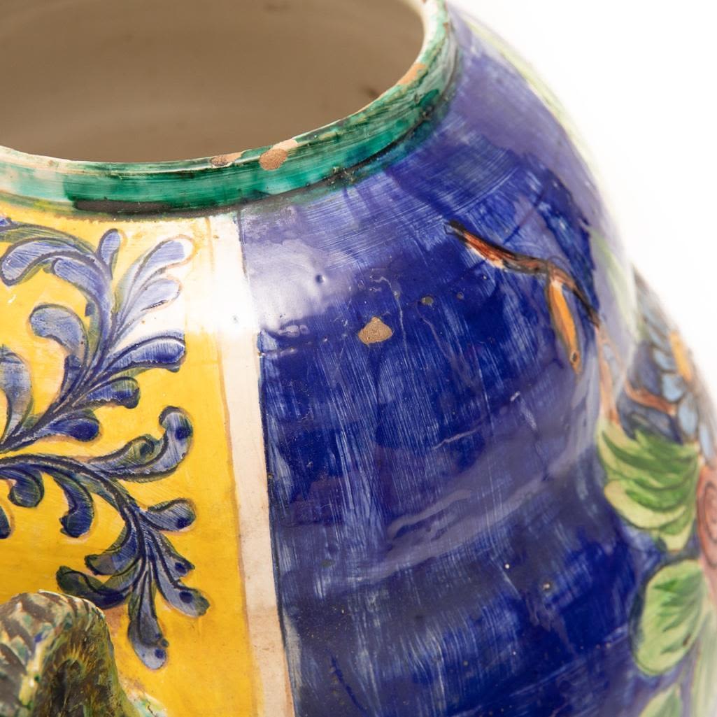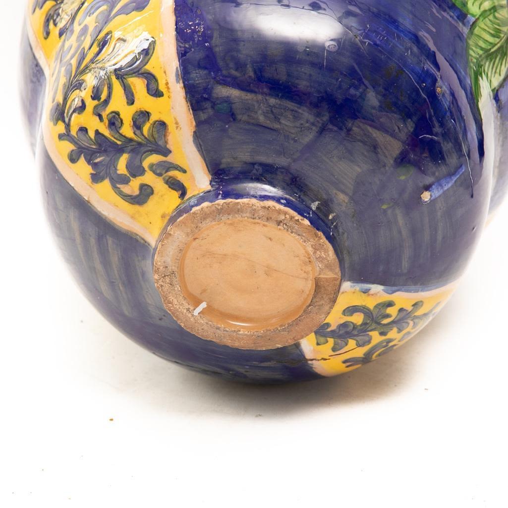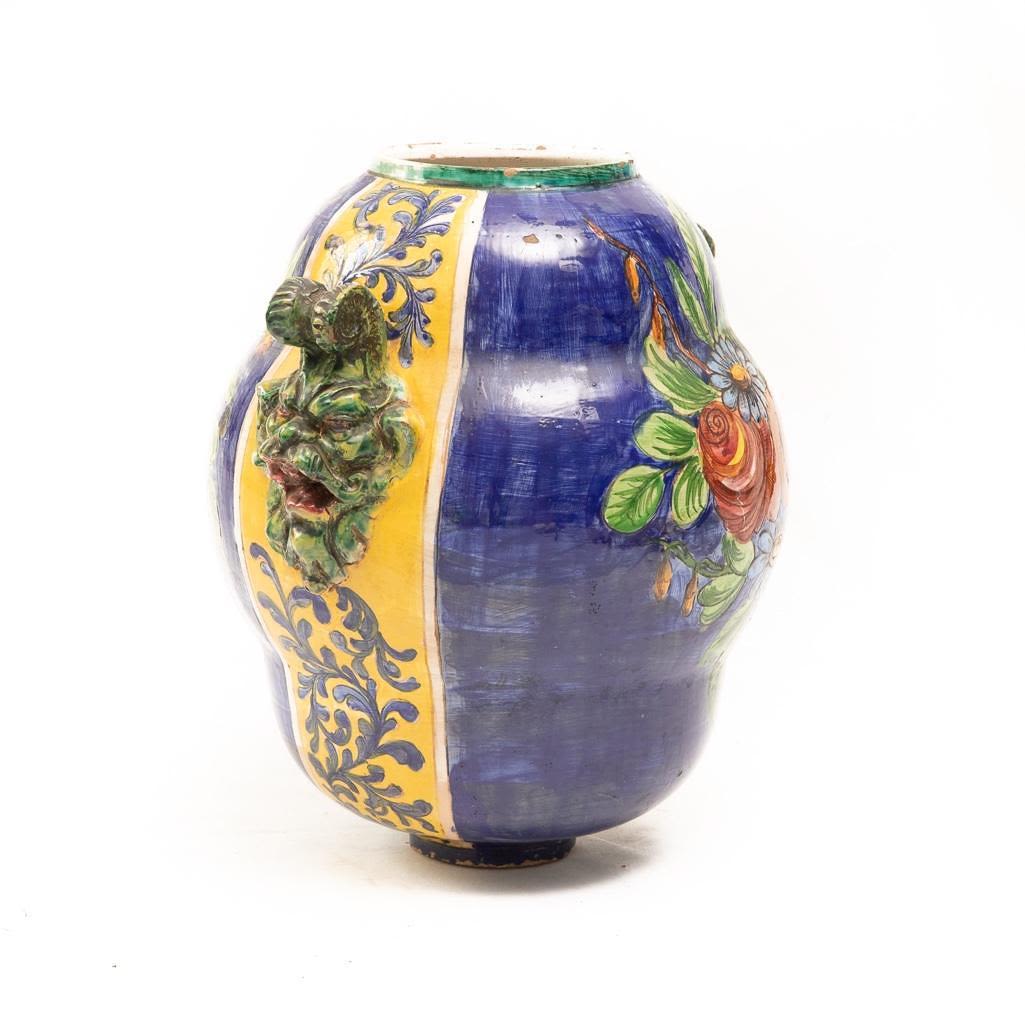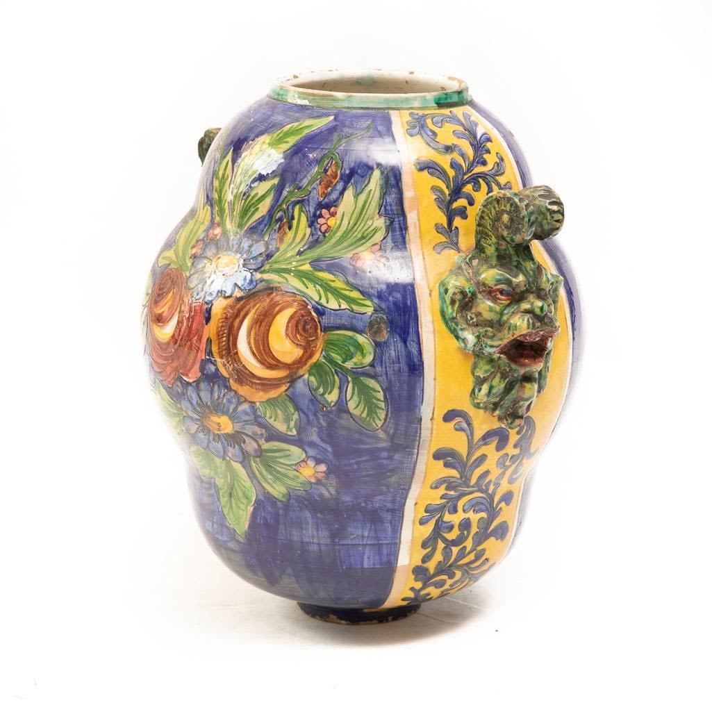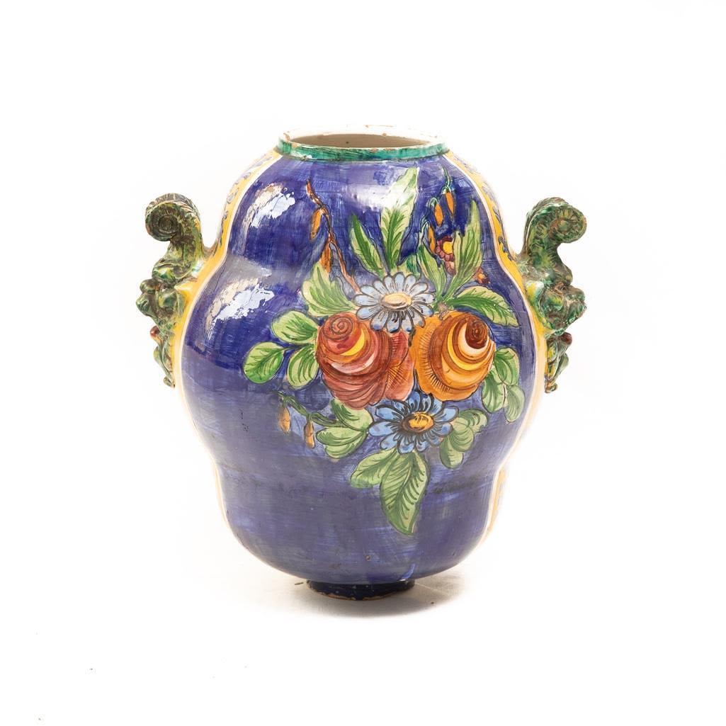 This Vintage Italian ceramic urn is hand painted using vibrant blues and yellows. It depicts foliage as the main subject and its handles are demons. There is some paint loss around the rim and in some other places around this vase but over all it is in good condition. The base does have a chip on the bottom. Considering the size the base of the vase is small so it can rock back and forth if knocked into. It measures 15"H x 16"W Approx. Good Condition overall. Some painloss and minor chips near edges on bottom and on top.