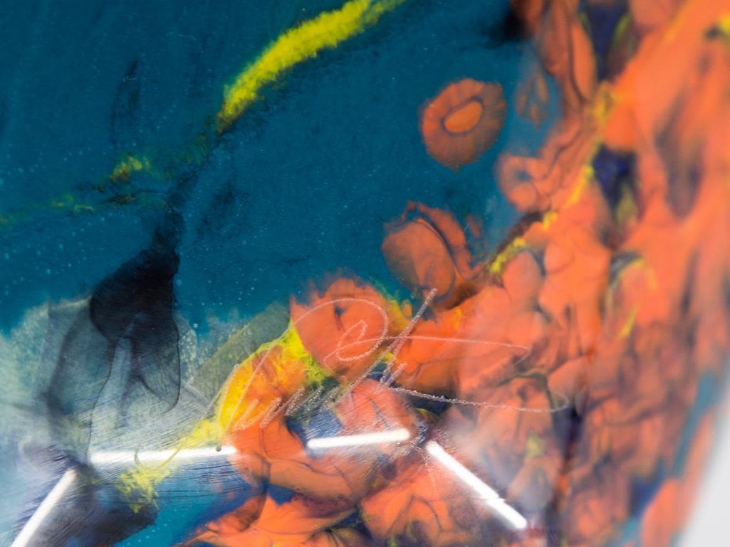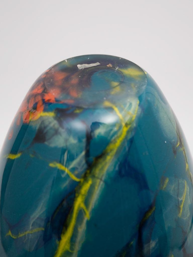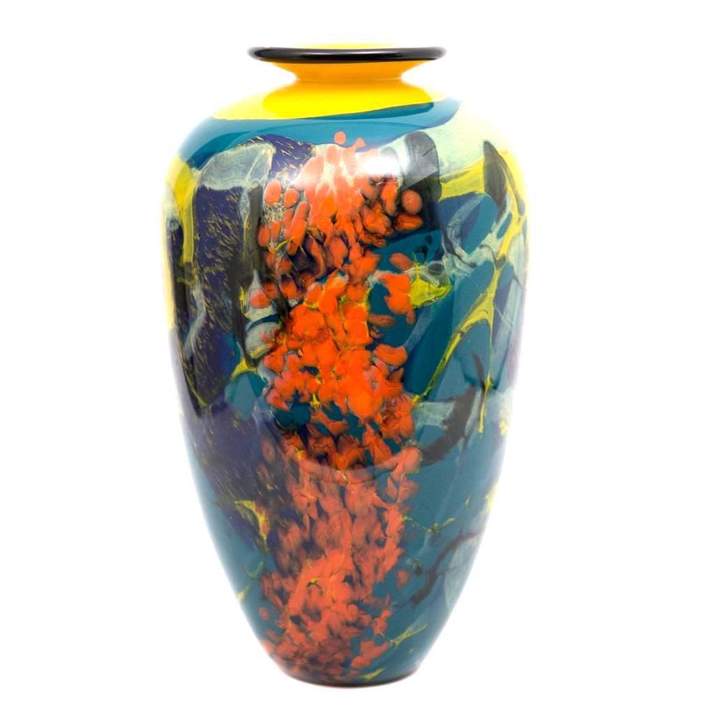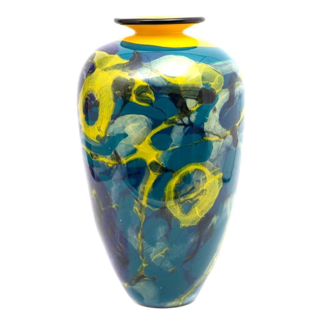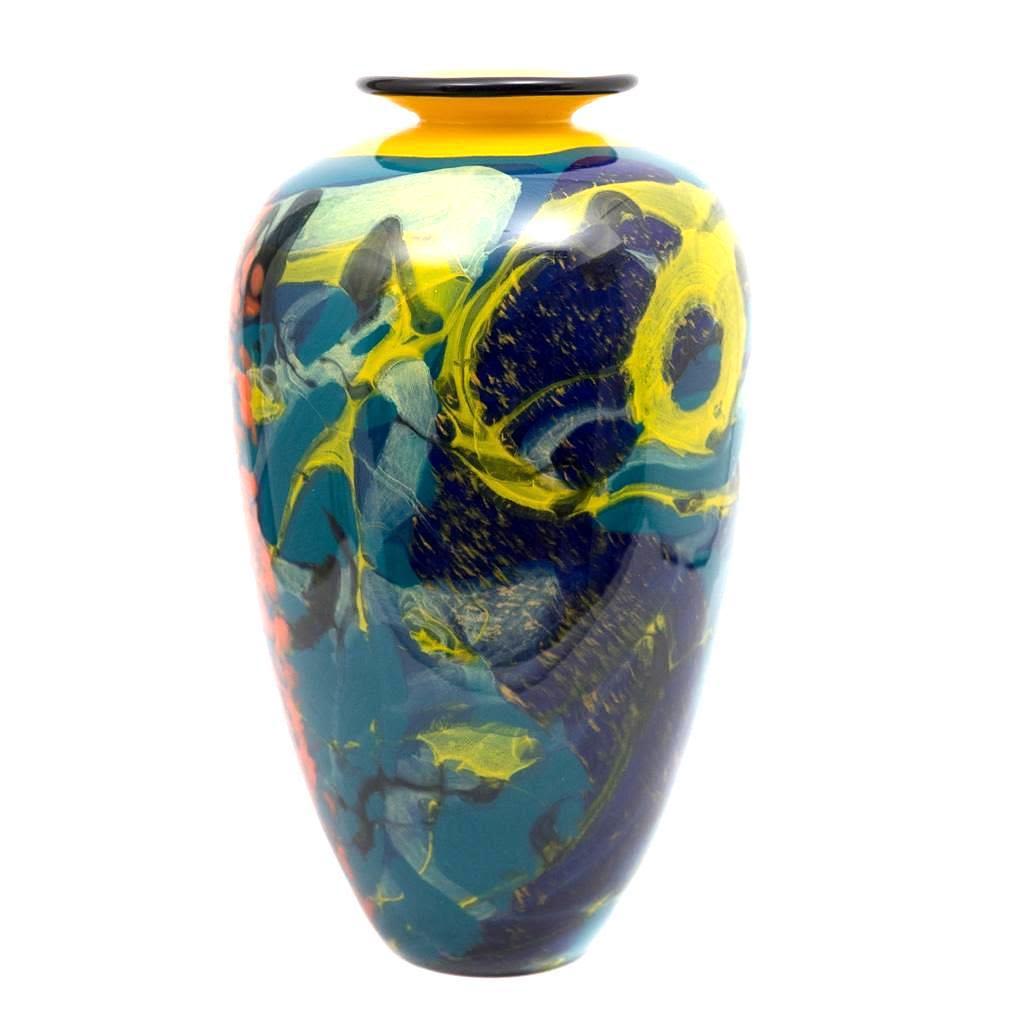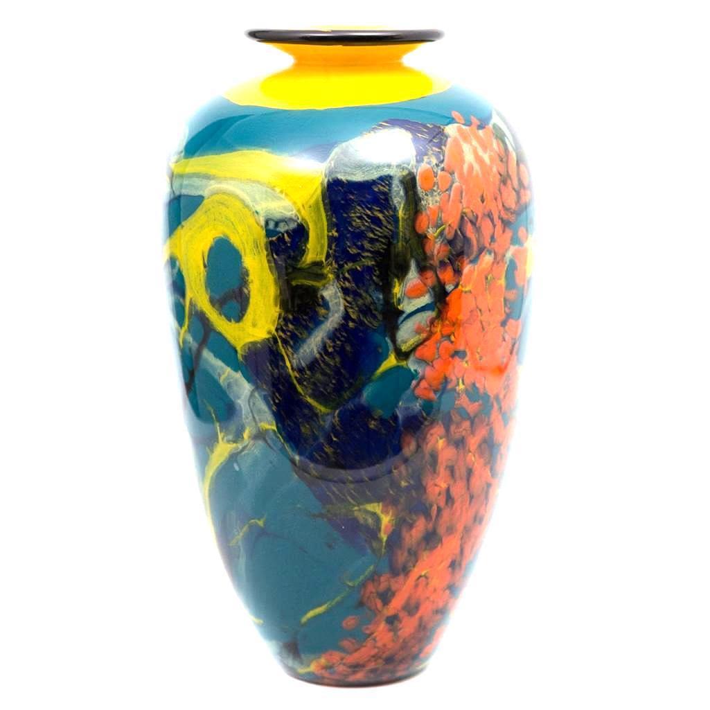 Ioan Nemtoi signed vase is a vibrant red yellow and blue work that was created by Ioan Nemtoi. The artist signed the vase. The vase has a black rim, yellow and red throughout, on a blue ground. Born in Romania in 1964 he attended the Academy at Bucharest, his works are now selling all over Europe and the USA and being shown in major art exhibitions and private collections and maintains a permanent exhibit at a dedicated Ioan Nemtoi Gallery in Soho, New York. The vase measures H 19 in. x Dm 9.5 in.