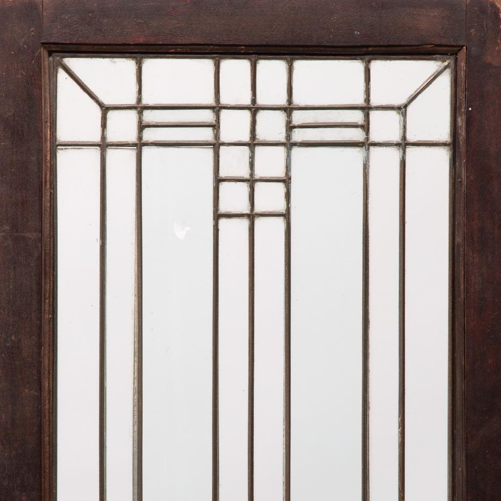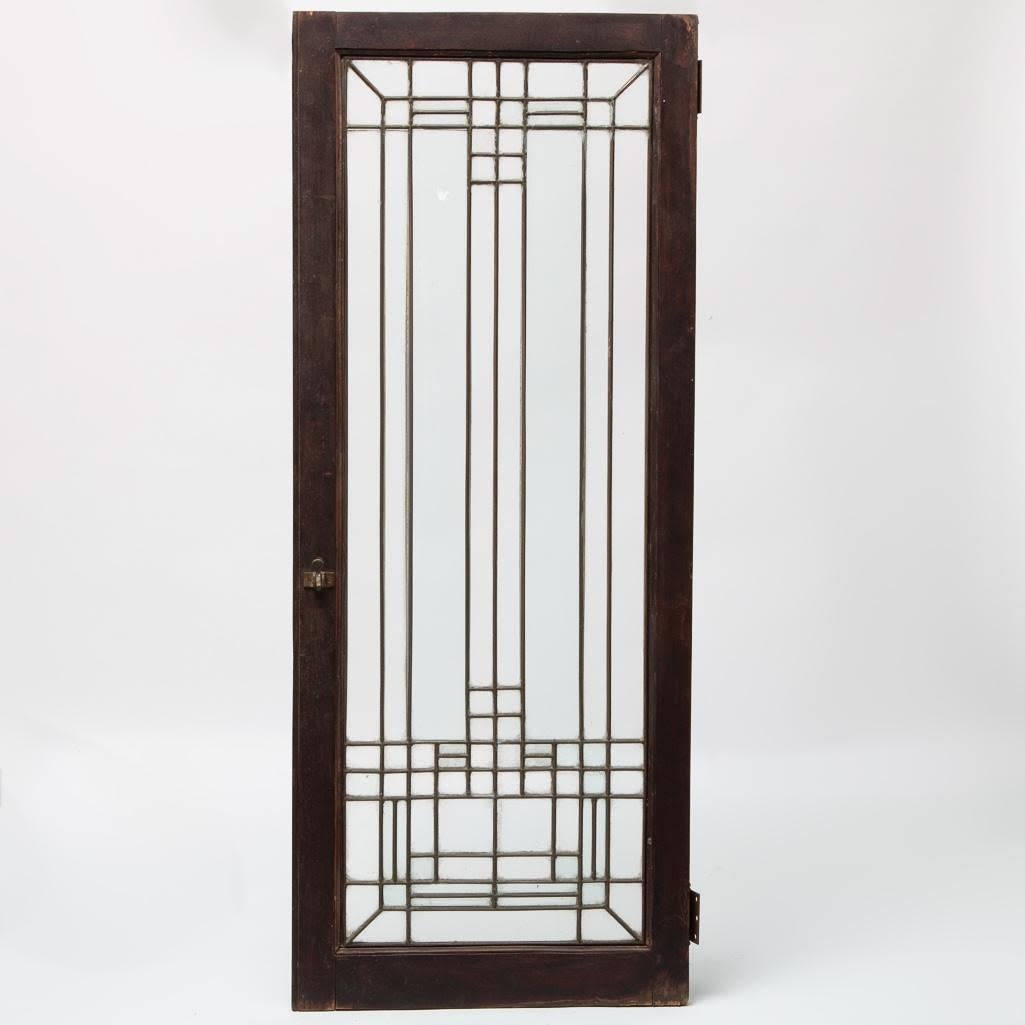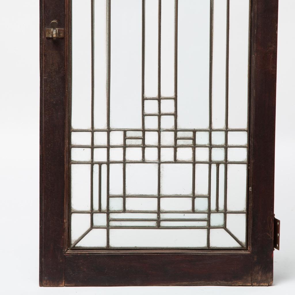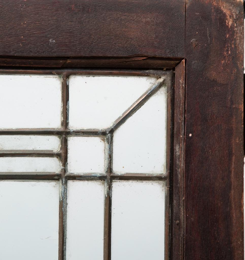 Frank Lloyd Wright style prairie design leaded glass windows. Vintage Early 20th Century Circa 1910 ht. 46, wd. 18 1/2, dp. 3/4 in. Some loose panes. Areas of water stain on frames. Looseness in frames.