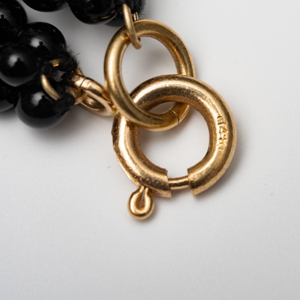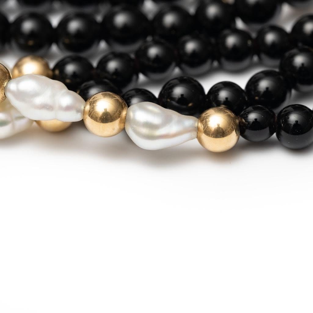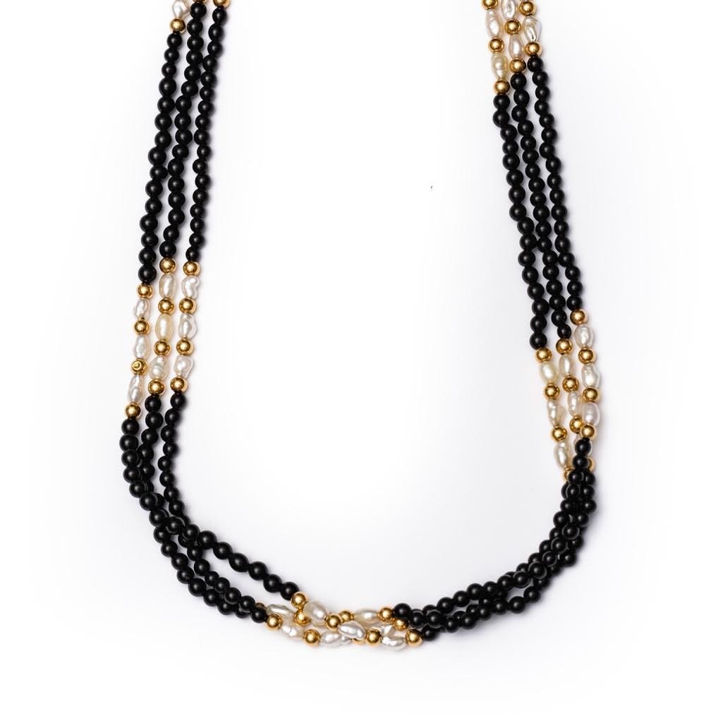 3 strand onyx and pearl necklace with 14 kt gold accents. Measure 17"L approx This lot is accompanied by a GIA appraiser letter from an independent and well respected firm established over 75 years ago.