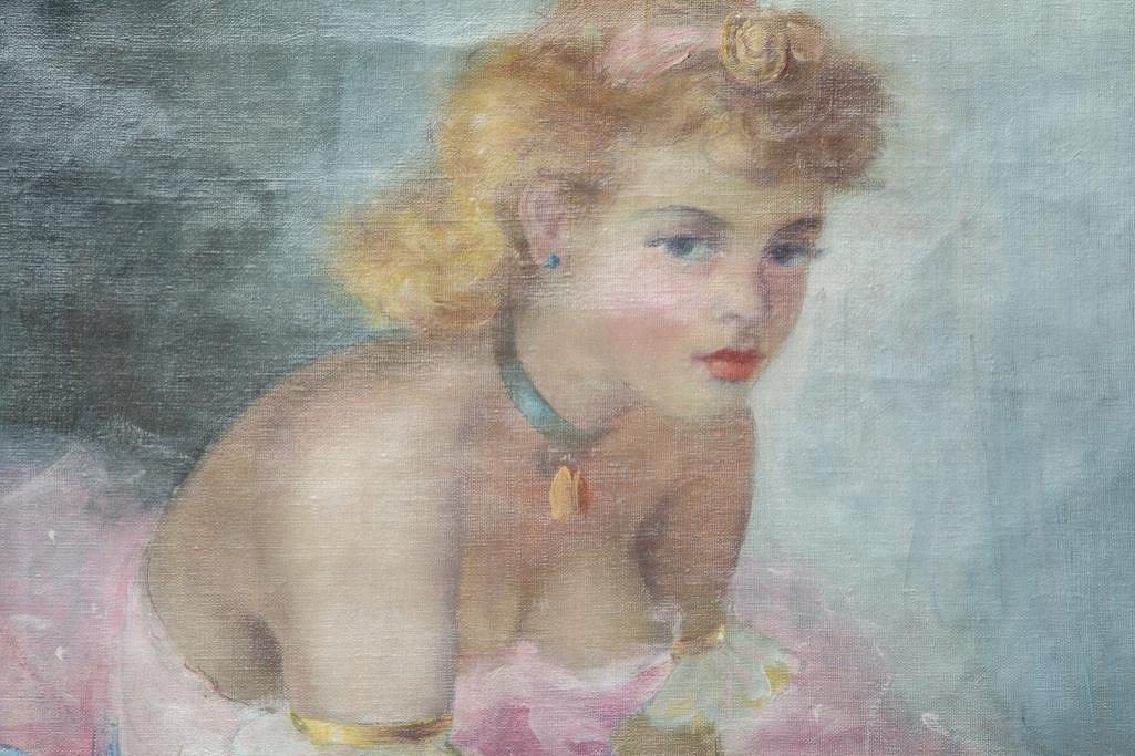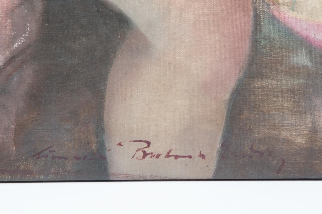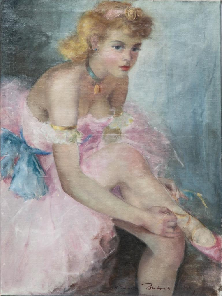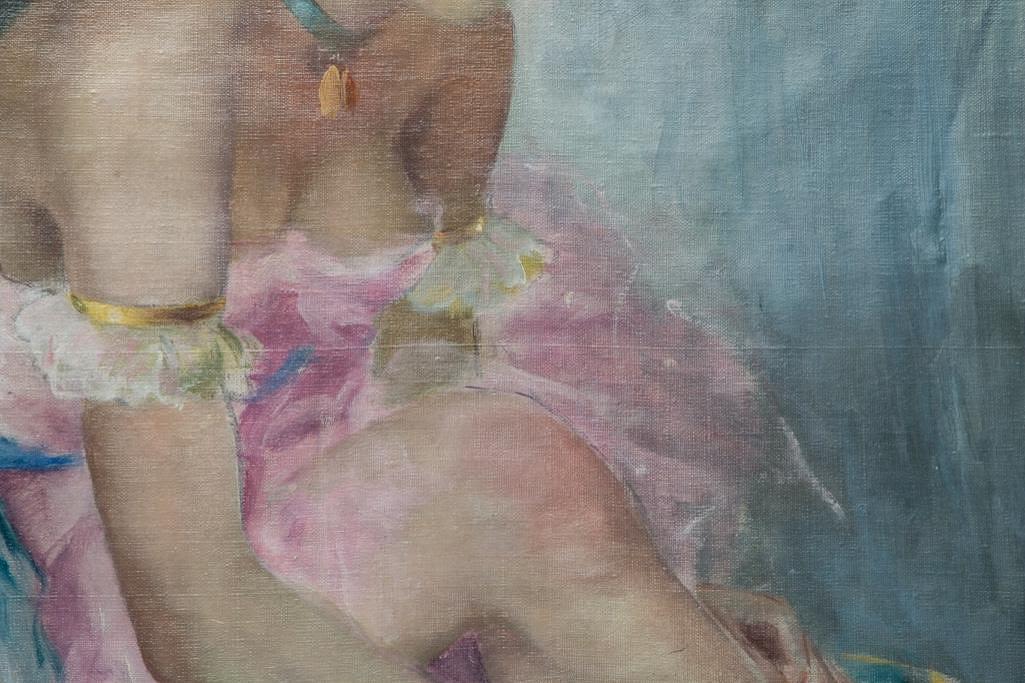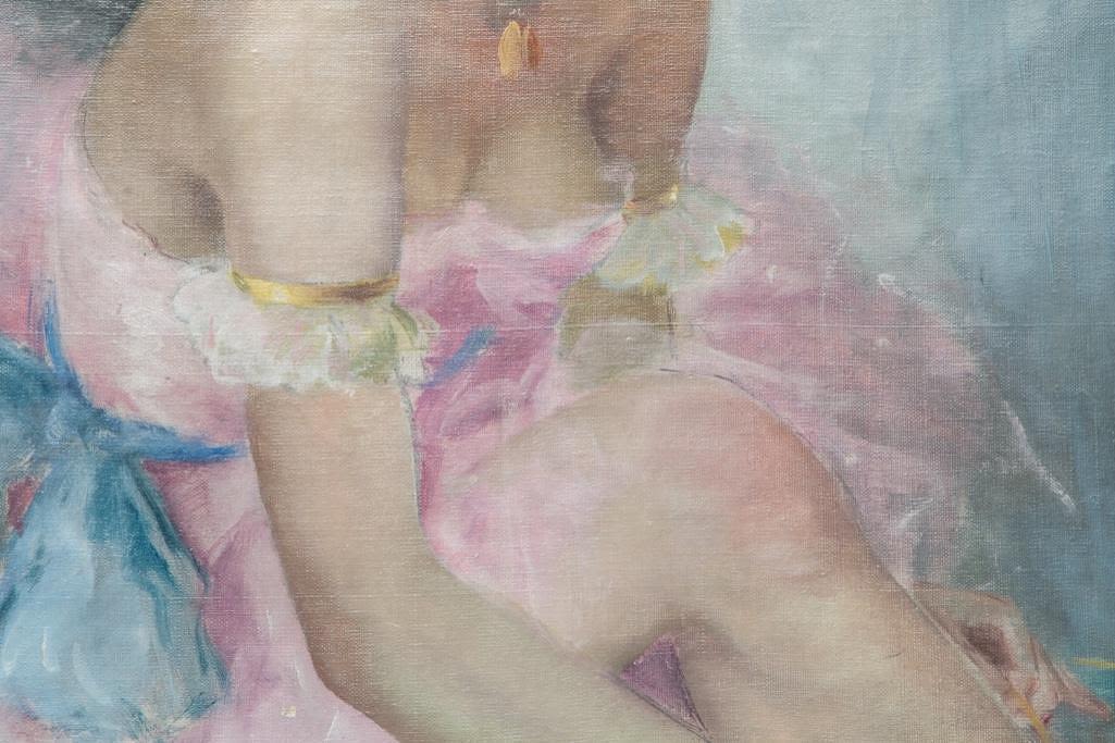 Impressionist oil on canvas of ballerina putting on slippers circa 1900’s signed but I cannot make it out. 23" x 31" Good condition. Visible restoration.