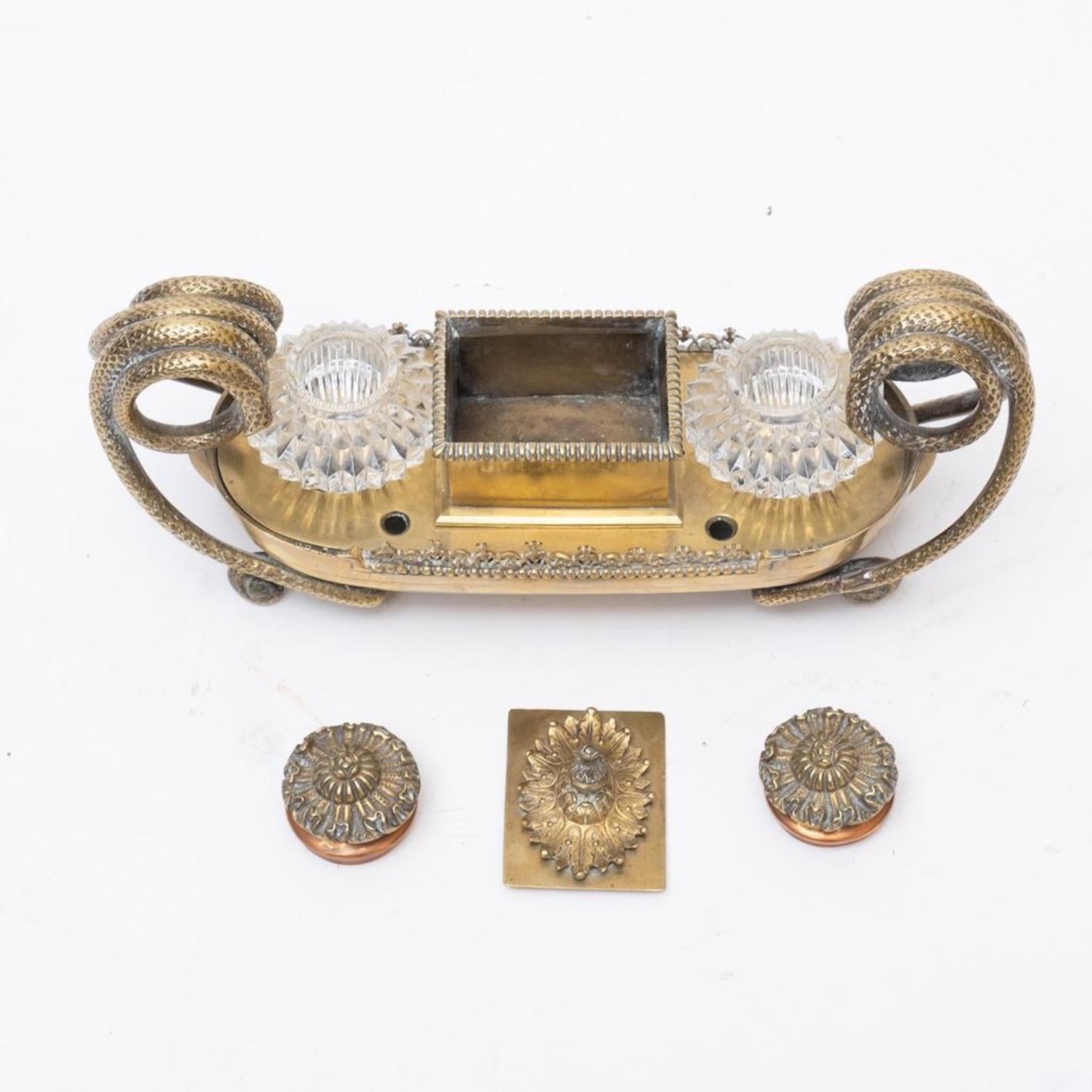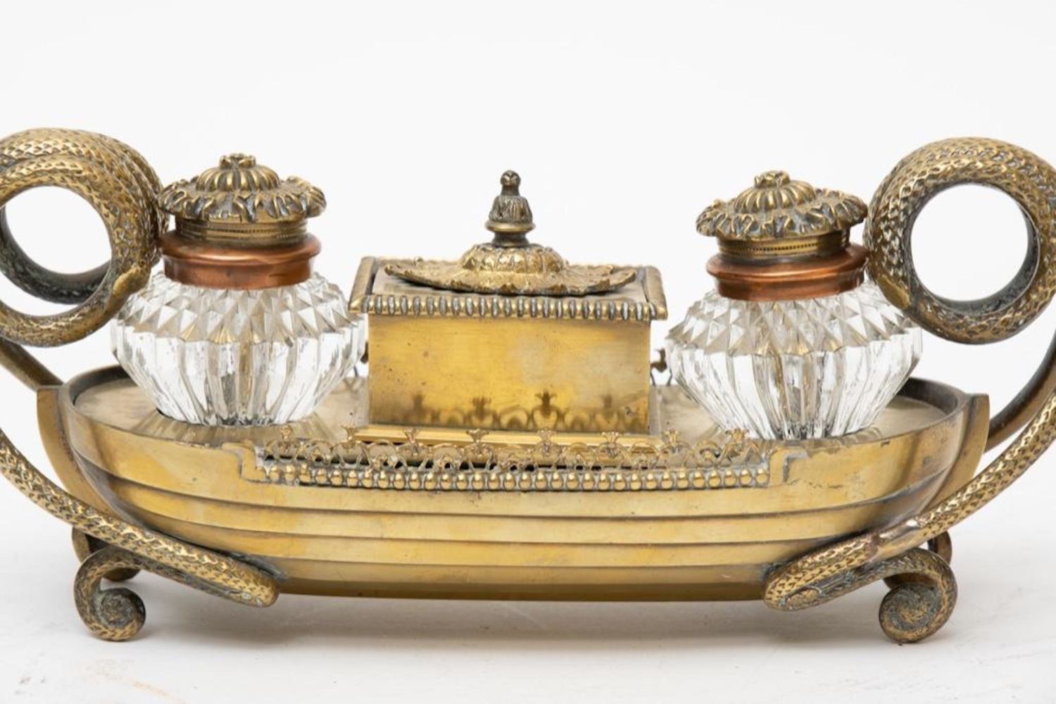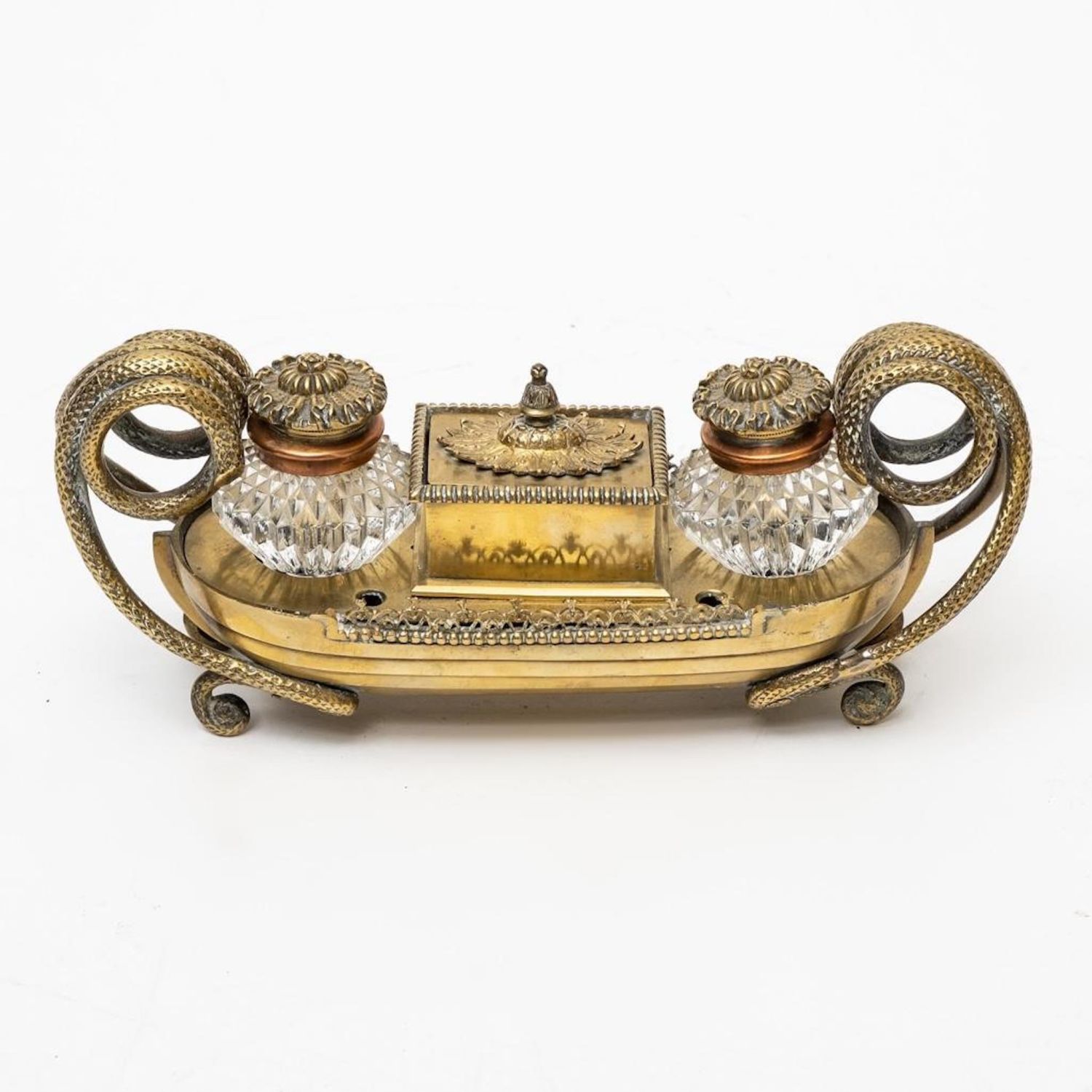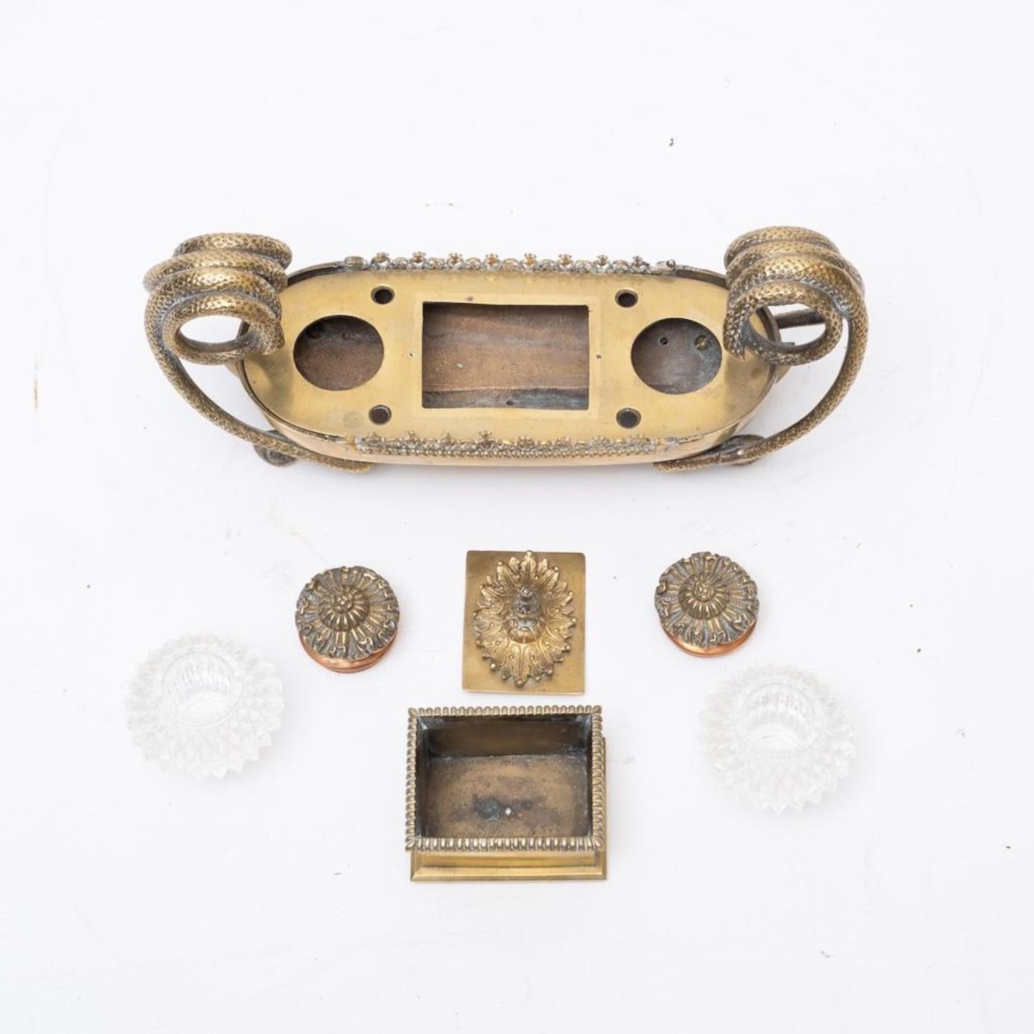Napoleonic empire bronze and glass desk set with inkwells and pen holes Circa 1840. No visible markings. Measures 11"W x 4.5"H x 3.25"D good condition overall