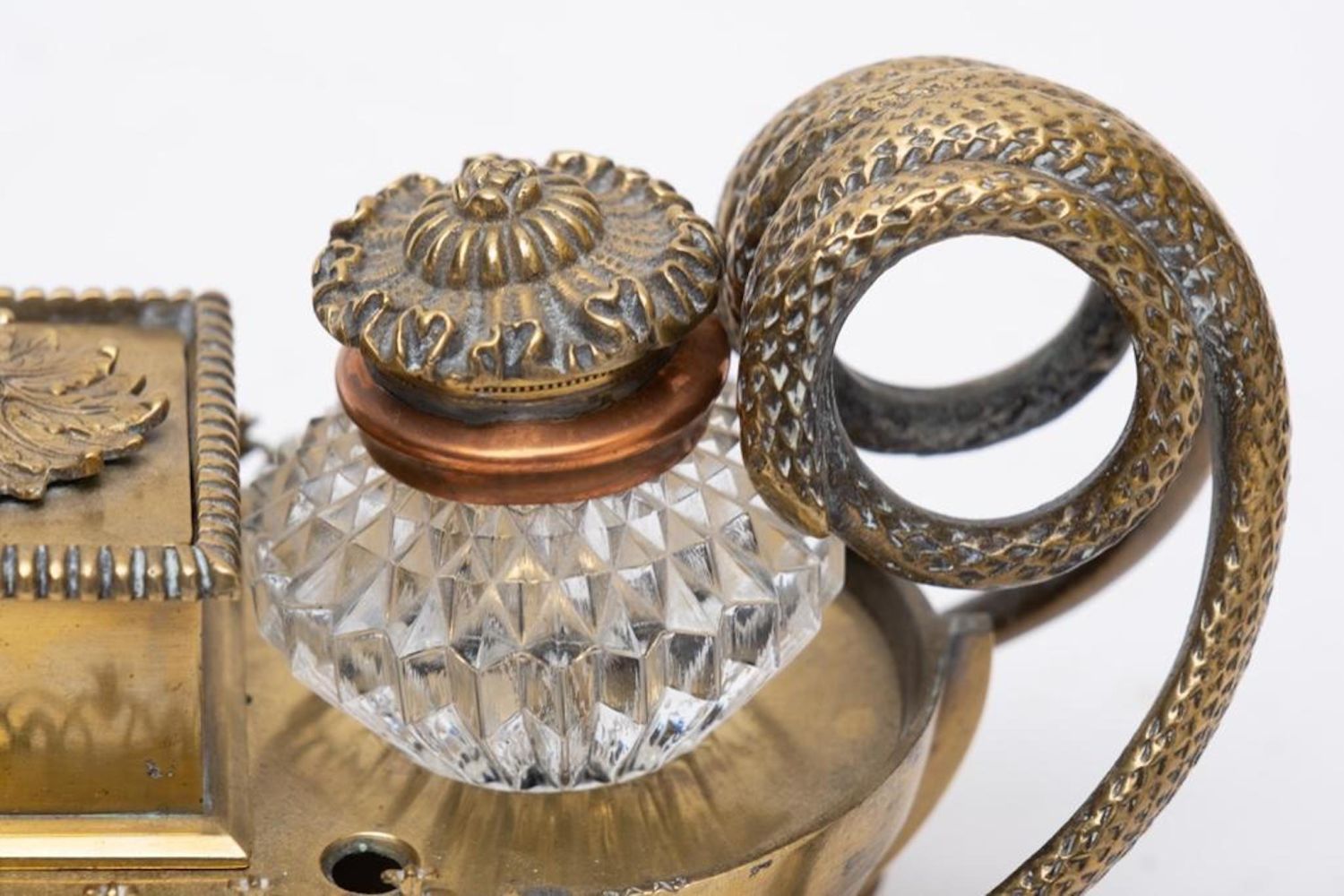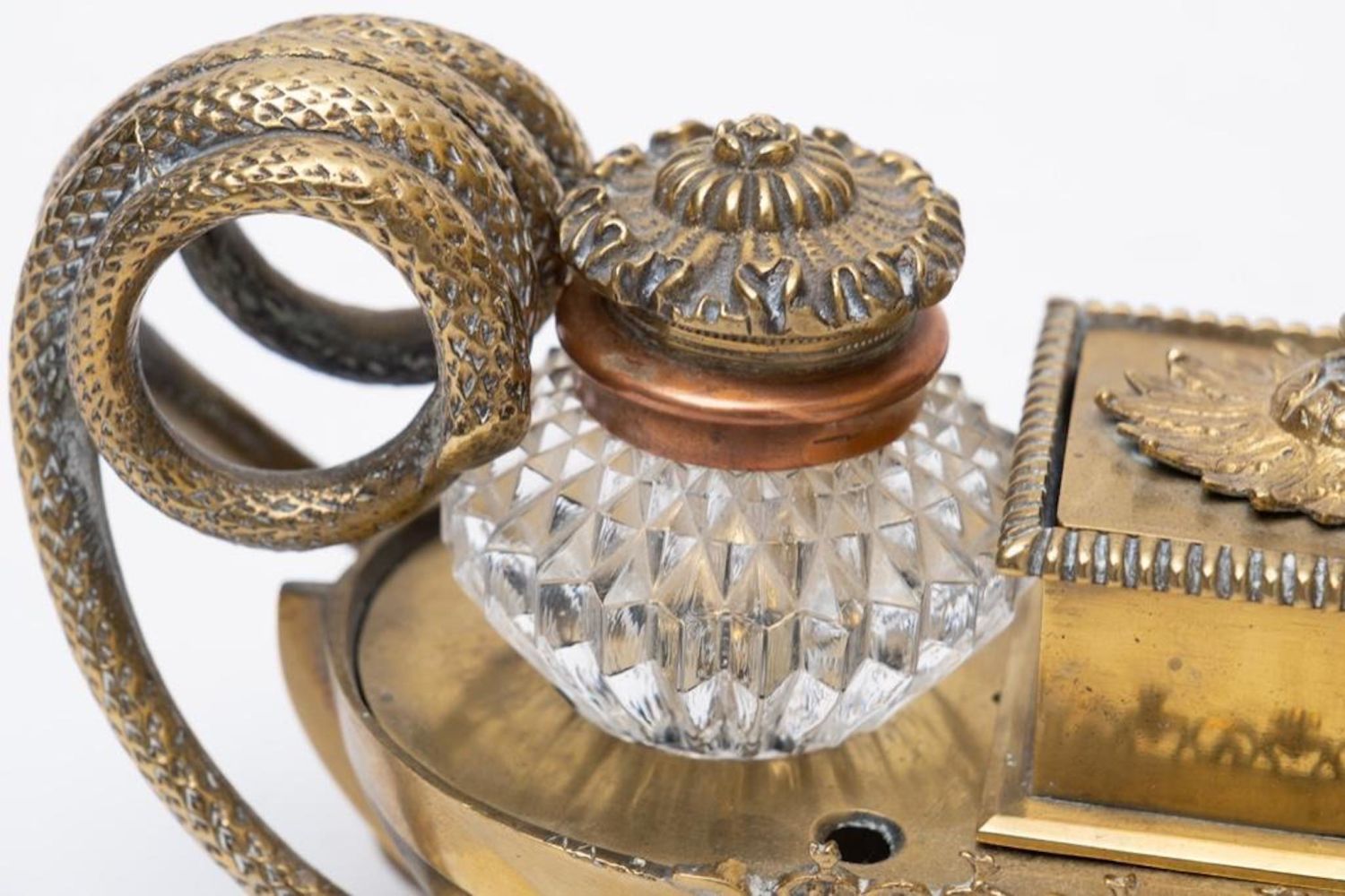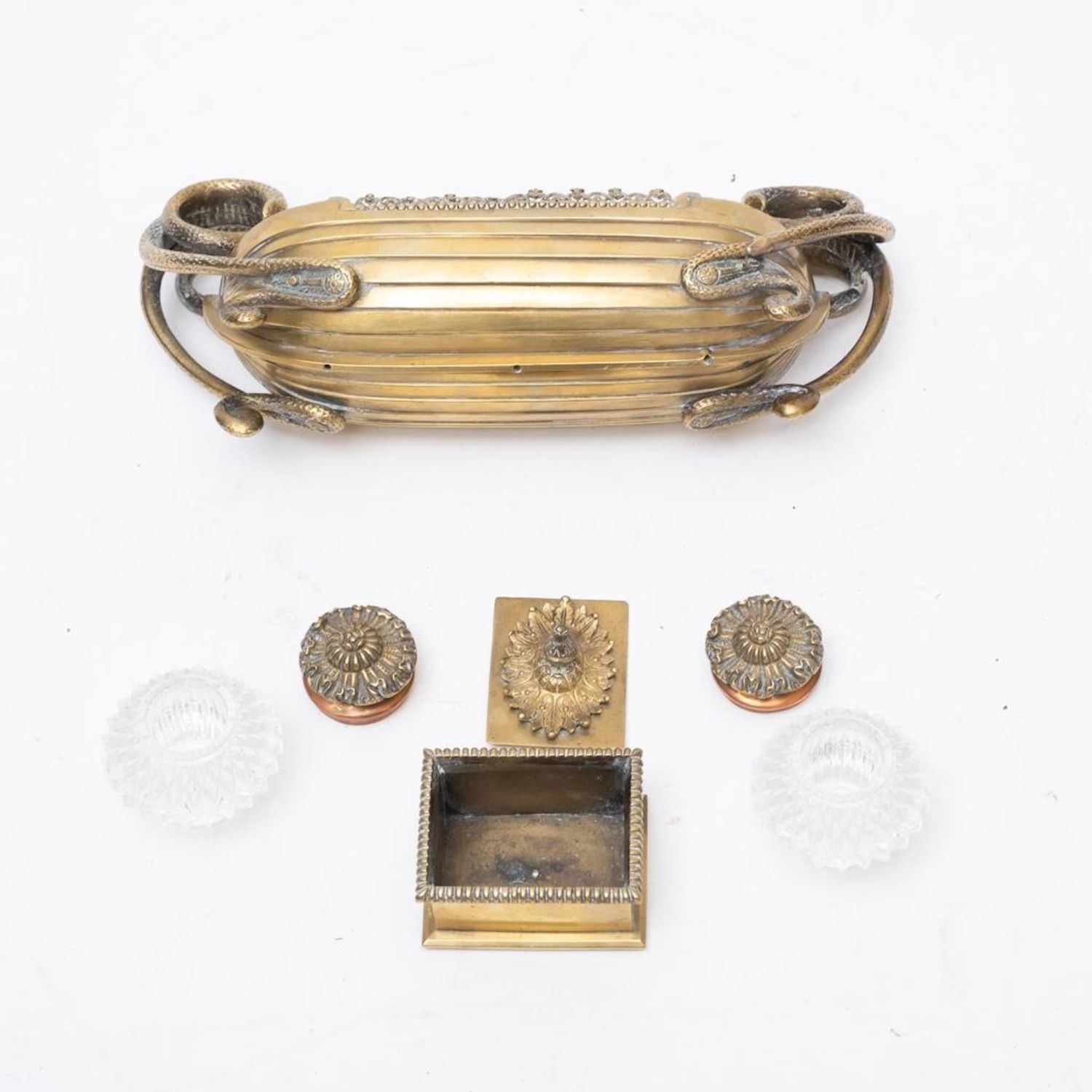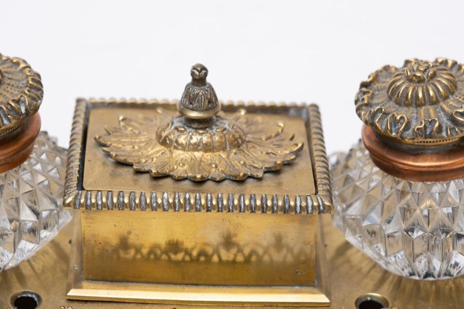 Napoleonic empire bronze and glass desk set with inkwells and pen holes Circa 1840. No visible markings. Measures 11"W x 4.5"H x 3.25"D good condition overall
