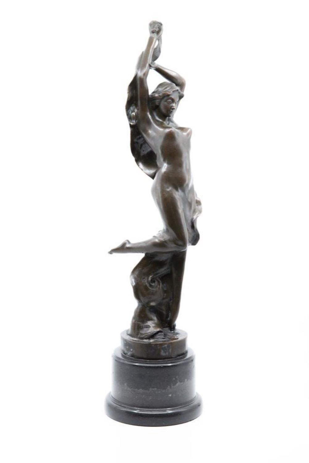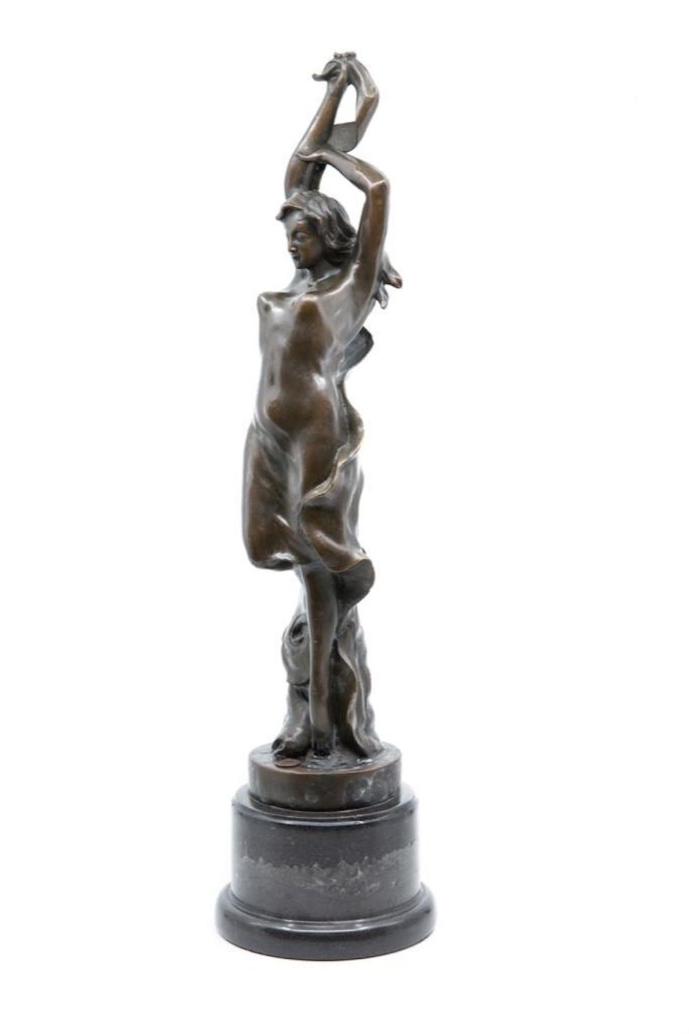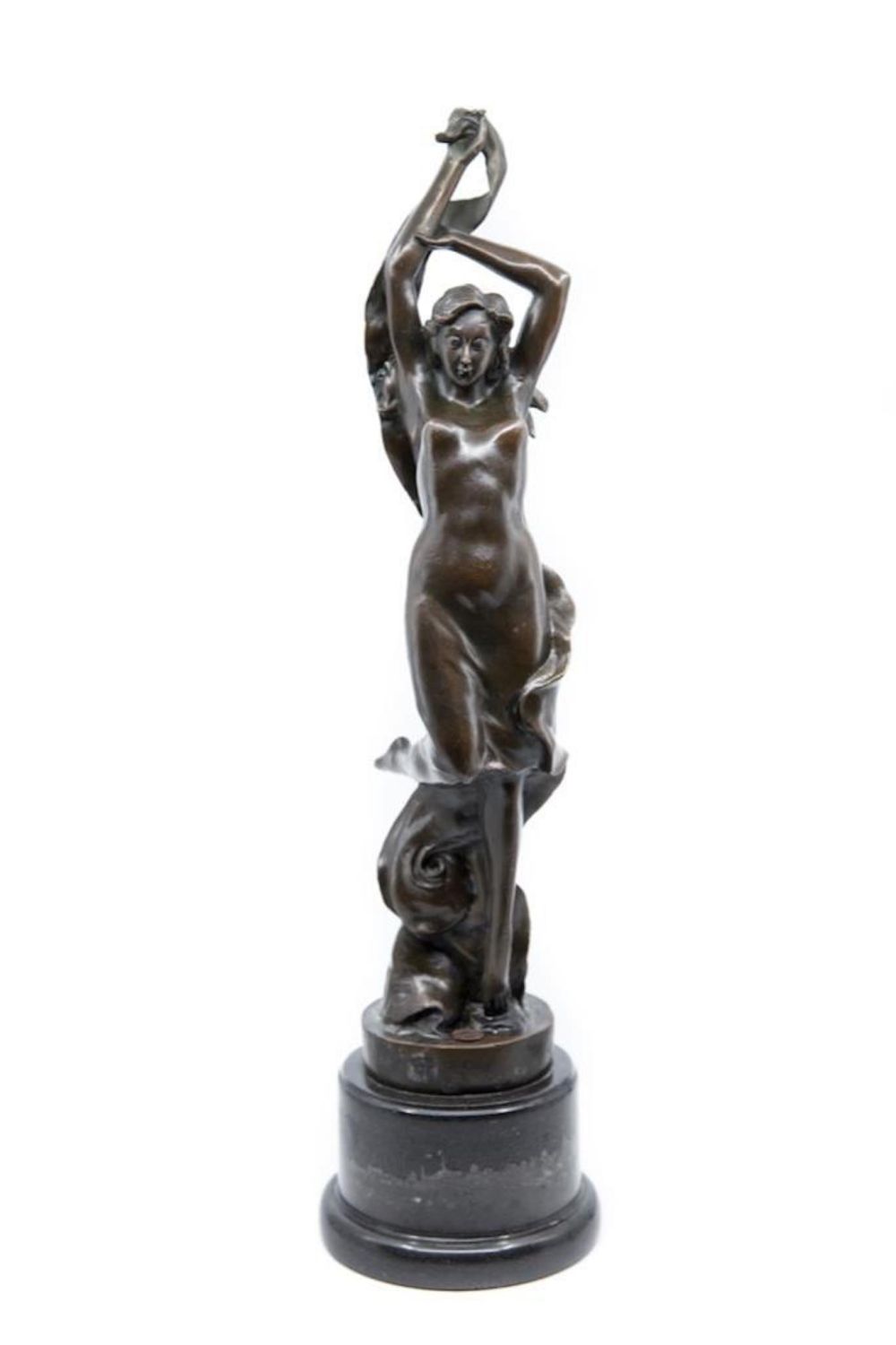 vintage art nouveau art deco 20th century bronze figure of a female dancer in chemise with long scarf on marble plinth. signature Mark on Base. 21" ht approx. Good condition. Great Bronze. overall good condition