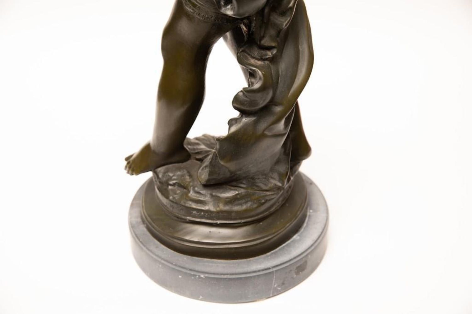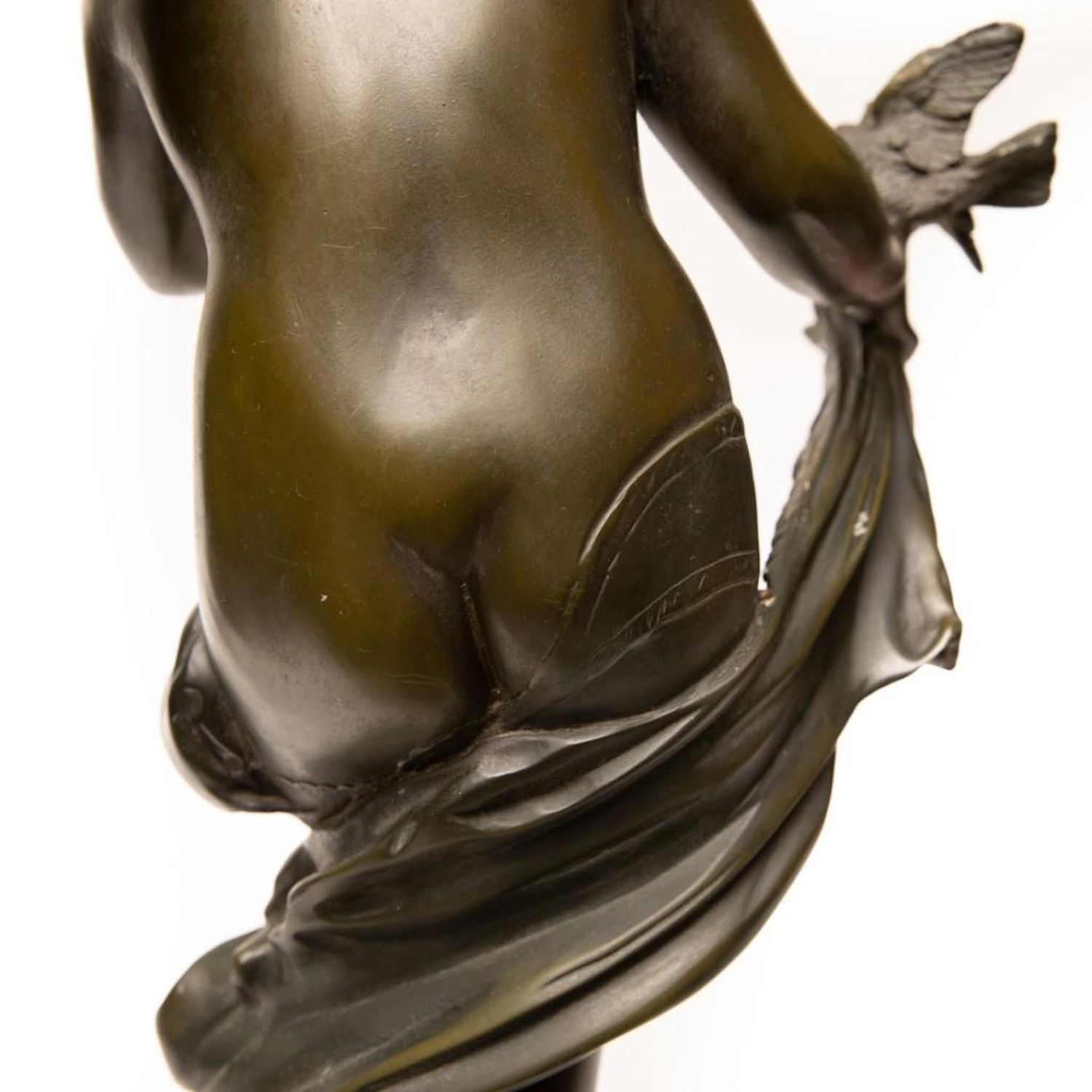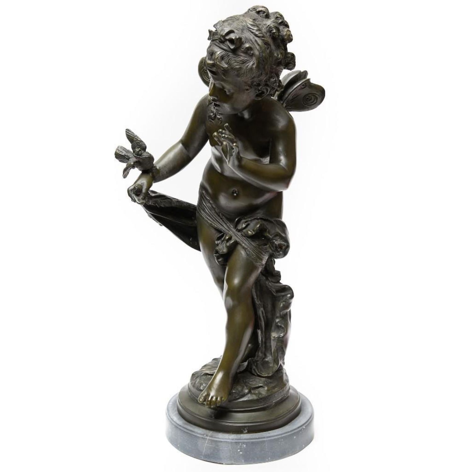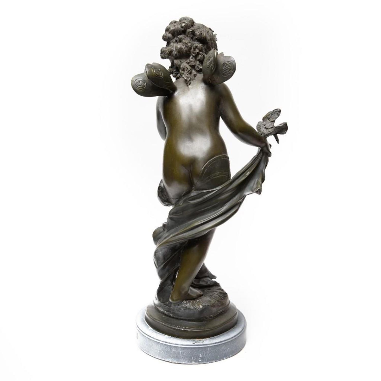 Tall Auguste Moreau Bronze Sculpture of a Young Psyche signed Auguste Moreau, green patination, inscribed signature, mounted atop a gray marble plinth, ht. 28 1/4" x 11"W x 11"D approx. overall good condition
