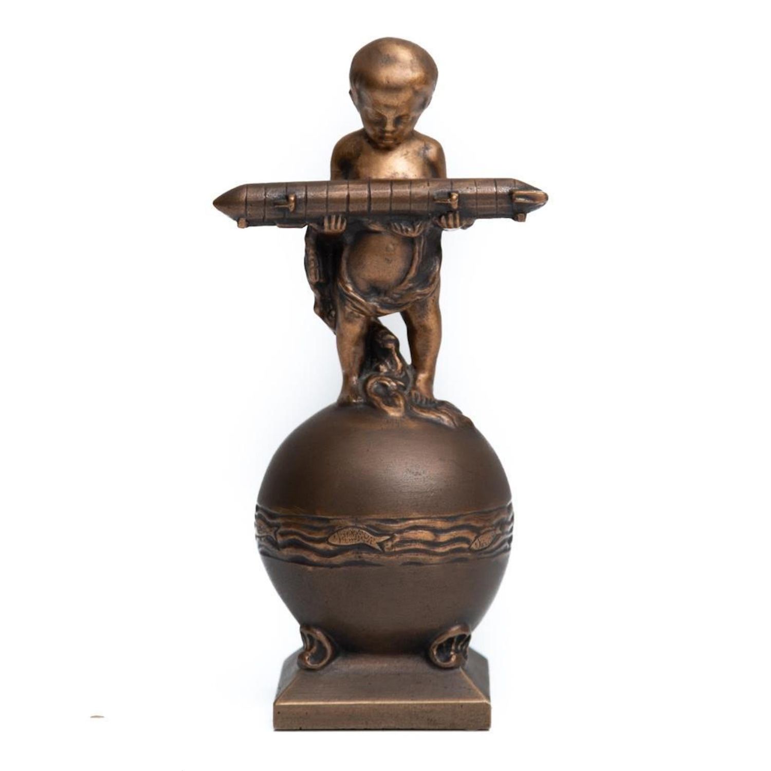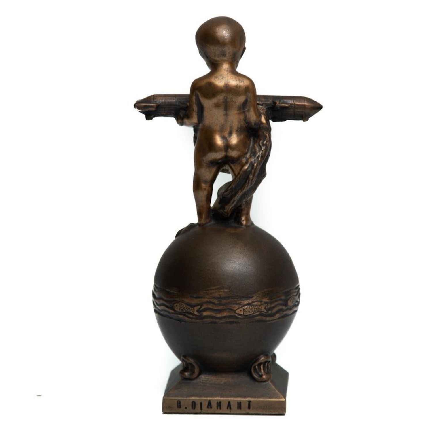 Bruno Diamant Bronze boy w/ Zeppelin, c1909. This piece waas modeled after the Zeppelin fountain in Friedrichshafen which was made by Diamant. The monument is a fountain honoring Graf Ferdinand von Zeppelin and this miniature was made to celebrate its unveiling . Height: 6.5" From wiki: Bruno Diamant (born May 3, 1867 in Friedrichshafen, December 1, 1942 in Munich) was a German sculptor. The son of a train driver enrolled at the Academy of Fine Arts in Munich in 1881 and began his studies with Syrius Eberle. In 1889 the bronze bust of Emperor Wilhelm I, made according to his designs, was erected in his hometown, followed in 1895 by a memorial stone for Gustav Schwab. The relief is embossed in copper. Both plants have been on the Friedrichshafen waterfront since 1912. Another work by Diamant in his hometown was the Zeppelin fountain, carved from Lyon limestone, which was inaugurated in 1909. As a fountain figure he showed a boy standing on a globe with an airship in his arms. The fountain was removed from its location in front of the town hall in 1956, but its upper part was integrated into a smaller fountain on Friedrichshafen Kirchplatz from 1961 to 2000. In 2000, the fountain was reconstructed in its original form and placed on the bank. overall good condition