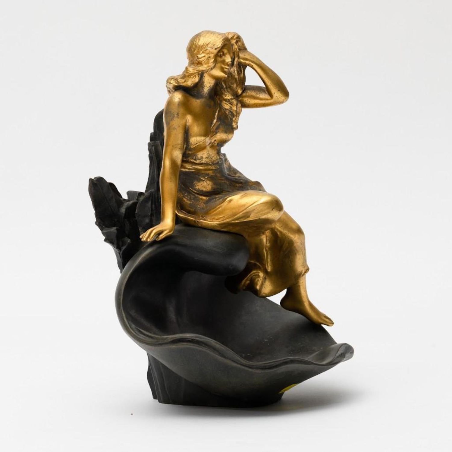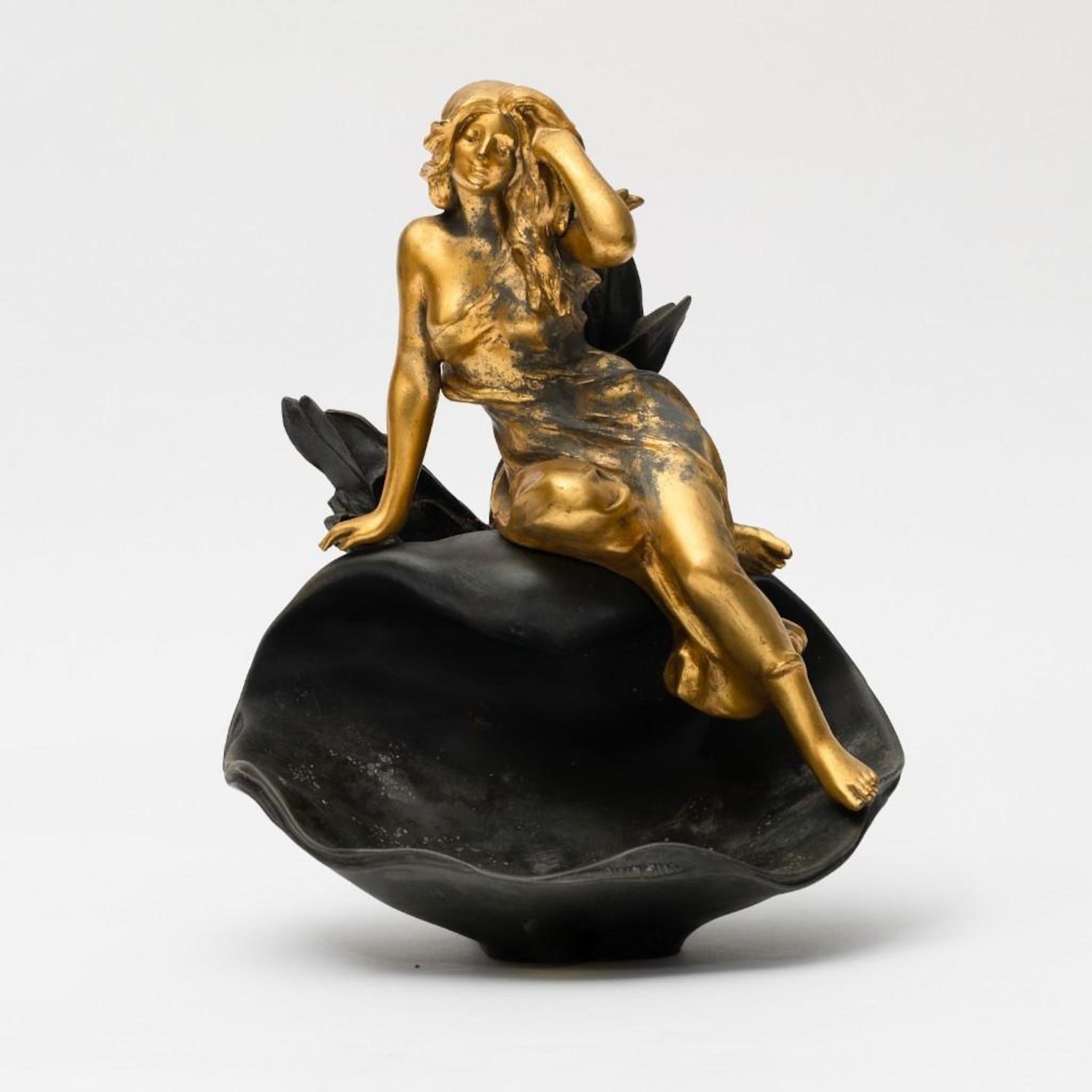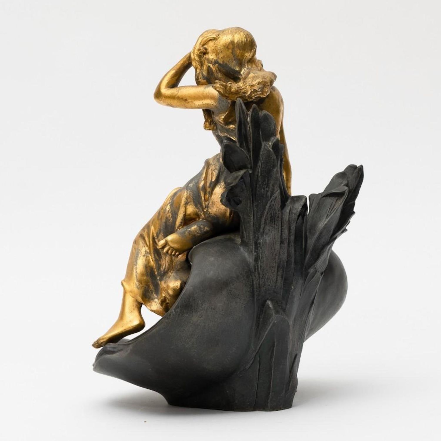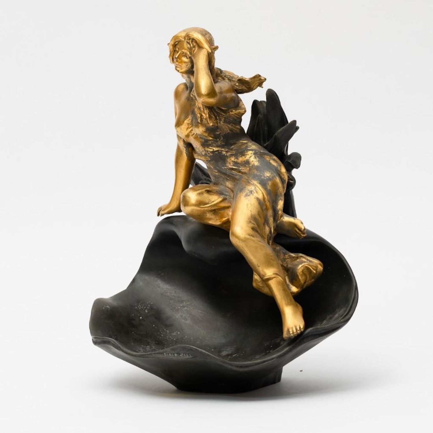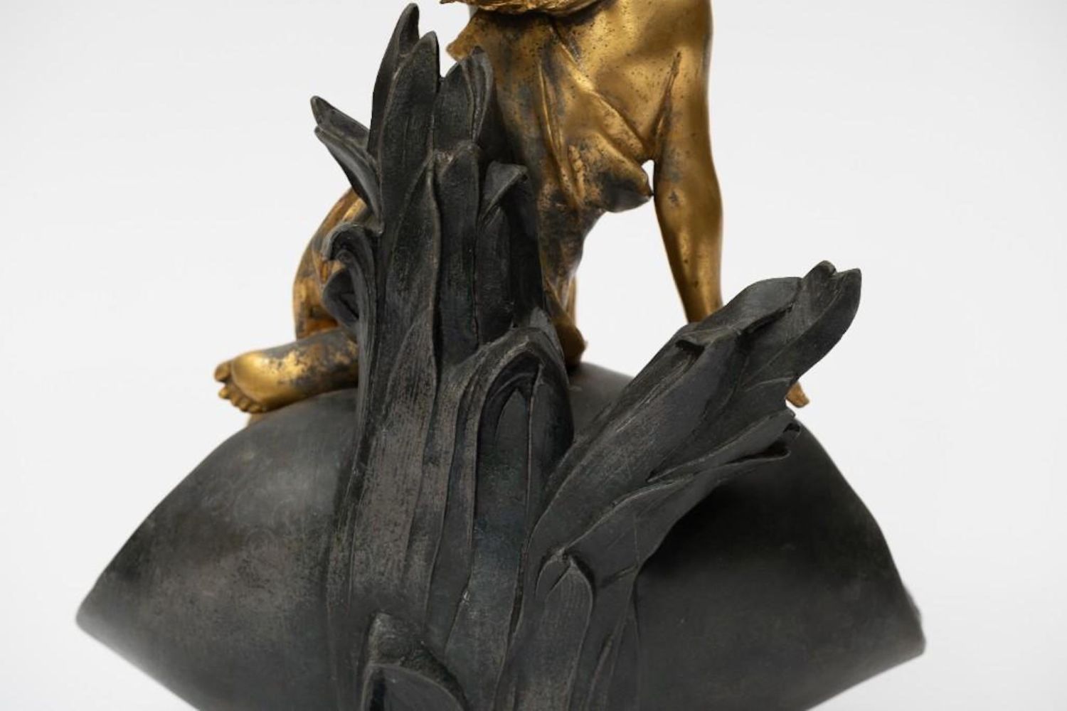 Julian Causse Signed Sculpture late 19th century, gilded nymph on a dark green finish shell with aquatic plants, marked "J. Causse" on shell, Measures 12"h x 10"W overall good condition