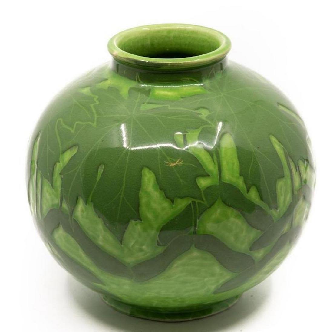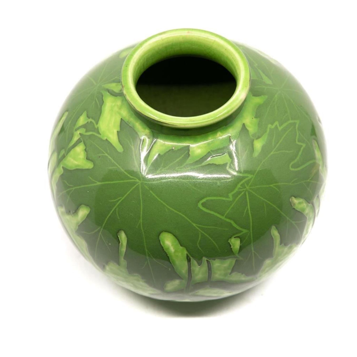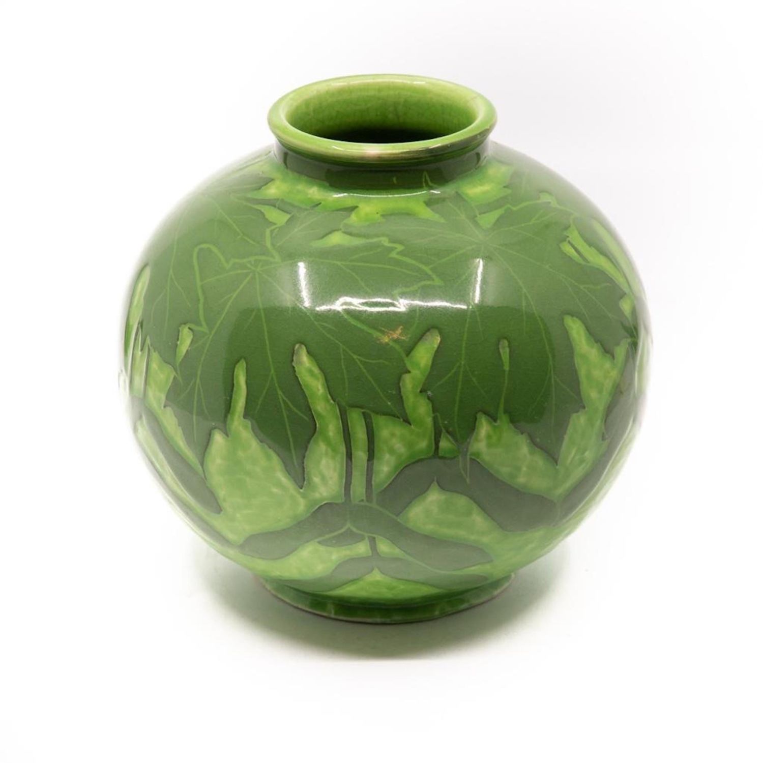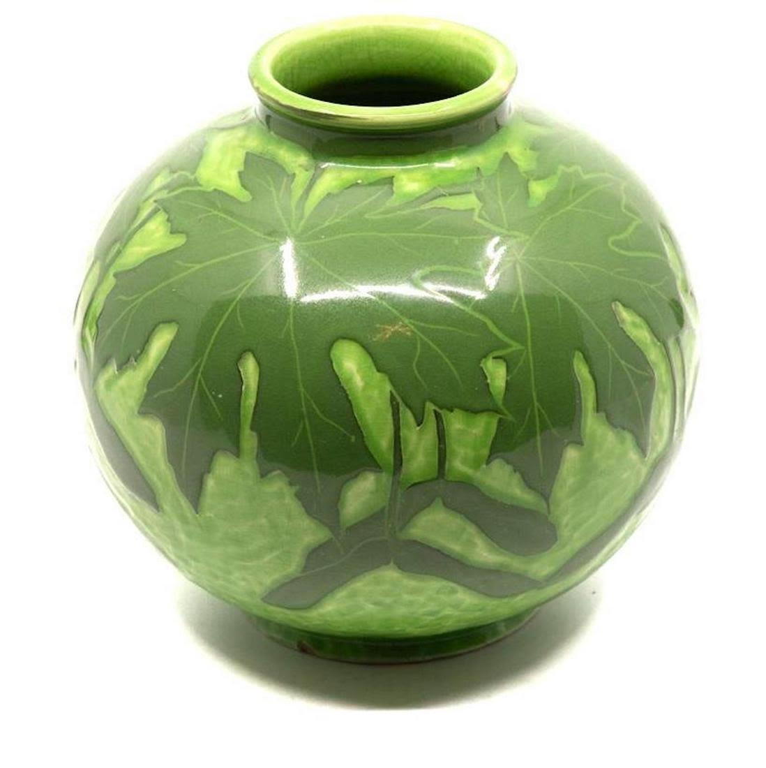 rare Gustavsberg sgraffito art nouveau green on green cut back ceramic vase by attributed to Josef Eckberg circa 1900. with maple leaf design vase circa 1900 approx 6"H and a 6"Diameter. (good condition w very very minor chip to base)
