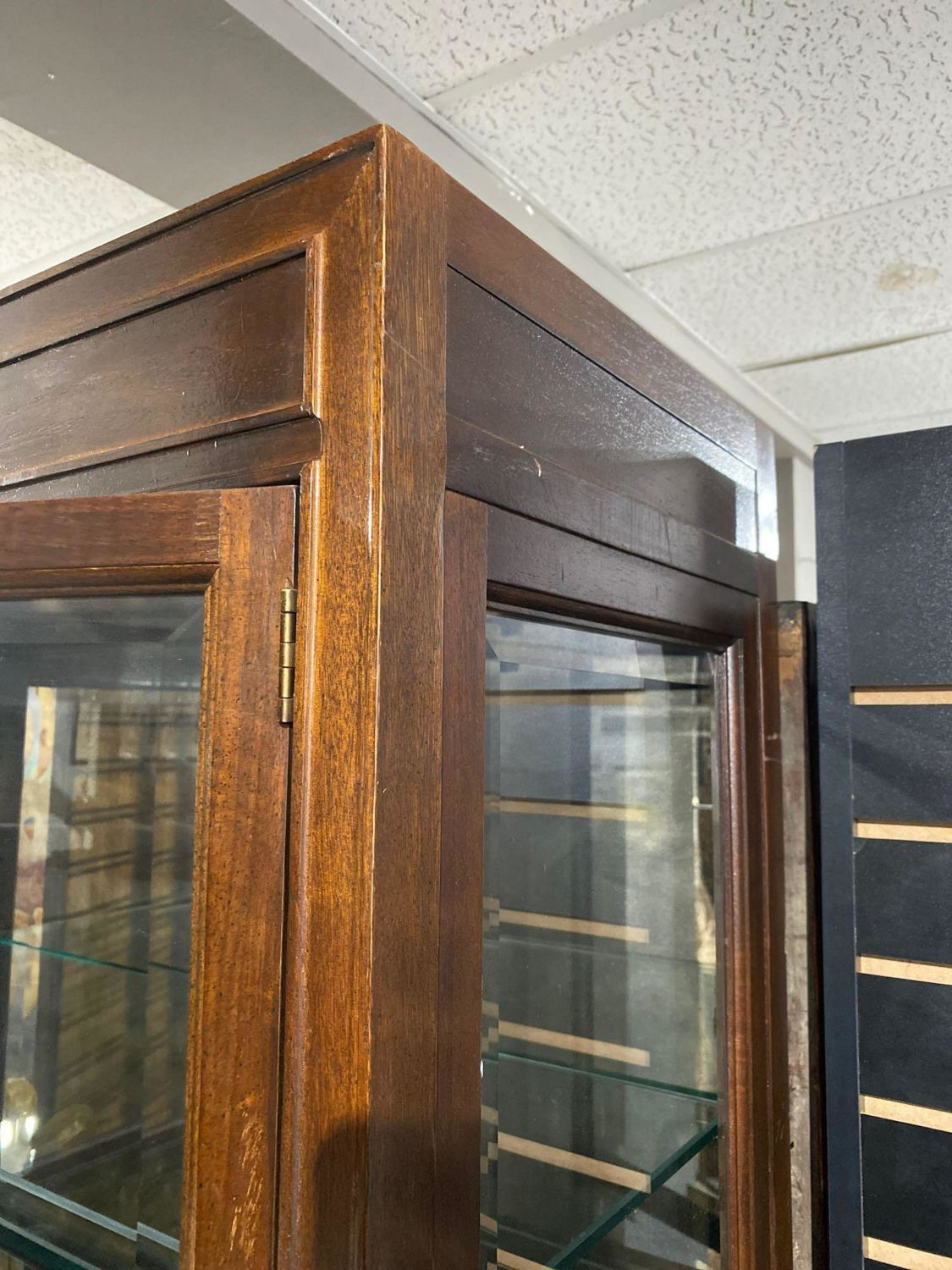Mid century beveled glass walnut vitrine display case. This is a very finely made cabinet fitted for lighting up. 36wide x 81 ht x 16 deep overall in good condition