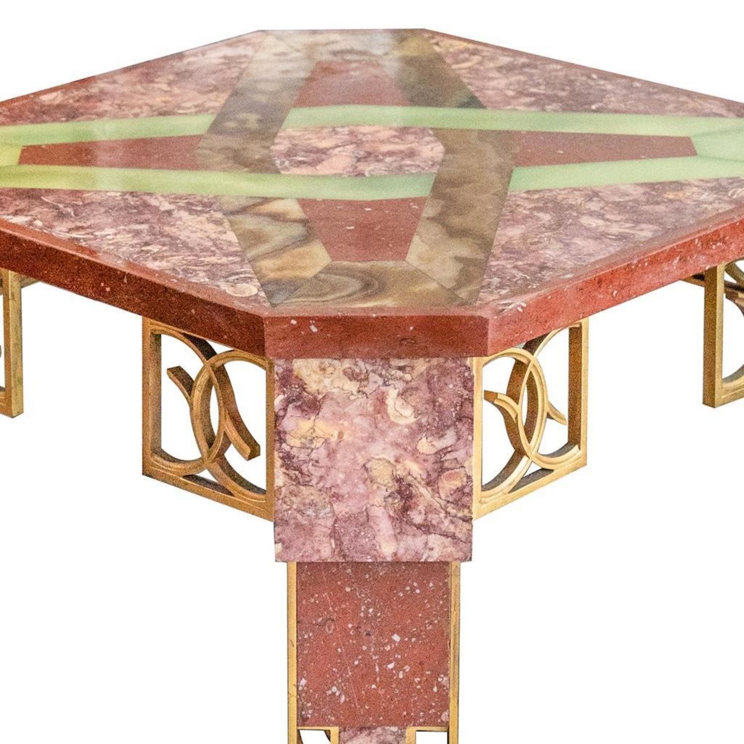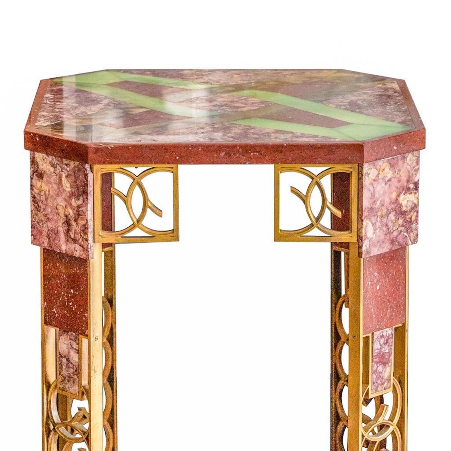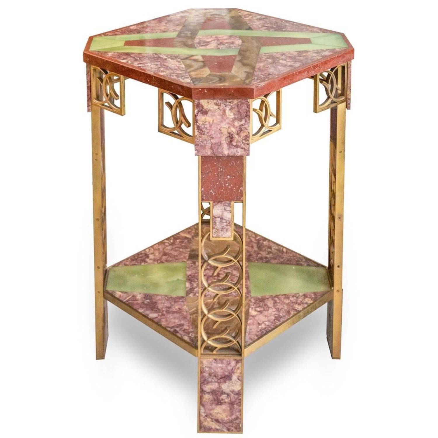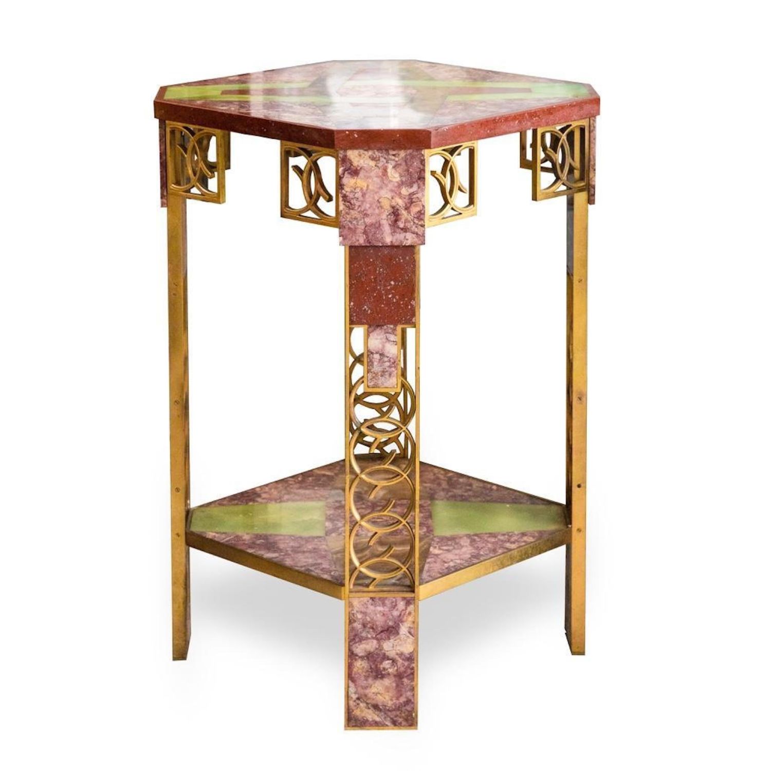 Great..The Chrysler Art Deco Marble, Inlaid Onyx, and Gilt-bronze Side Table from the Collection of Walter P. Chrysler, Jr., France, c. 1930, the square marble top with cut corners inset in onyx with a pattern of interlocking devices, raised on angled legs composed of rouge marbles interspersed by pierced gilt-bronze circles with conforming brackets and centering a lower marble shelf inset with onyx panels, ht. 31 3/8, wd. 20 1/2". Provenance: Sotheby’s, The Estate of Walter P. Chrysler, Jr., Important Art Nouveau and Art Deco, New York, June 16, 1989. overall good condition