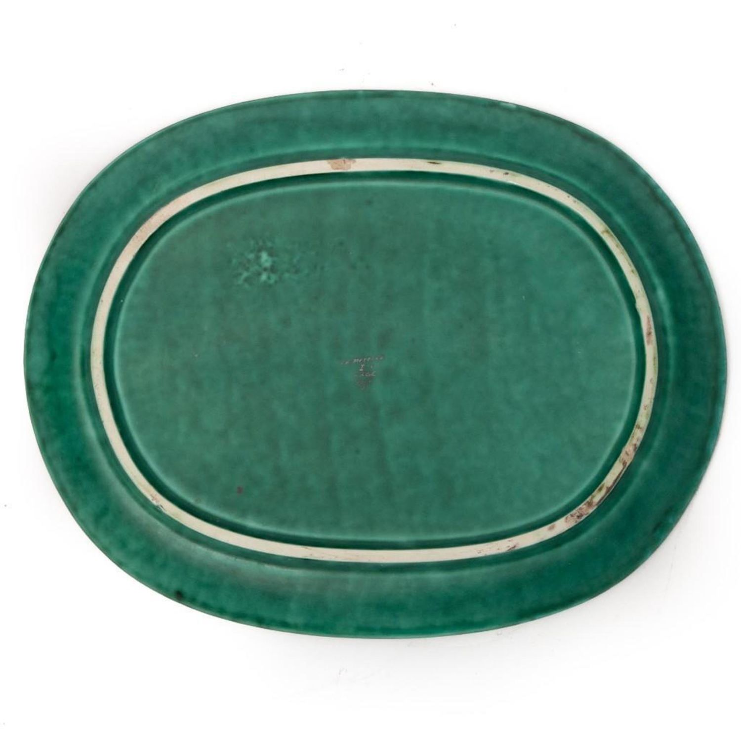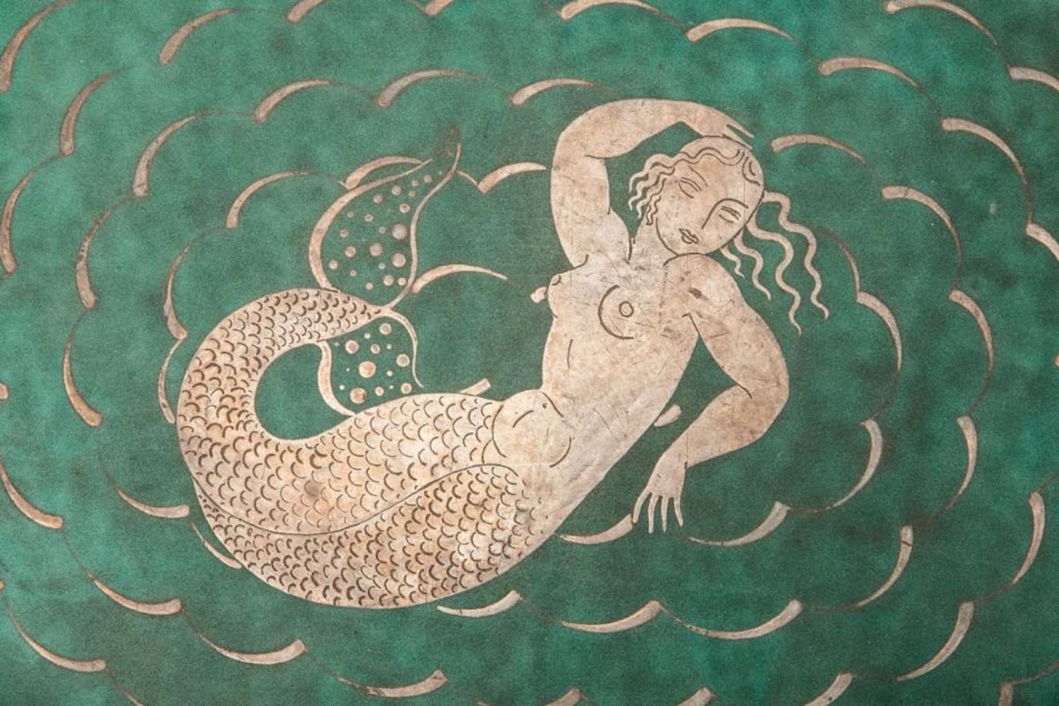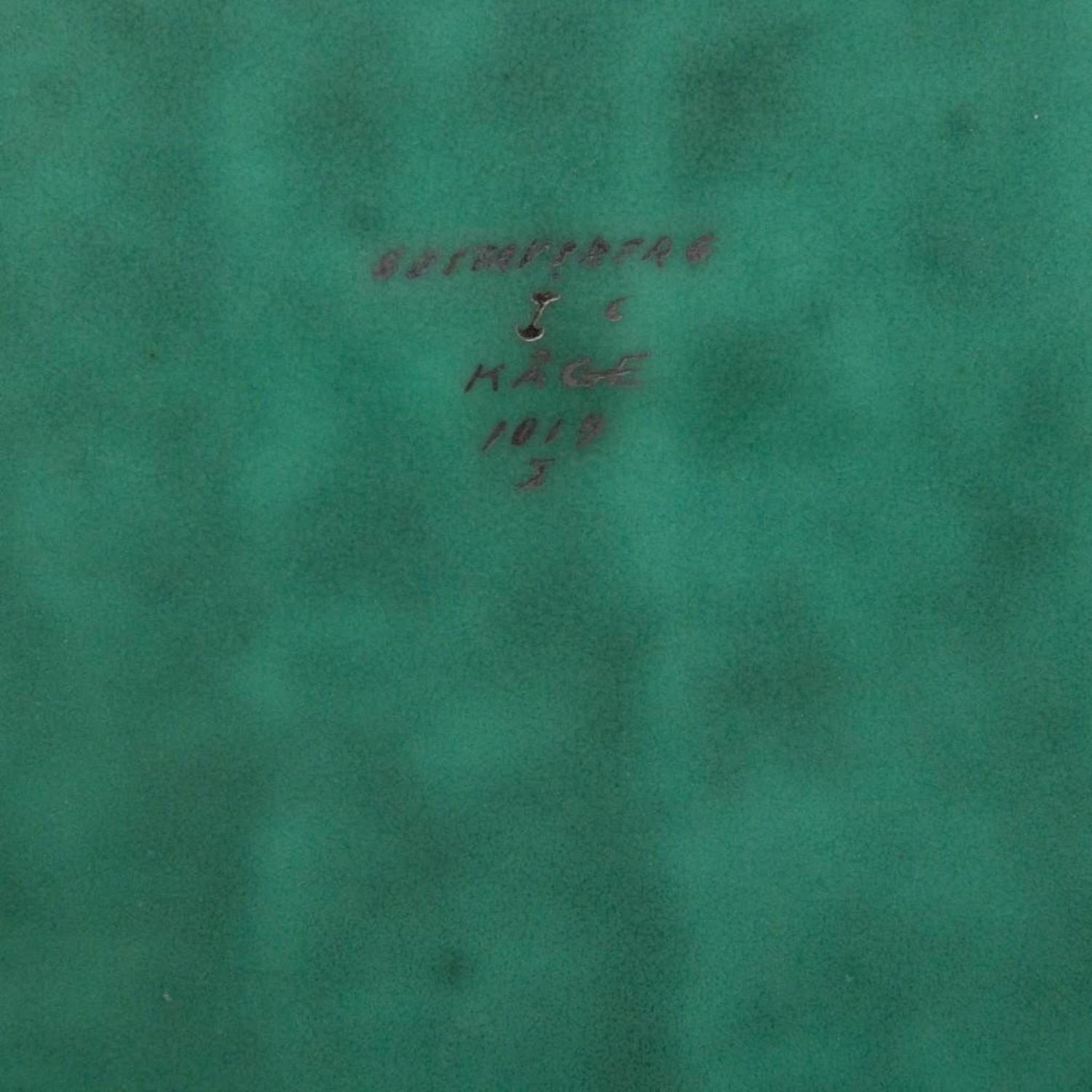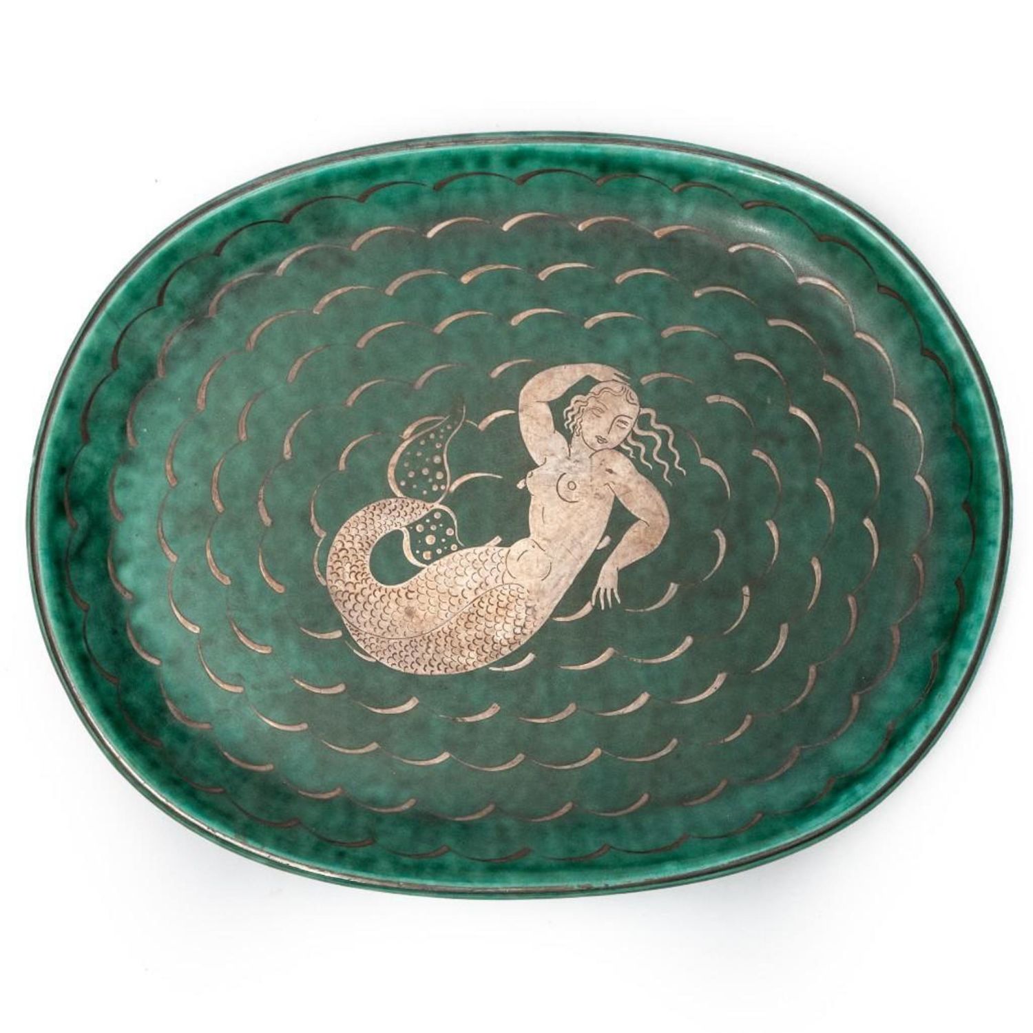 Gustavsberg kage signed argenta plate with silver inlay of a mermaid and water circa 1935. The Argenta designs at Gustavsberg date to the 1930’s and were created under the direction of Wilhelm Kage. In 1930, Kåge exhibited his Argenta Series at the Stockholm Exhibition.The Argenta works were immediately successful and became highly collectable. Kåge’s work can be found in the National Museum and the Royal Library in Stockholm, the Industrial Art museums in Oslo, Copenhagen, Vienna, Budapest and Prague, and at the Metropolitan Museum in New York . Notably, he was awarded the Prince Eugen Medal in 1949. The plate is in good condition and measures approximately 13.5"L x 10.5"W good condition