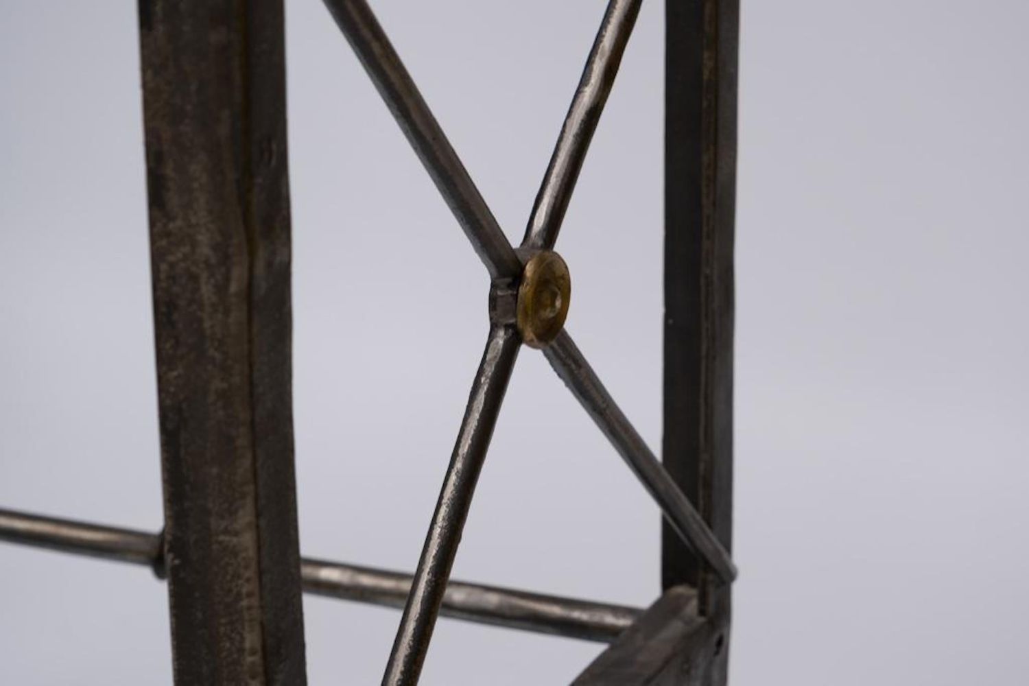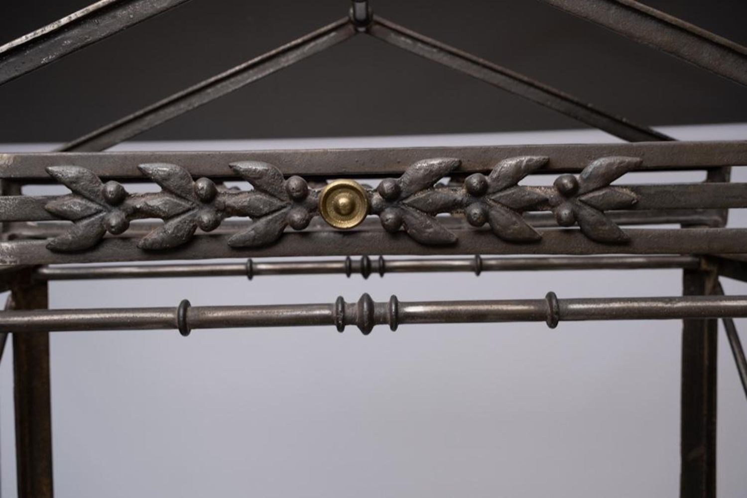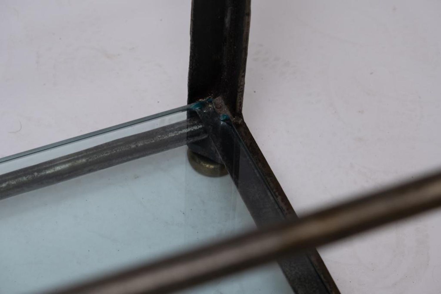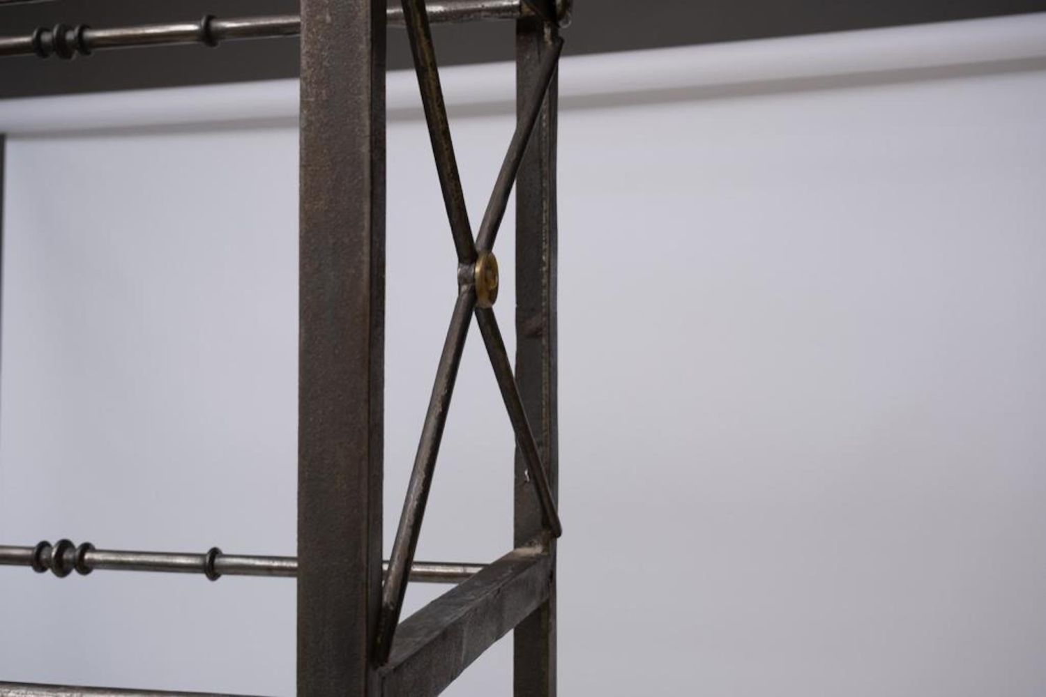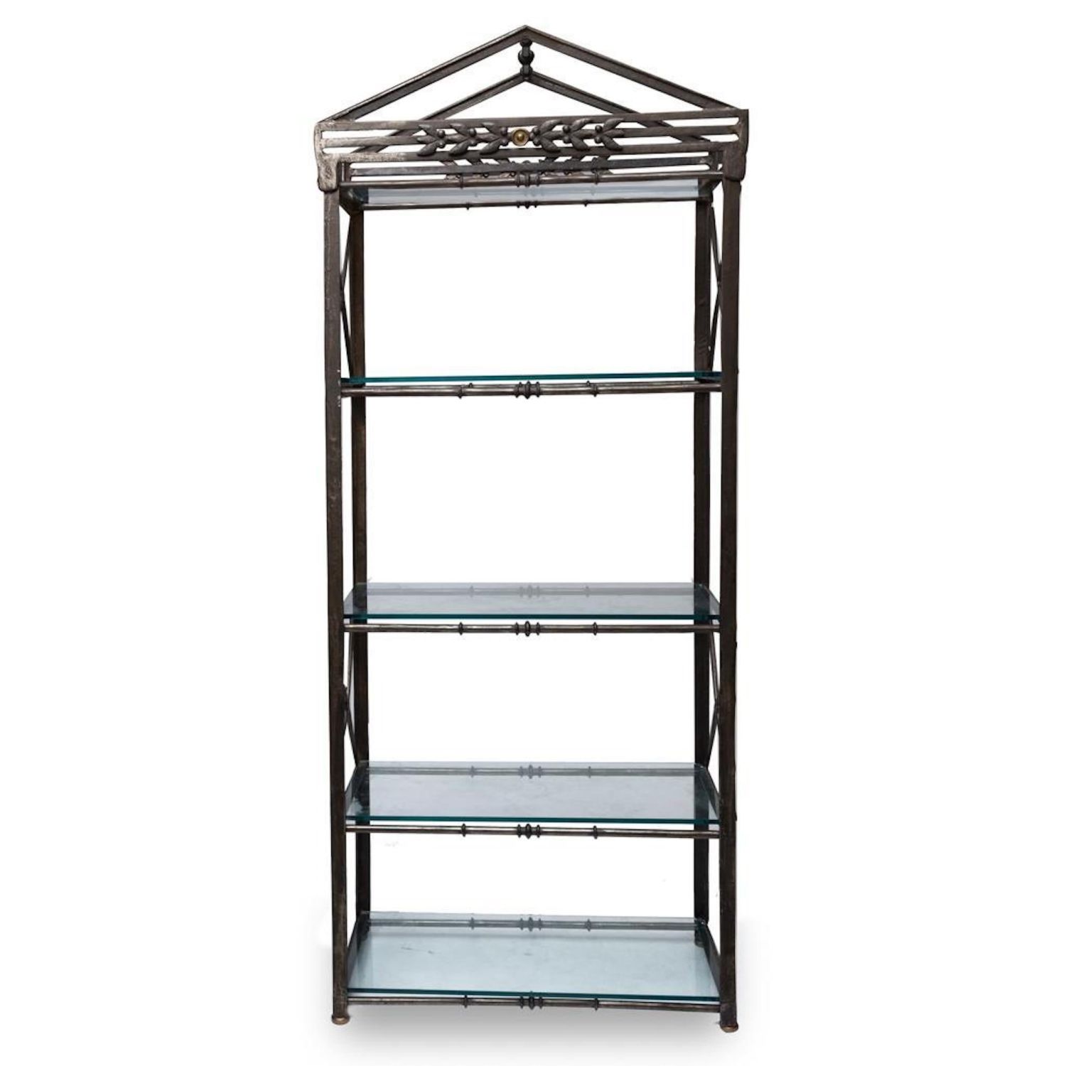 iron and Steel Etagere, late 20th century, with five glass shelves, cast brass accents and feet, unmarked. Measures 93"H x 37.75"W x 17.75"D. Some Glass has chips on corners and edges but they are not visible when shelves are installed overall good condition