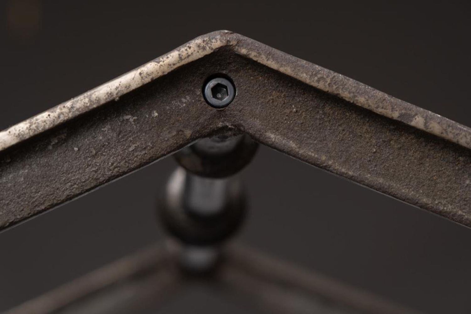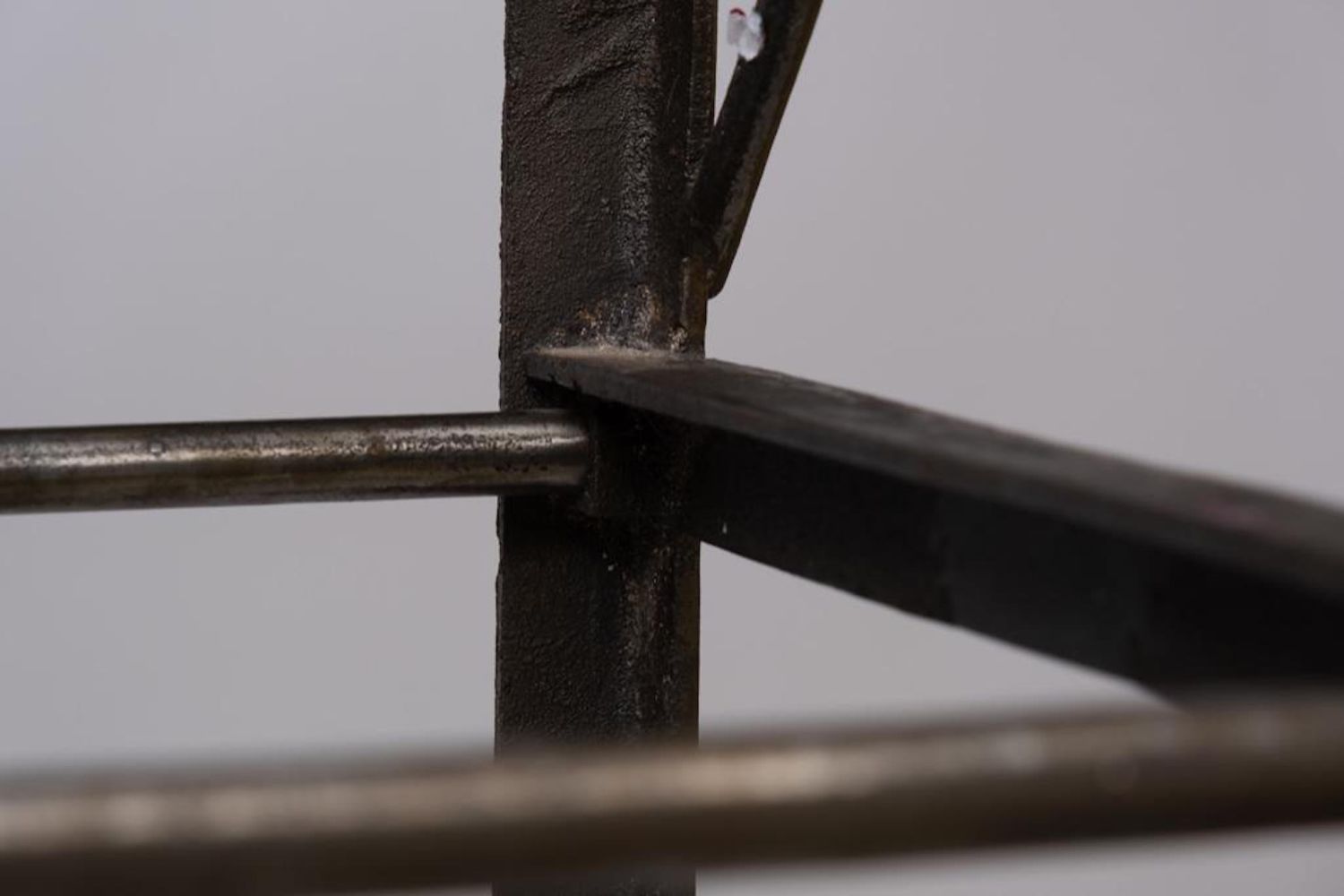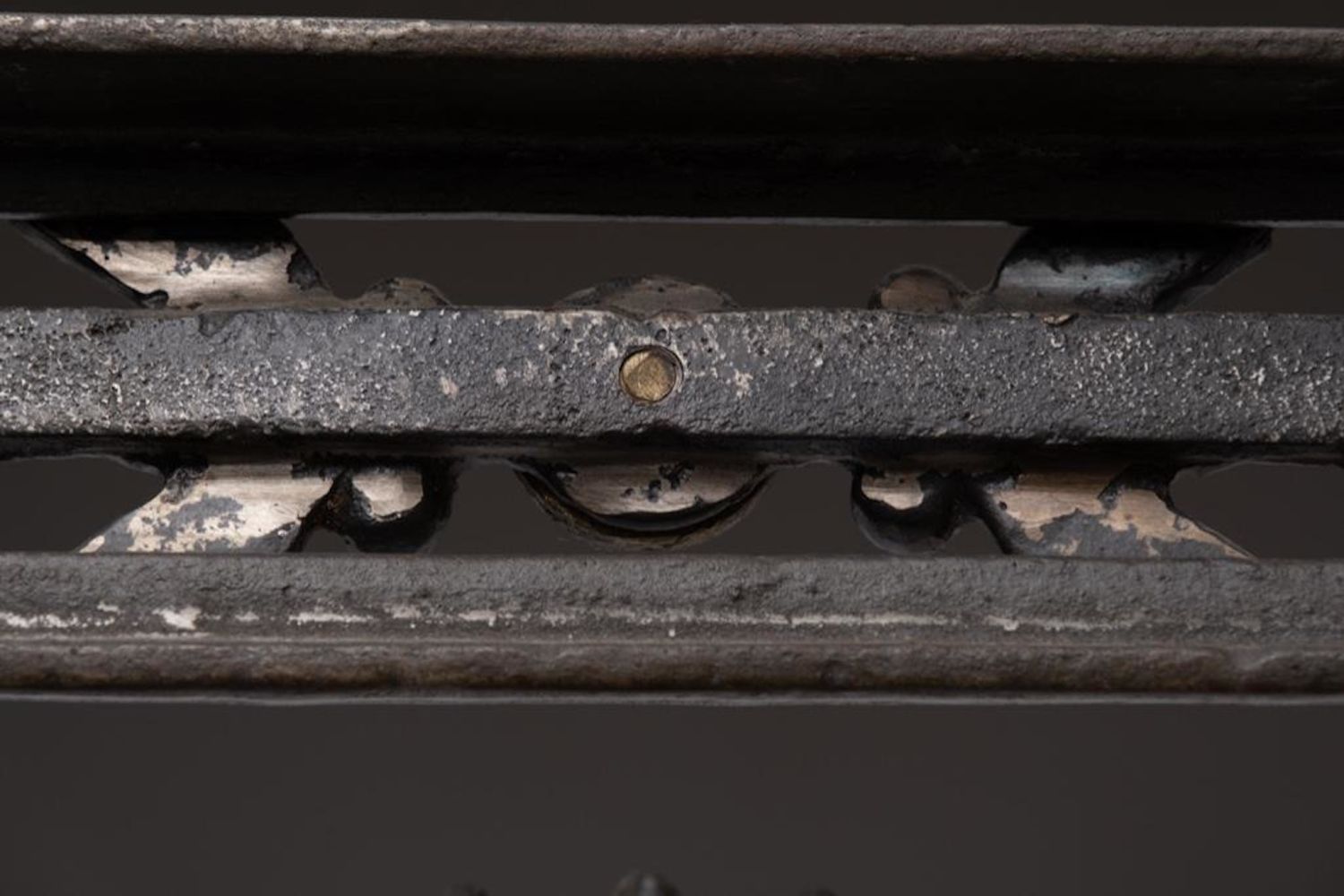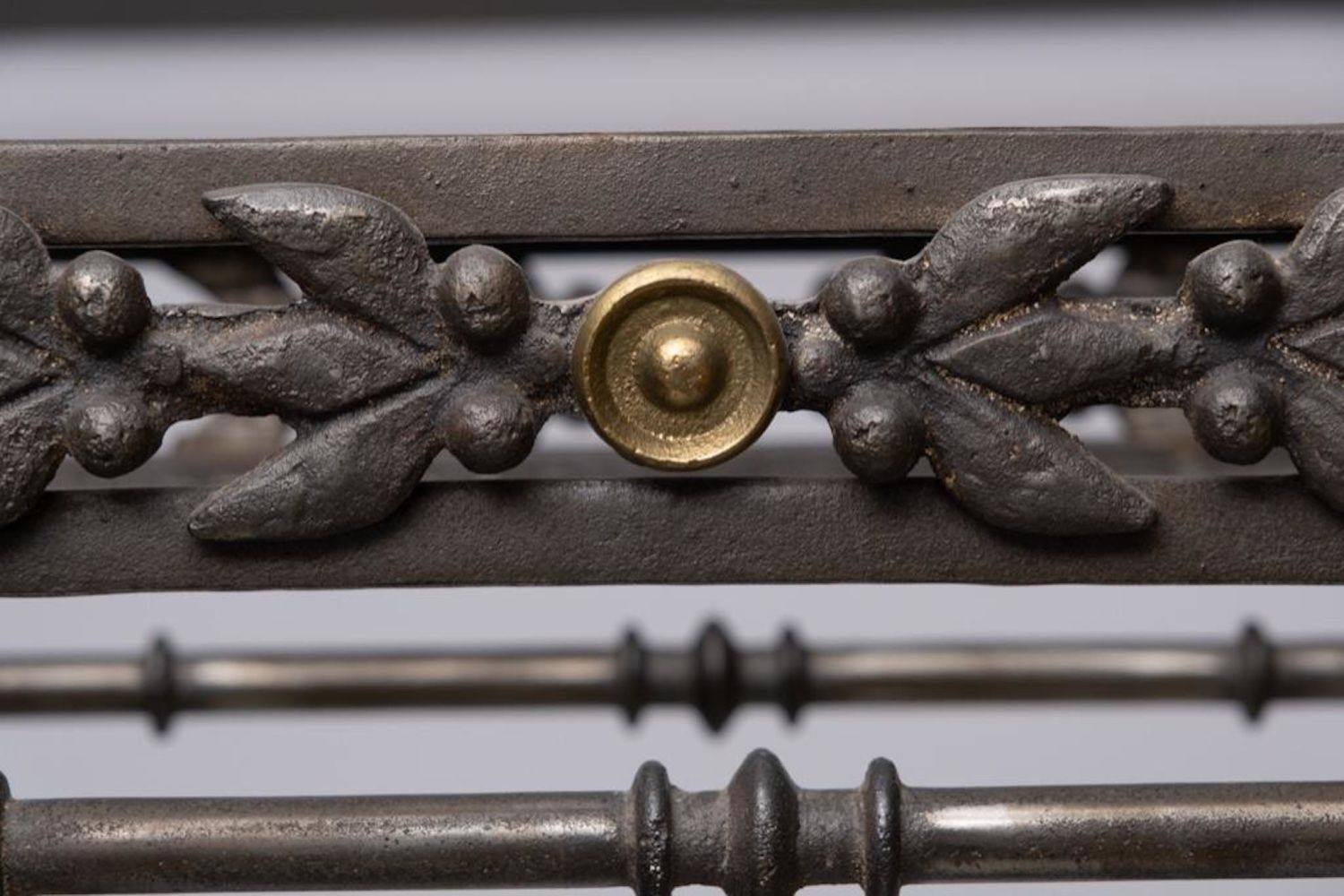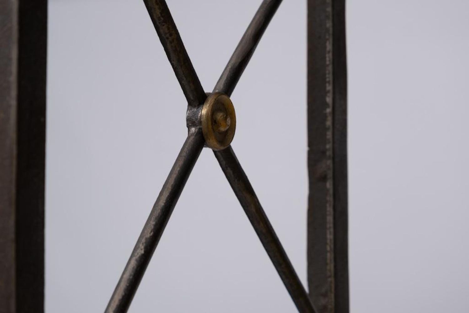 iron and Steel Etagere, late 20th century, with five glass shelves, cast brass accents and feet, unmarked. Measures 93"H x 37.75"W x 17.75"D. Some Glass has chips on corners and edges but they are not visible when shelves are installed overall good condition