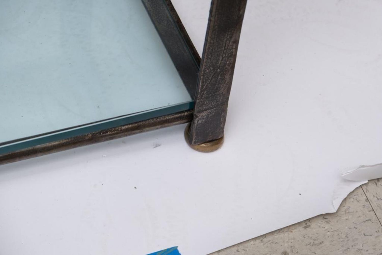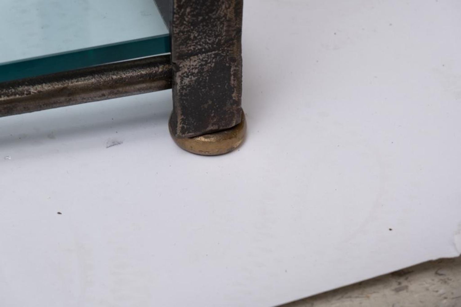 Cast iron Steel Etagere, late 20th century, with five glass shelves, cast brass accents and feet, unmarked. Measures 93"H x 37.75"W x 17.75"D. Some Glass has chips on corners edges but they are not visible when shelves are installed and in place, overall good condition. Please note that the foot on the bottom right front is broken! The screw snapped with it.