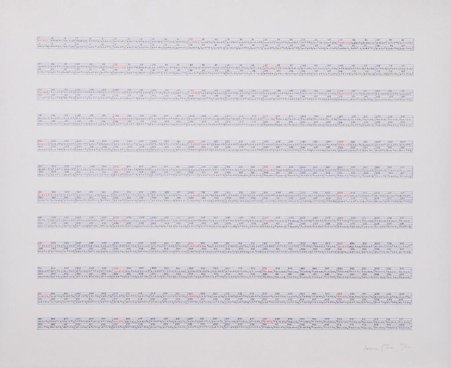 Laura Grisi lithograph pencil signed and numbered 48/60. Born in Rhodes, Greece, Grisi mostly spent her time in Rome and New York. She studied art in Rome and at the Ecole des Beaux Arts in Paris. Grisi had her first solo shows at the Galleria Il Segno in Rome in 1964 and the Galleria dell’Ariete in Milan in 1965. Since 1968, Grisi had solo shows at the Galerie M. E. Thelen in Essen, Leo Castelli Gallery in New York, Van Abbemuseum in Eindhoven, Galerie Konrad Fischer in Düsserdorf, and Ugo Ferranti in Rome, among others. She participated in the Rome Quadriennale in 1965, 1973, and 1986; the Venice Biennale in 1966 and 1986; and the group show “Young Italians” at the Institute of Contemporary Art, Boston, and the Jewish Museum in New York in 1968. Her works are included in the collections of a number of institutions, including the Museum of Modern Art in New York, the Brooklyn Museum, the Weisman Museum in Los Angeles, and the Galleria Civica d’Arte Moderna in Turin. Her work was exhibited at the Graham Foundation in Chicago in 2014 and the Accademia di Brera in Milan in 2015. In October 2017, she had started to collaborate with P420, Bologna, which presented her works in a solo show in Frieze Masters, London. In 2018, her works will be included in the show “Matrix for Actual Time, ” curated by Jacopo Crivelli Visconti, at the São Paulo Museum of Art. Measures 19 1/2 x 24