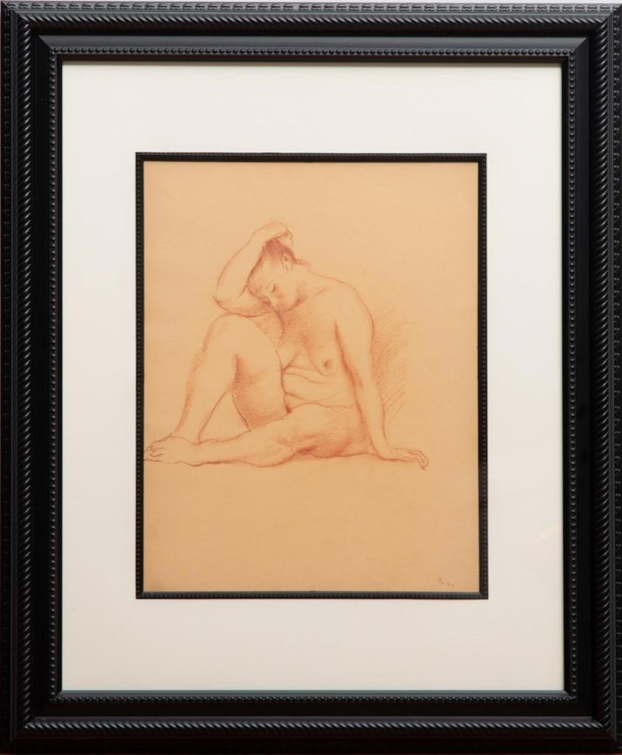 John Fenton drawing on paper drawing of a nude woman sitting. Signed bottom right. Measures 23 3/4"w x 19.5"H: Visible 13 3/8 x 10 3/8" Approx. Painter, printmaker and teacher John Fenton was born in Mountaindale, New York. He moved with his family to Mount Vernon, New York, where he lived for some thirty years before settling permanently in Woodstock, New York. He attended The Art Student’s League of New York and Atelier 17, Paris. His work was the focus of a number of one-man shows during the 1950s and 1960s, and was exhibited in numerous museums and galleries including the Art Institute of Chicago, The Museum of Modern Art in New York, The Corcoran Gallery in Washington, D.C. And the Pennsylvania Academy.Fenton taught at New York University and Goddard College. His distinctly surrealist work won awards from the American Academy of Arts and Letters, the National Academy of Design, and numerous other institutions, and is included in the collections of the Smithsonian American Art Museum, the Corcoran Gallery among others. He died at Woodstock, New York.